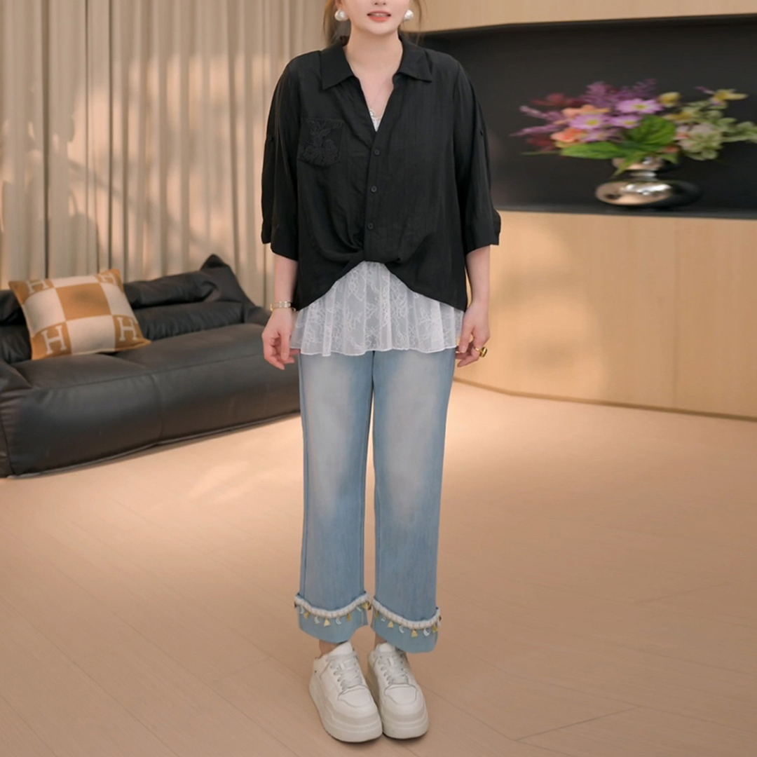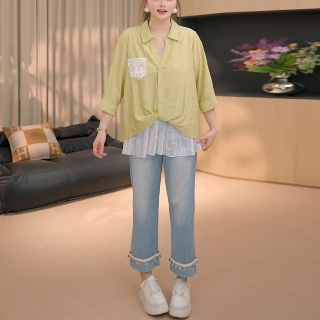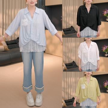 BY15566# 假两件衬衫上衣女夏季新款设计感蕾丝拼接上衣女 服裝批發女裝批發服飾貨源