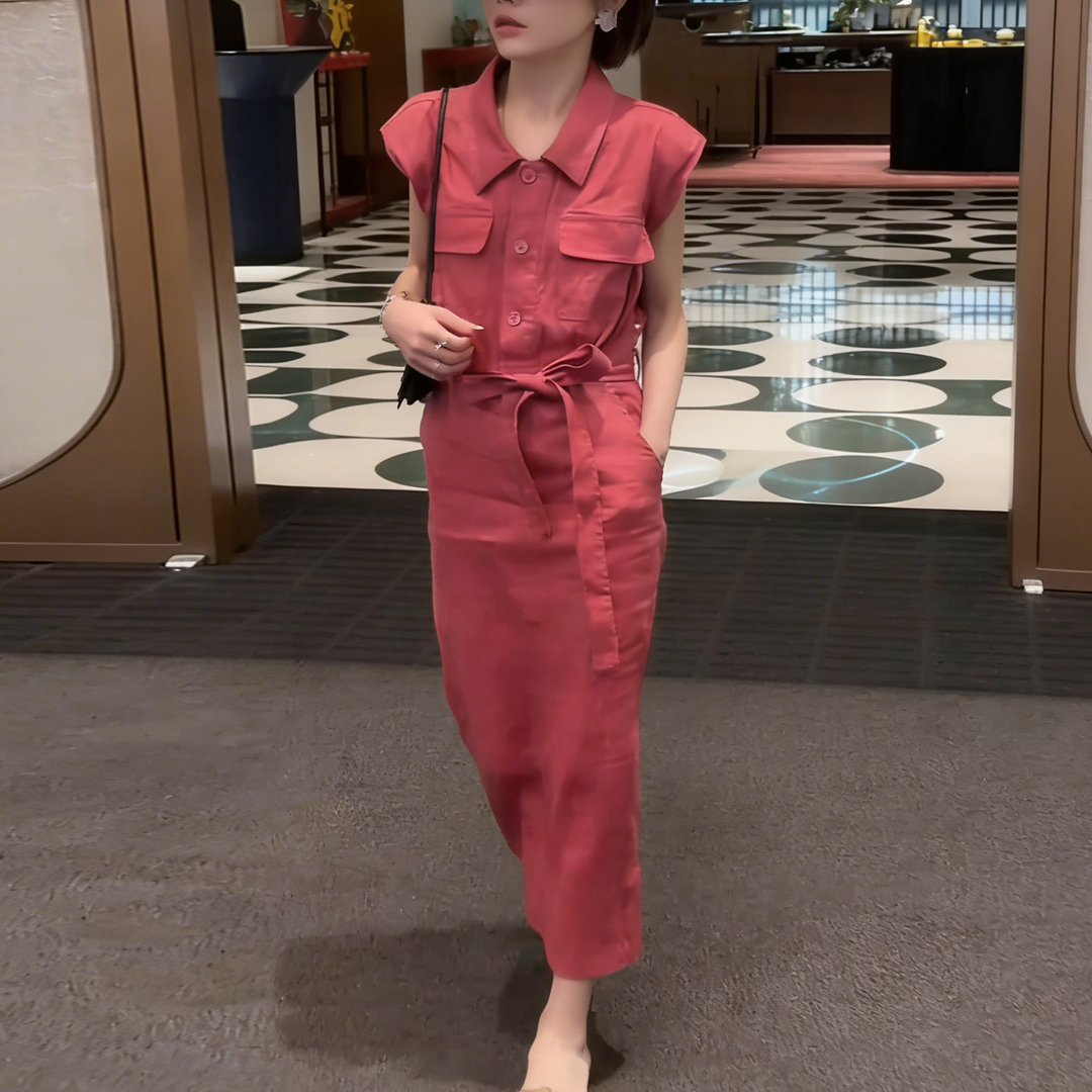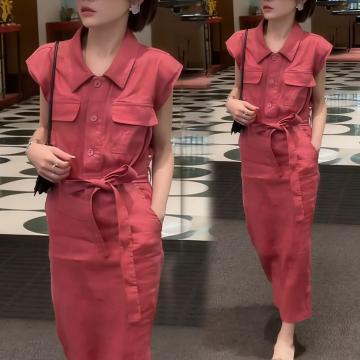 BY15567# 夏季新款度假通勤高智风亚麻开叉收腰显瘦衬衫连衣裙女 服裝批發女裝批發服飾貨源