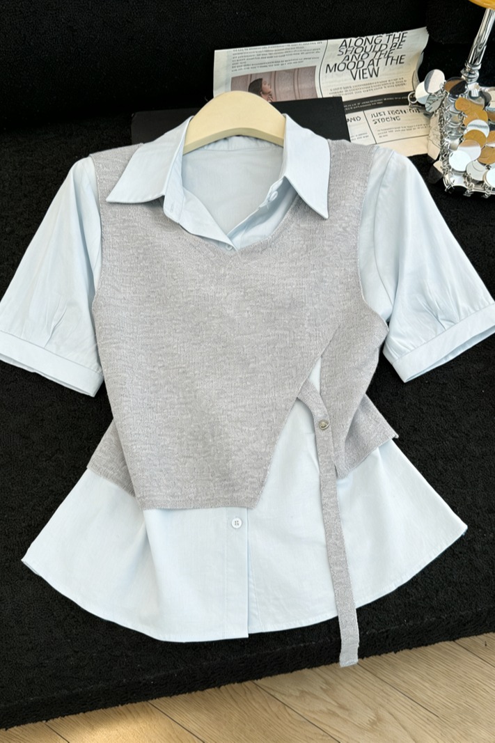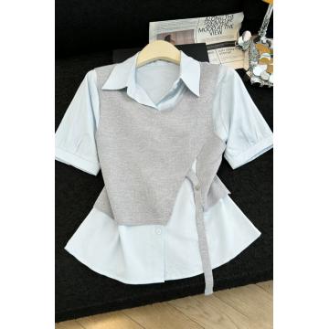 BY15575# 学院风休闲减龄针织拼接假两件衬衫女宽松设计感短袖百搭上衣 服裝批發女裝批發服飾貨源