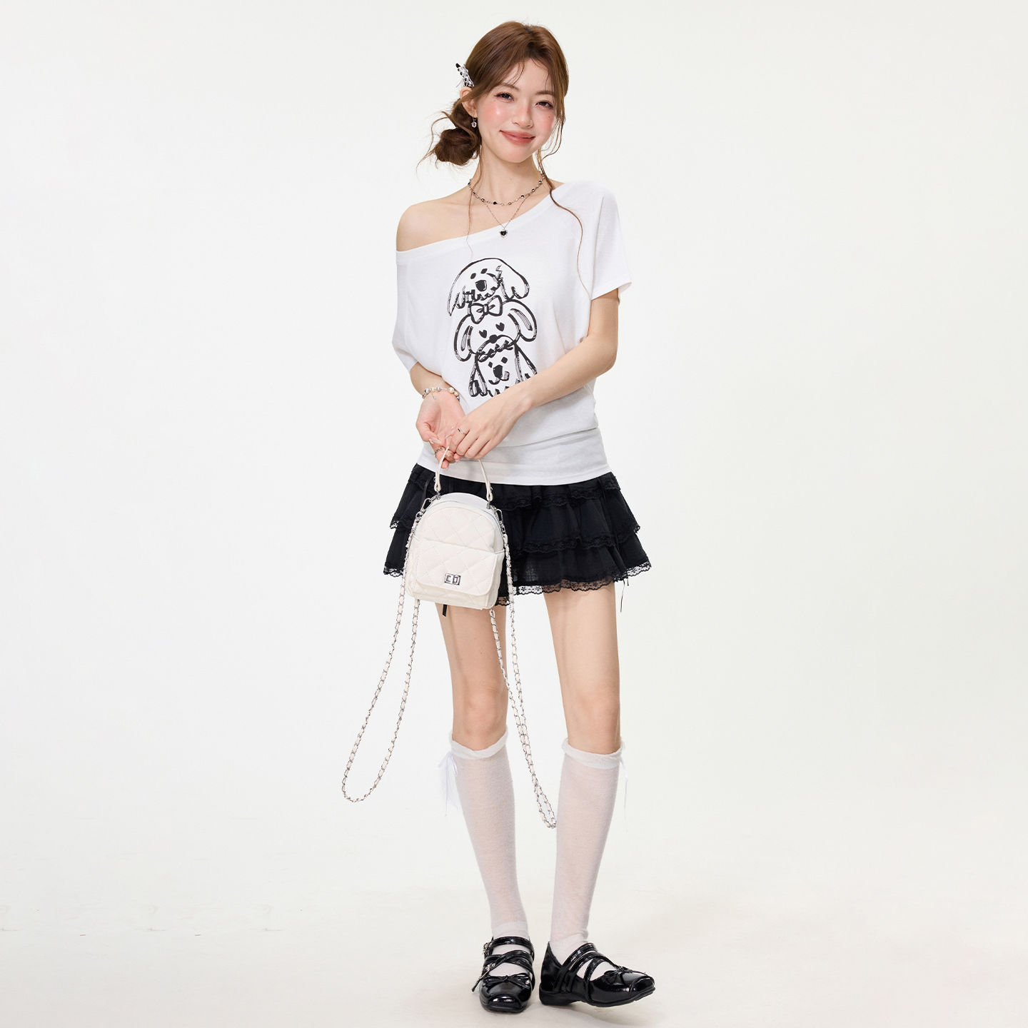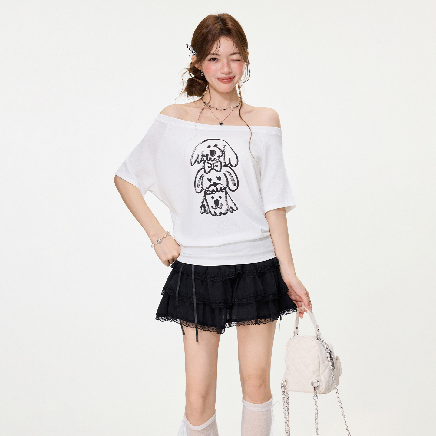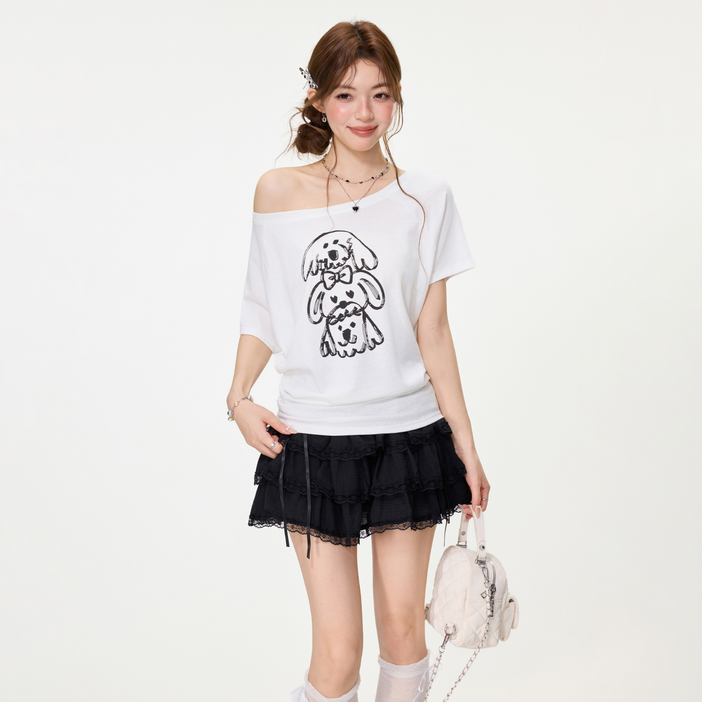 BY15587# 甜辣妹小狗印花短袖T恤女春夏设计感宽松慵懒大圆领上衣 服裝批發女裝批發服飾貨源