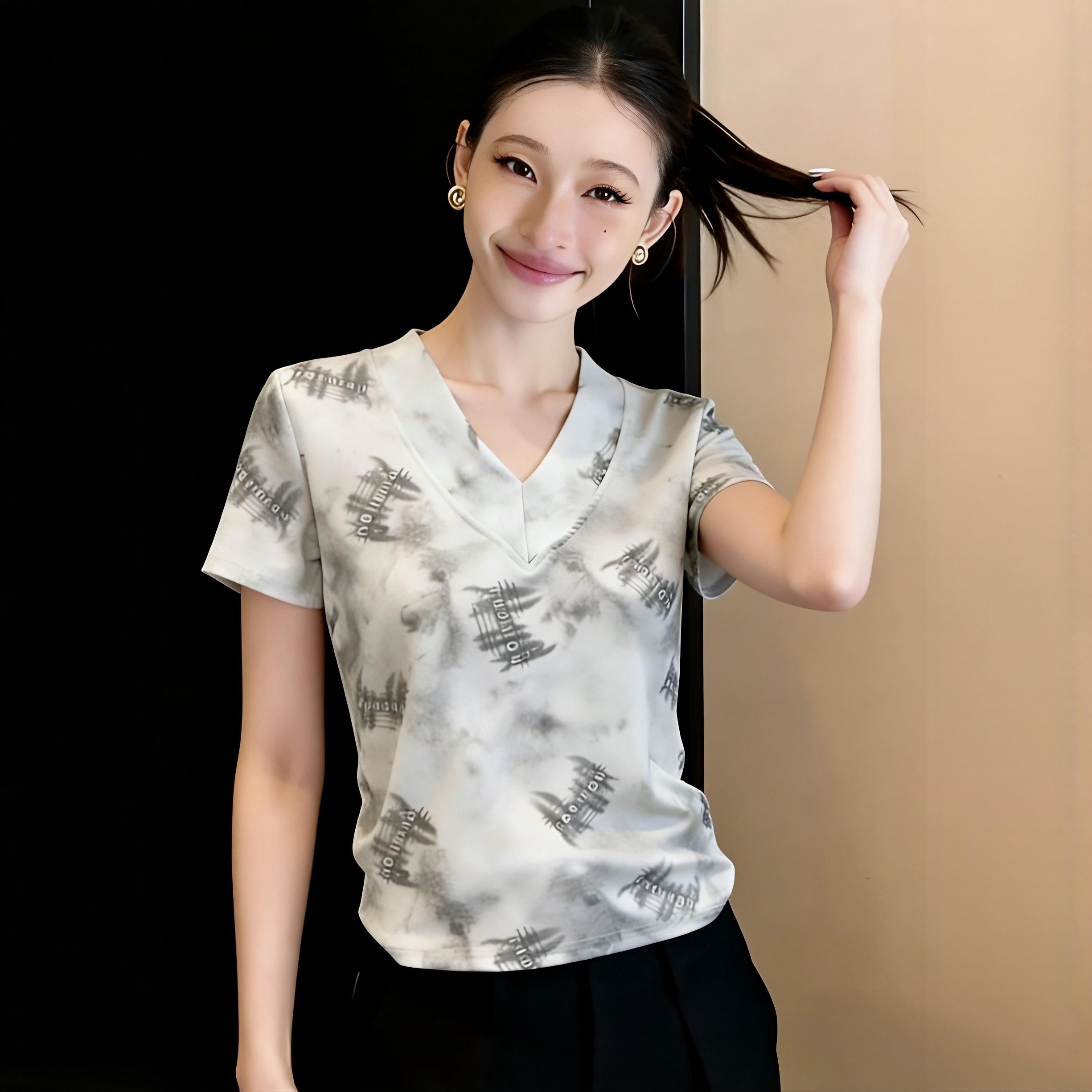 BY15645# 夏季新款V领复古扎染国风印花百搭显瘦短袖T恤上衣女 服裝批發女裝批發服飾貨源