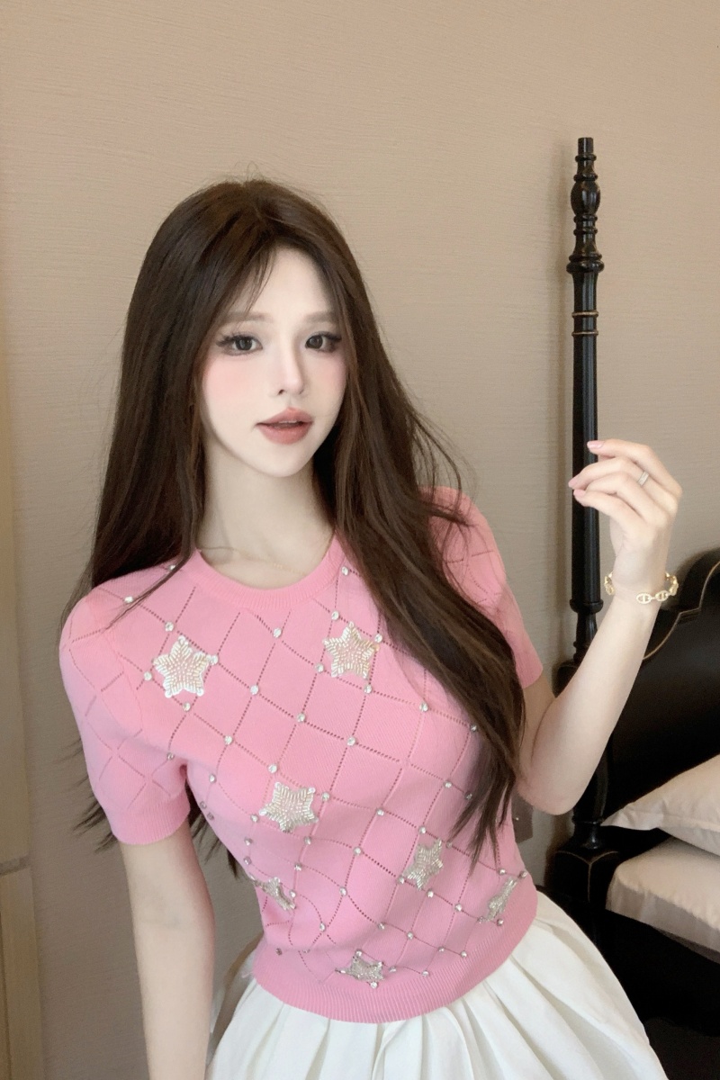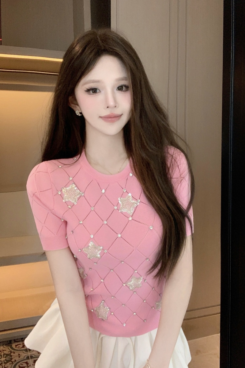 BY15657# 薄款短袖夏季镶钻设计感时尚潮流新款修身小个子百搭 服裝批發女裝批發服飾貨源