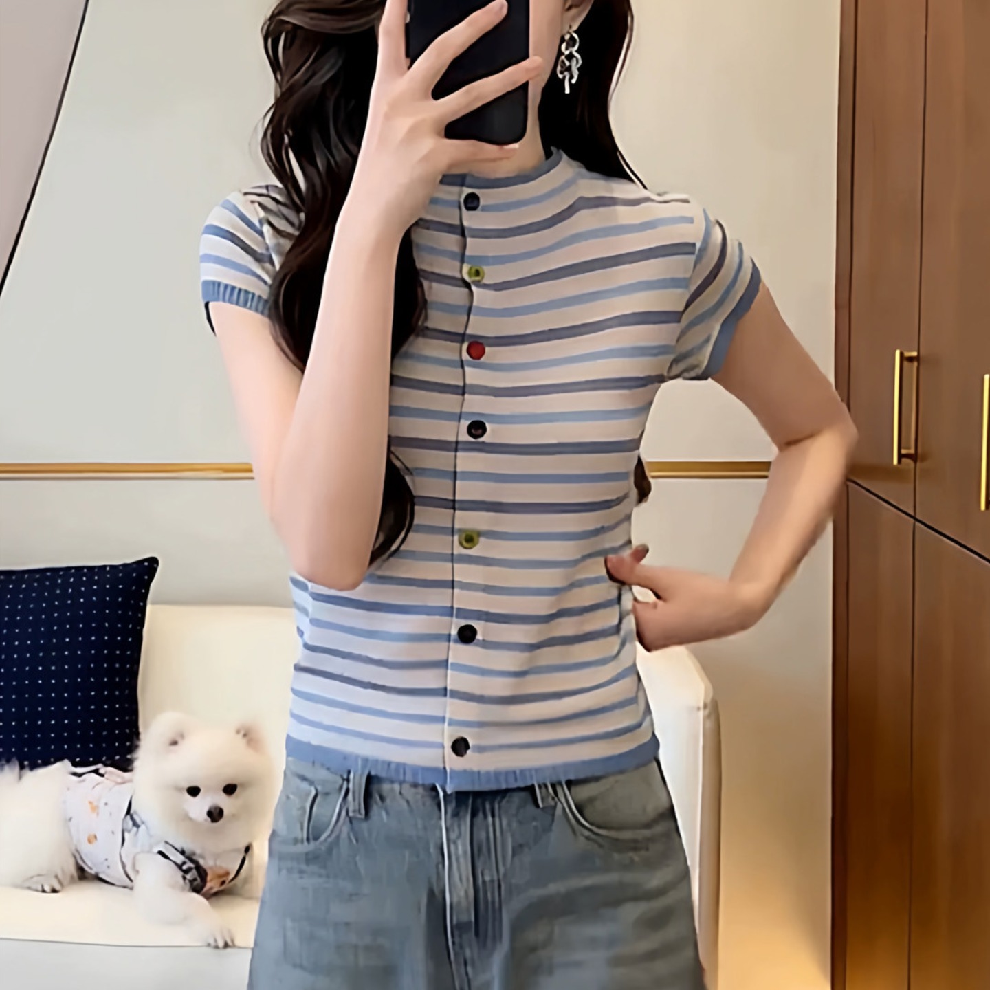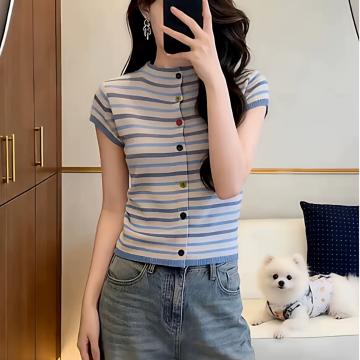 BY15728# 撞色条纹短袖t恤女新款夏季大码胖mm修身显瘦气质针织衫上衣 服裝批發女裝批發服飾貨源