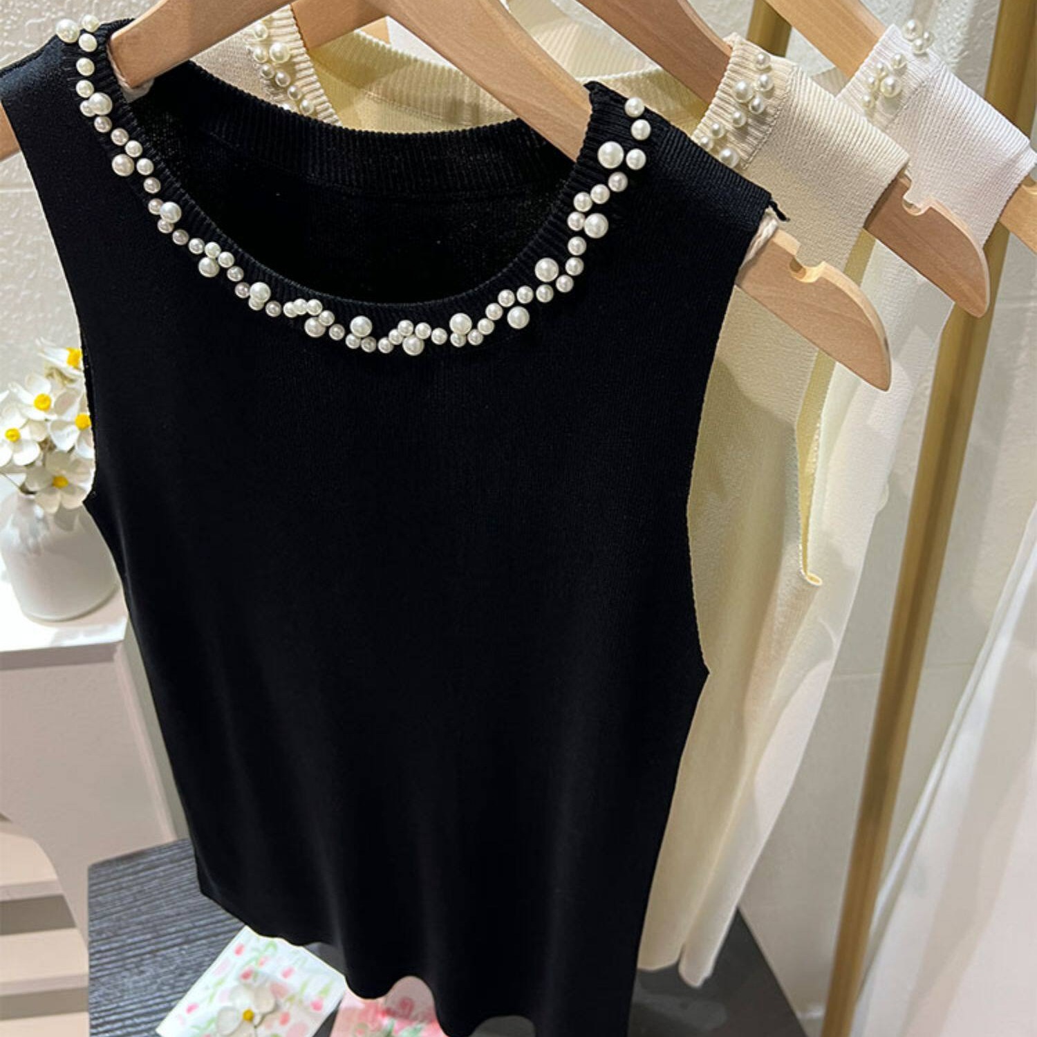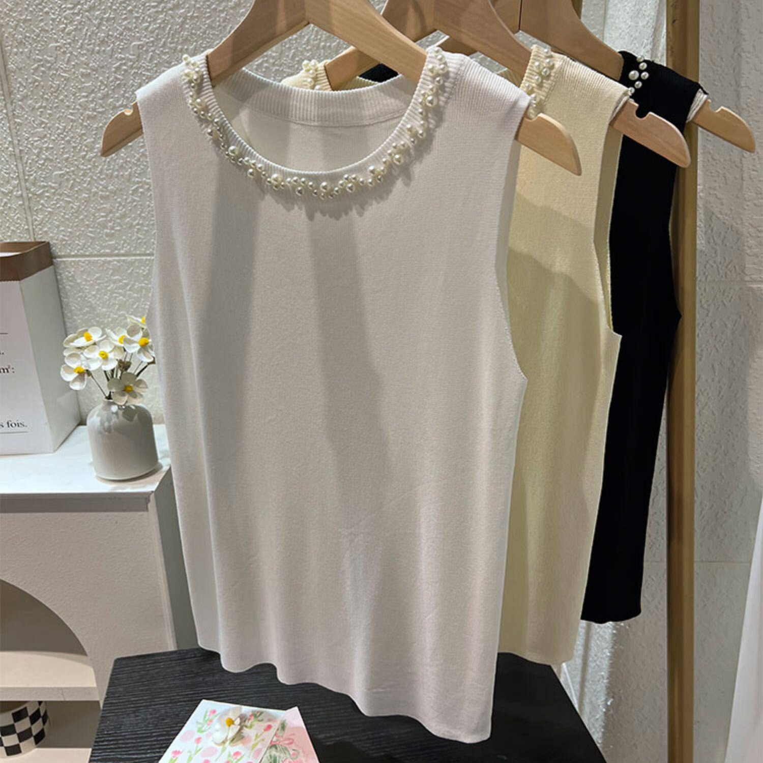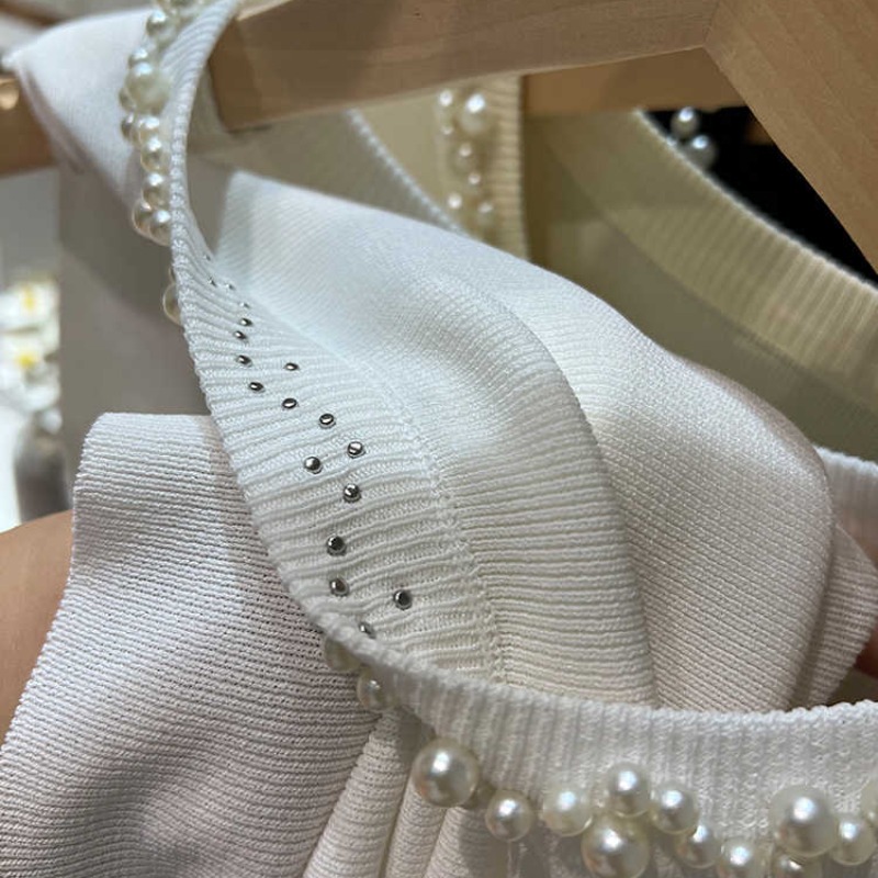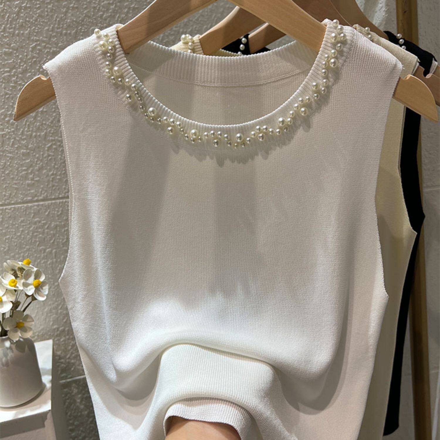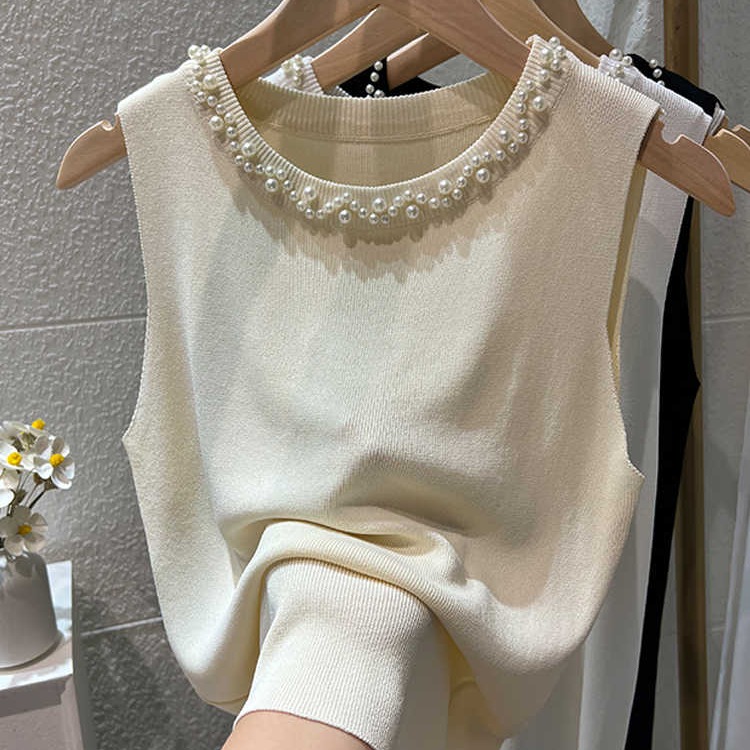 BY15736# 白色吊带背心女新款夏修身薄款冰丝针织钉珠装饰圆领无袖上衣 服裝批發女裝批發服飾貨源