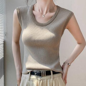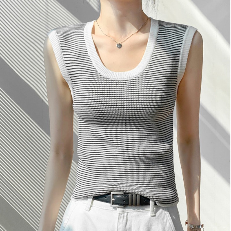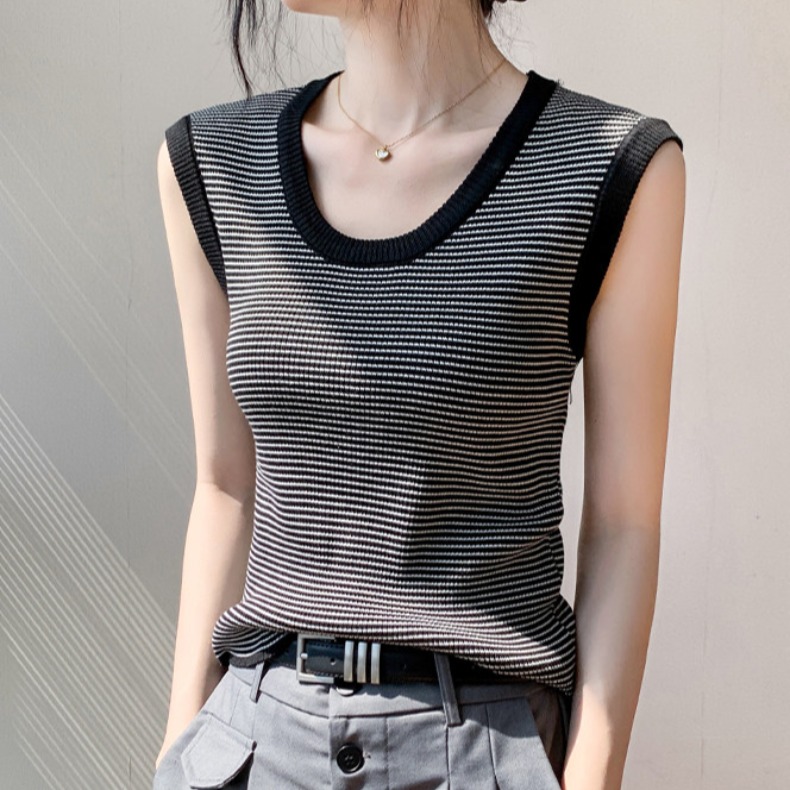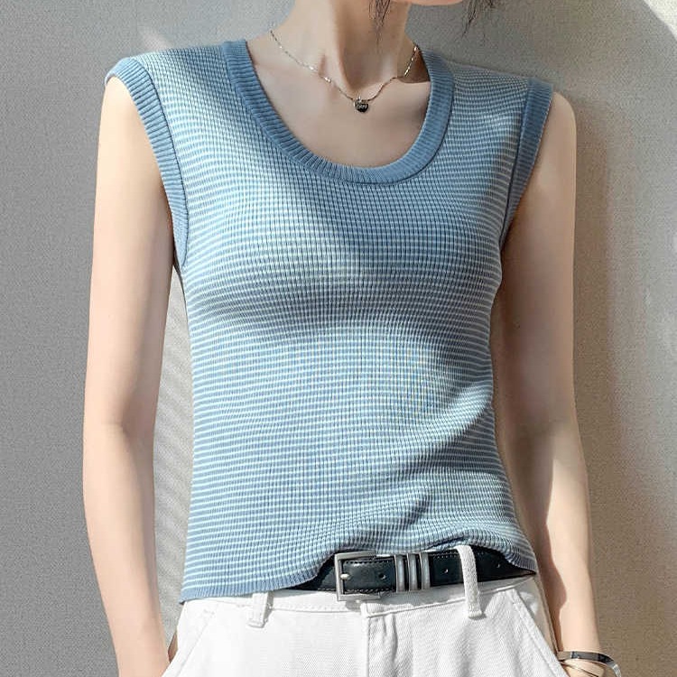 BY15741# 圆领条纹坎肩背心女夏季新款衬衫内搭修身显瘦百搭无袖上衣女 服裝批發女裝批發服飾貨源