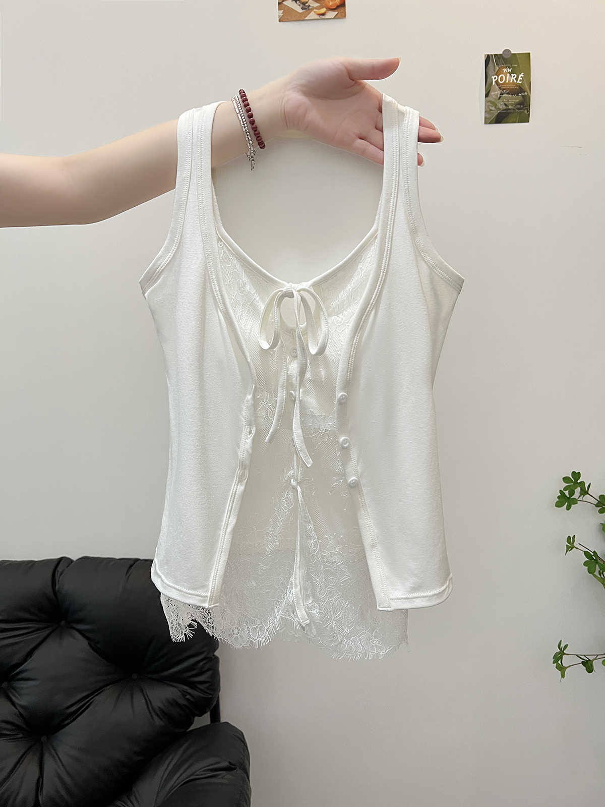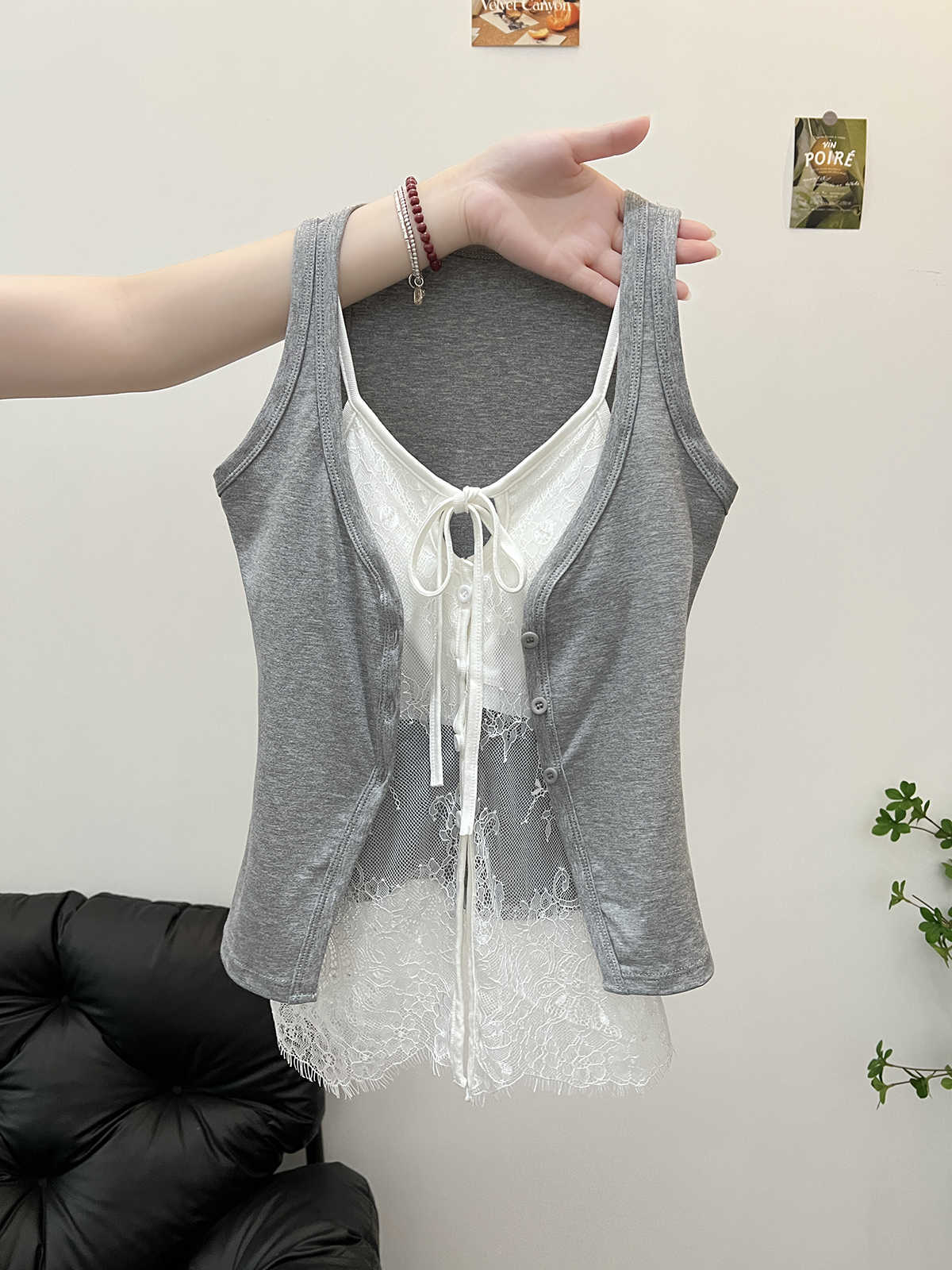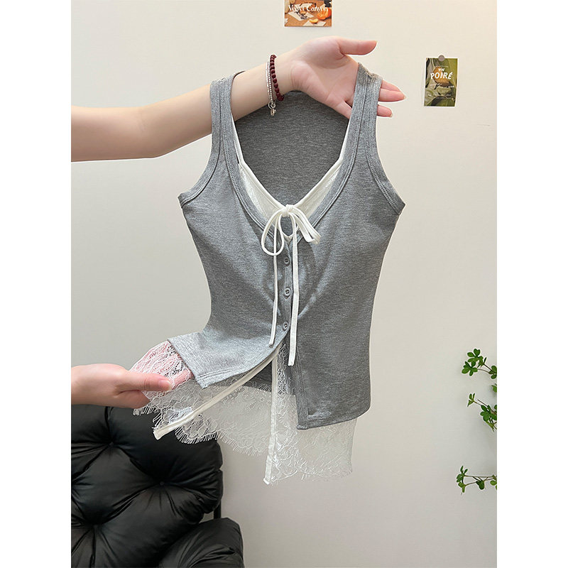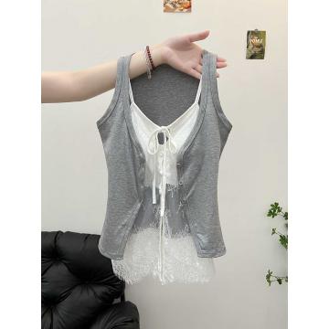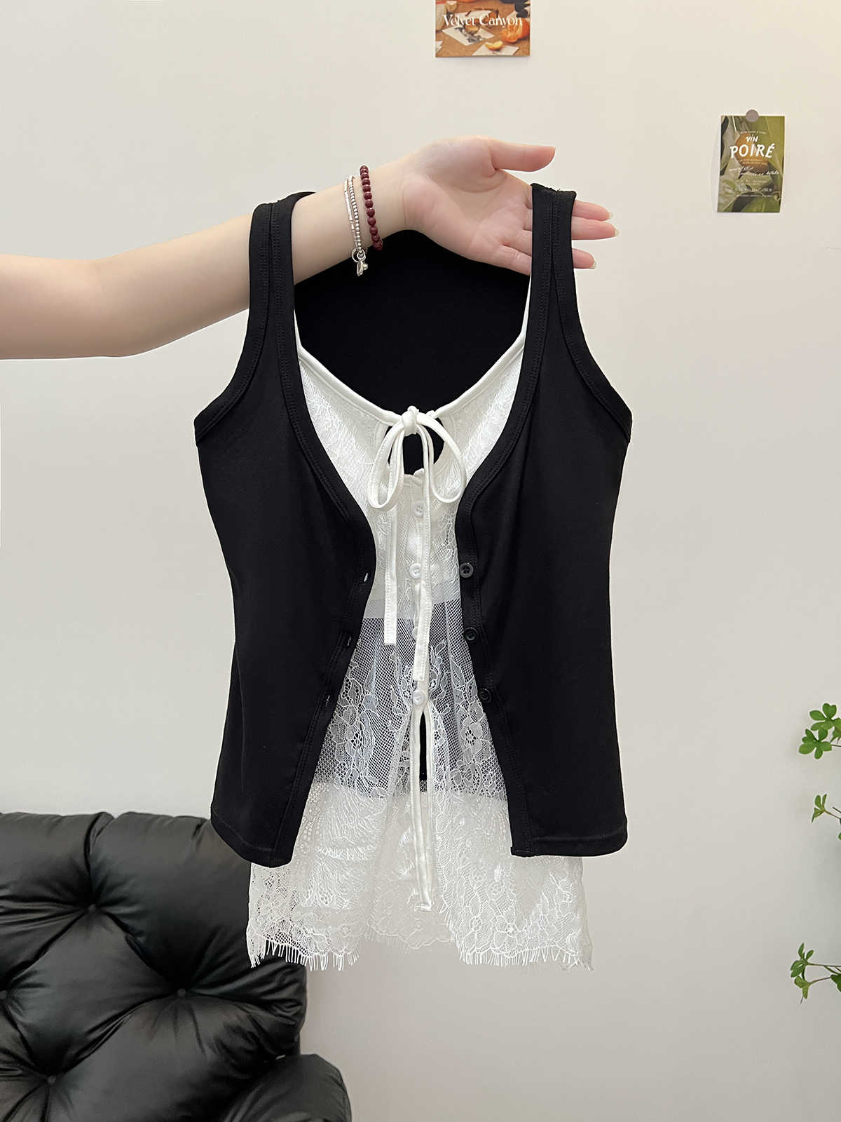 BY15747# 吊带背心女新款夏外穿黑色辣妹穿搭蕾丝假两件无袖上衣 服裝批發女裝批發服飾貨源