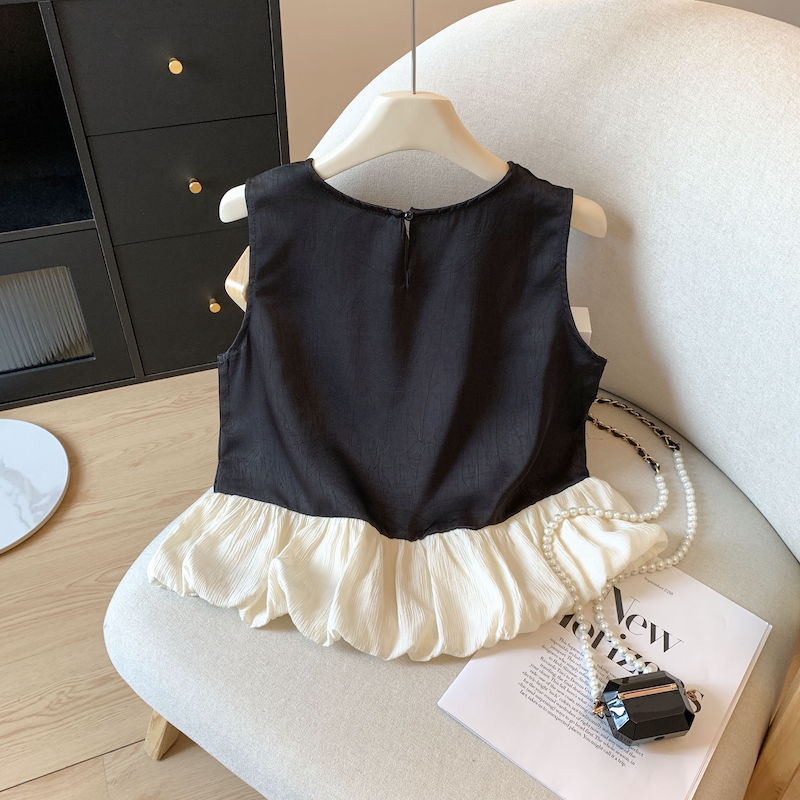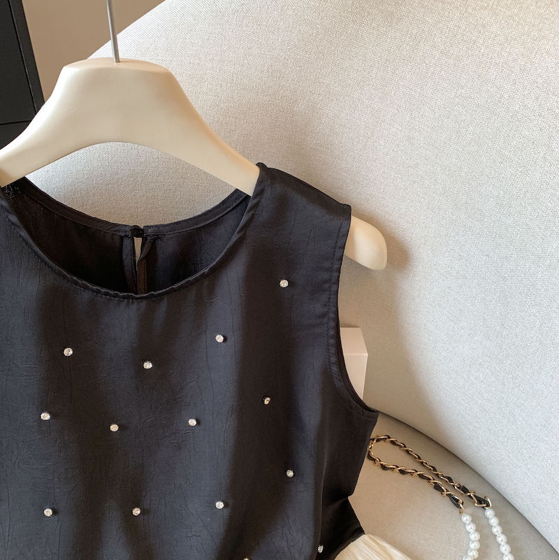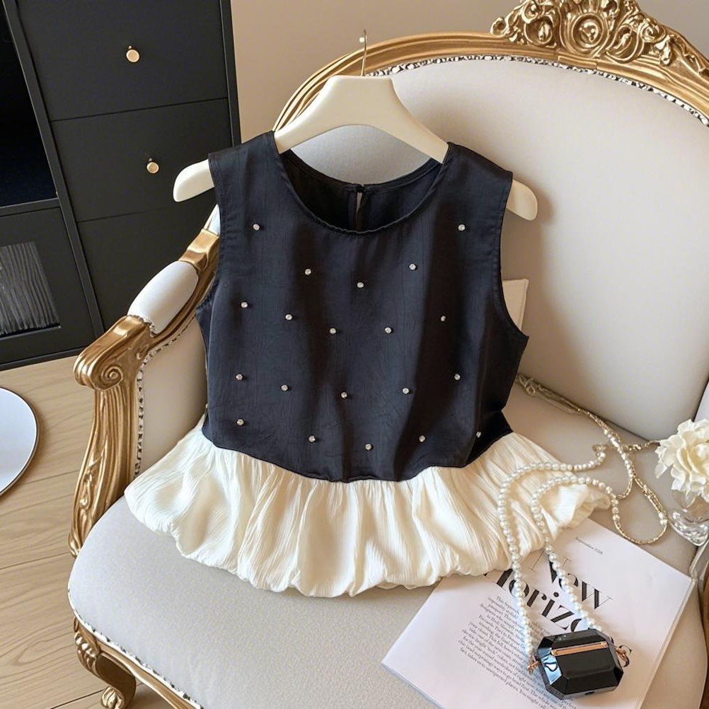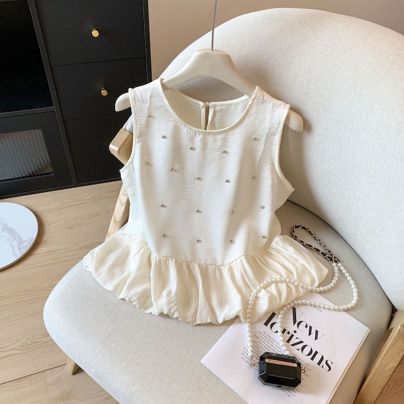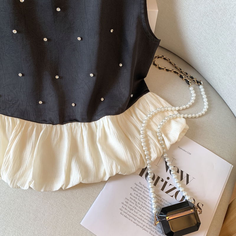 BY15789# 小香风烫钻无袖衬衫设计感拼接无袖裙摆小上衣甜美花苞背心 服裝批發女裝批發服飾貨源