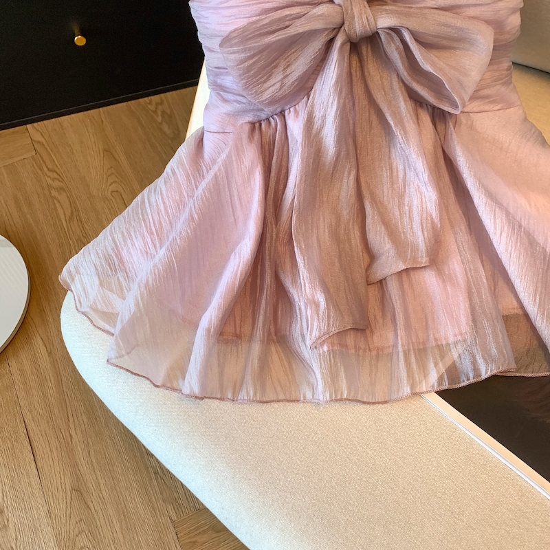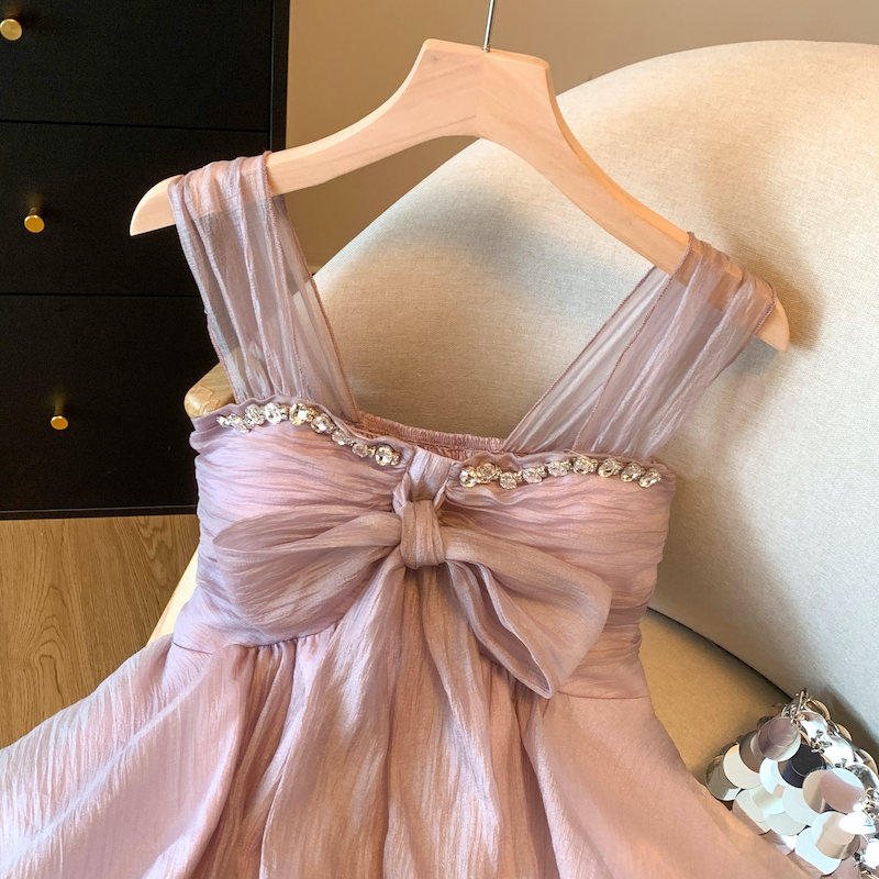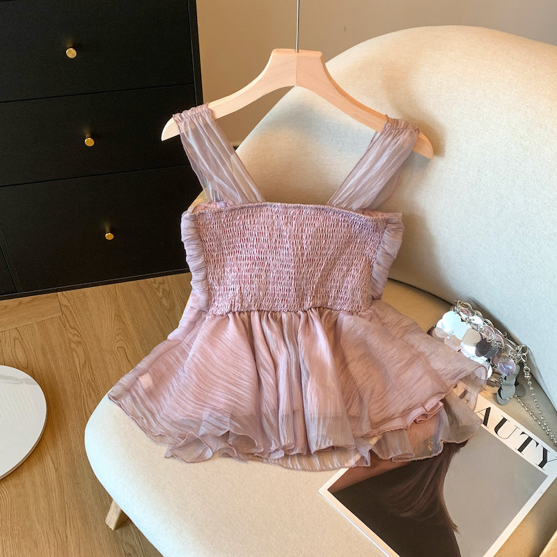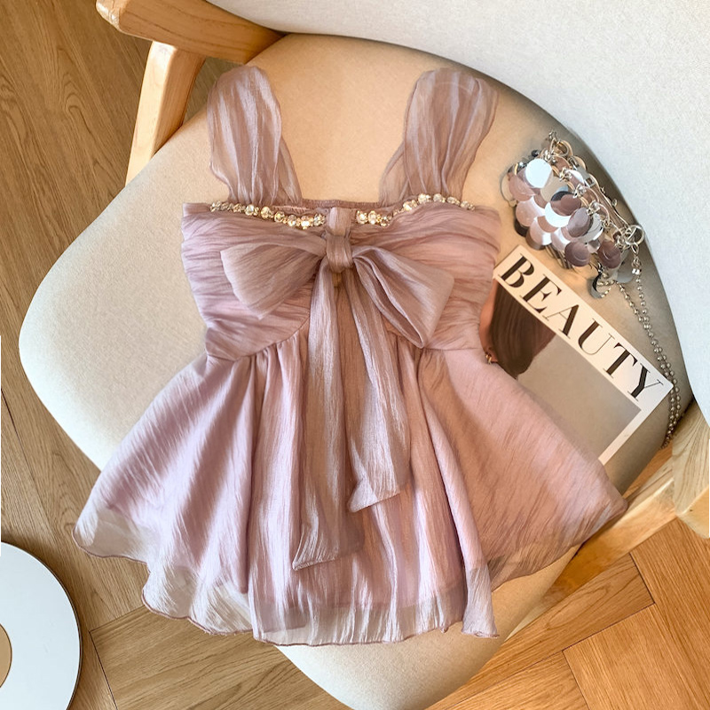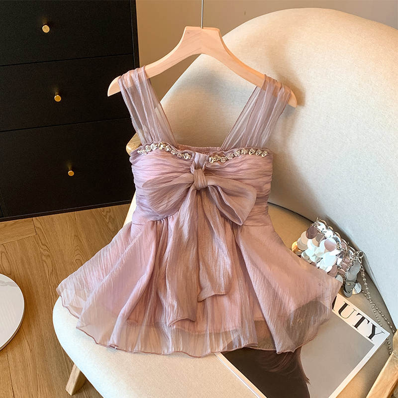 BY15791# 紫色镶钻蝴蝶结吊带背心女夏季辣妹荷叶边小衫法式雪纺上衣 服裝批發女裝批發服飾貨源