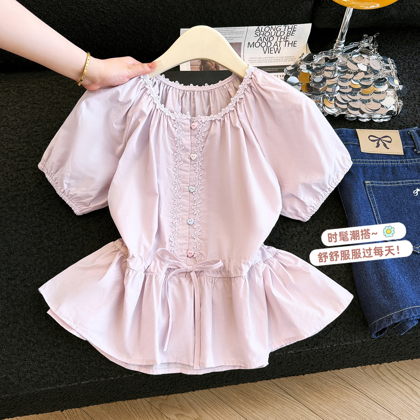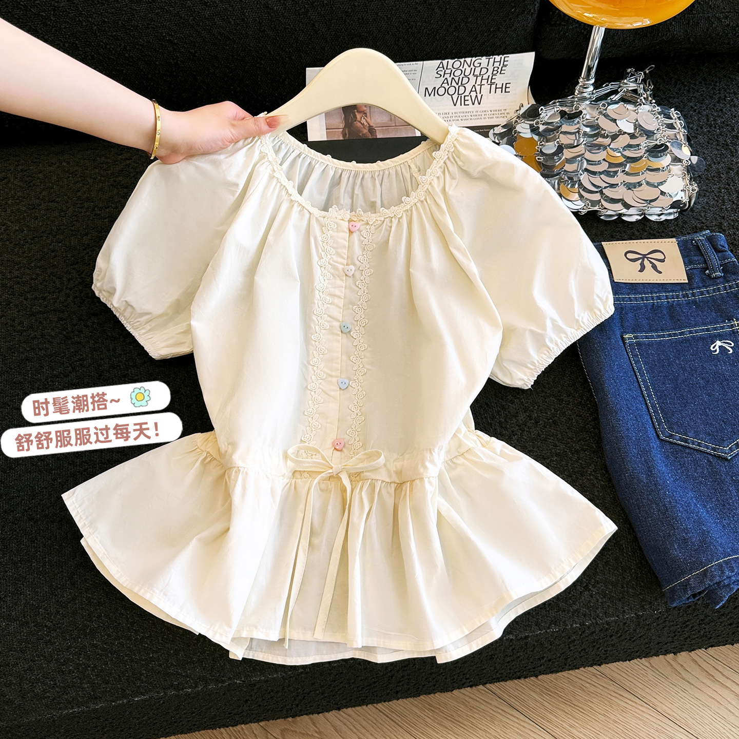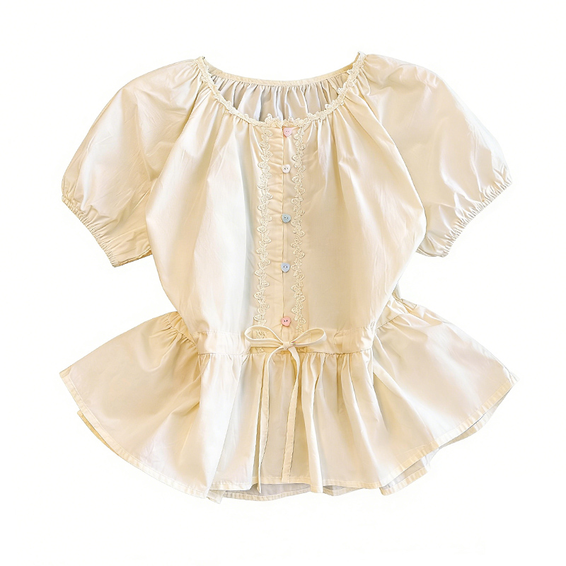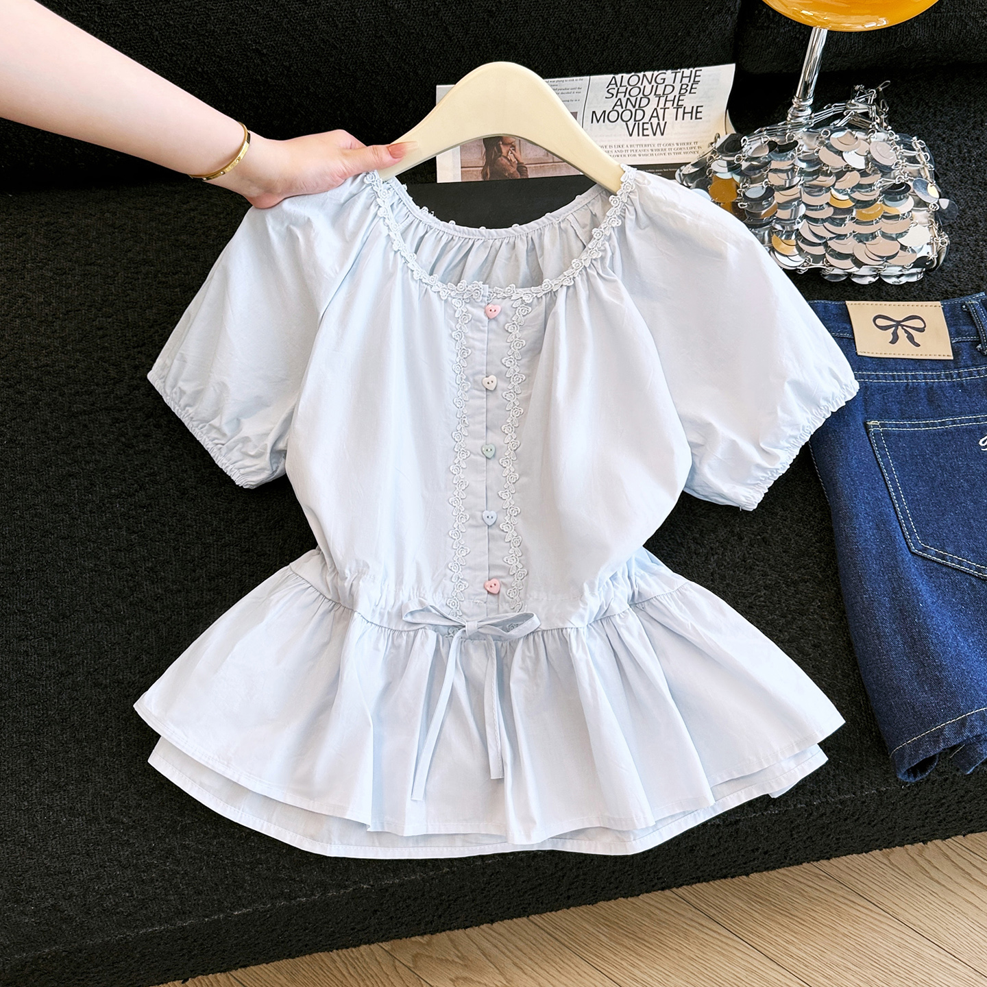 BY15809# 短袖衬衫女泡泡袖花边领娃娃衫夏新款蕾丝荷叶边别致短款上衣 服裝批發女裝批發服飾貨源