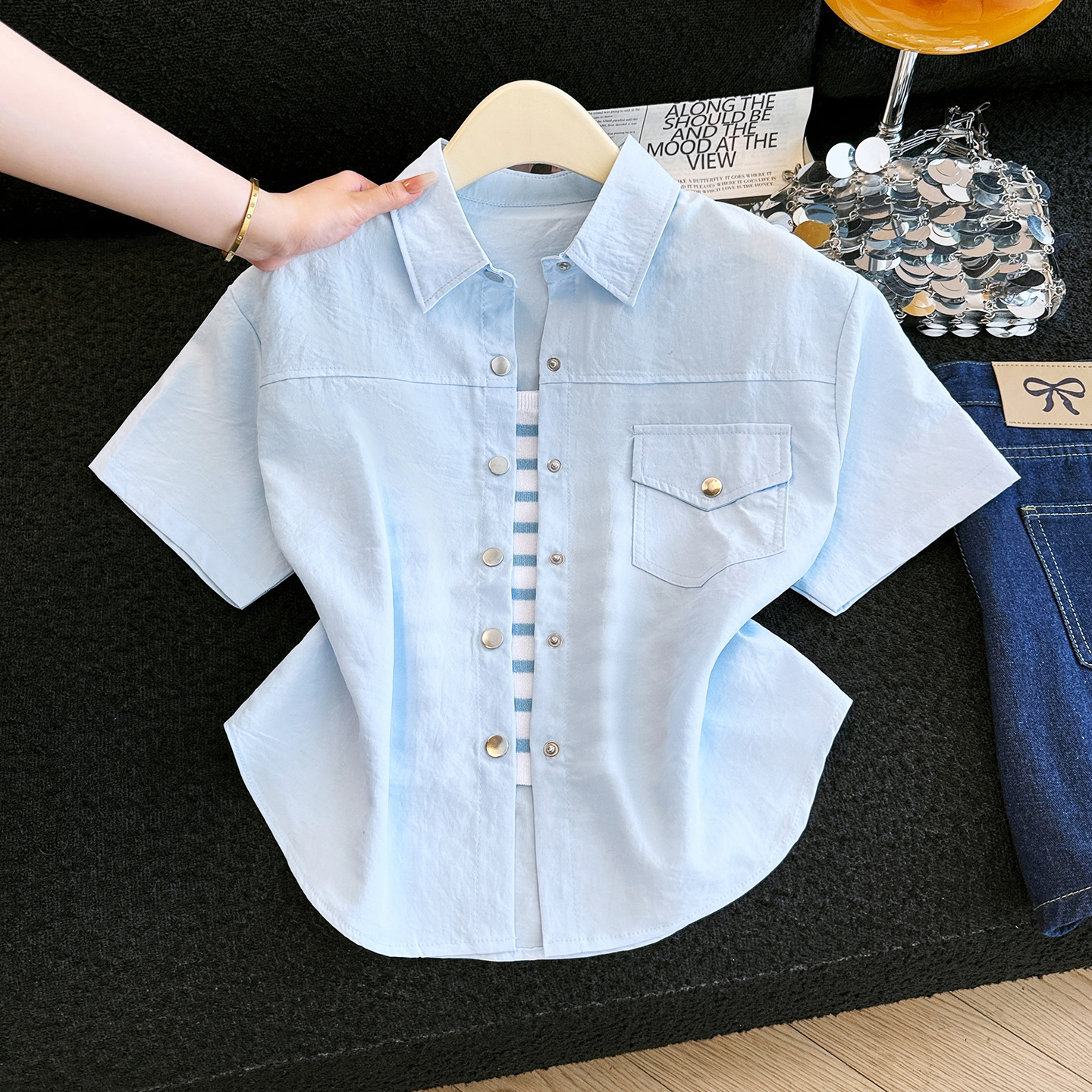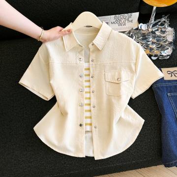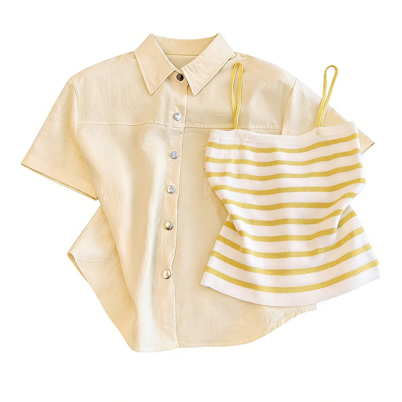 BY15810# 夏季多巴胺穿搭短袖奶黄色衬衫外套外搭短外套开衫二件套 服裝批發女裝批發服飾貨源