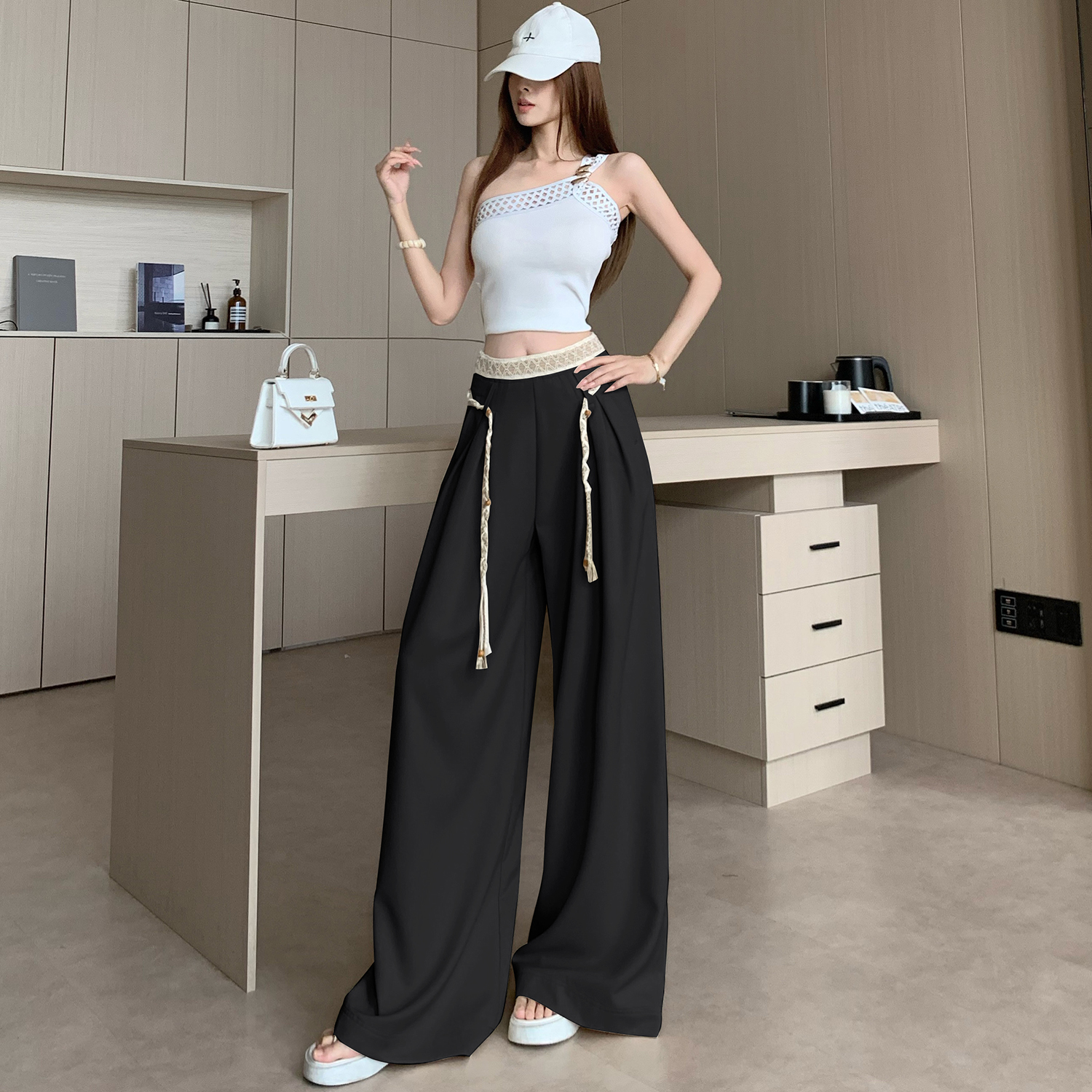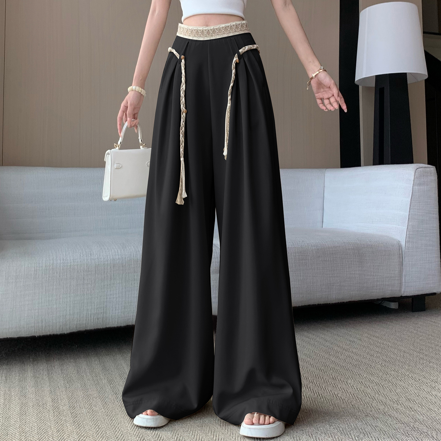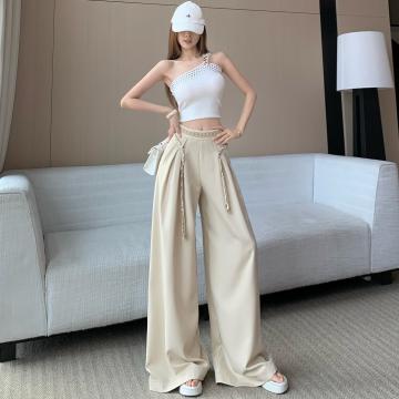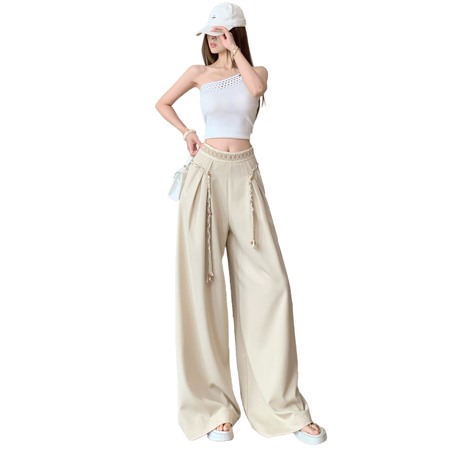 BY15908# 波西米亚系带阔腿裤女米杏色垂坠感春夏新款显瘦松弛感穿搭拖地裤 服裝批發女裝批發服飾貨源
