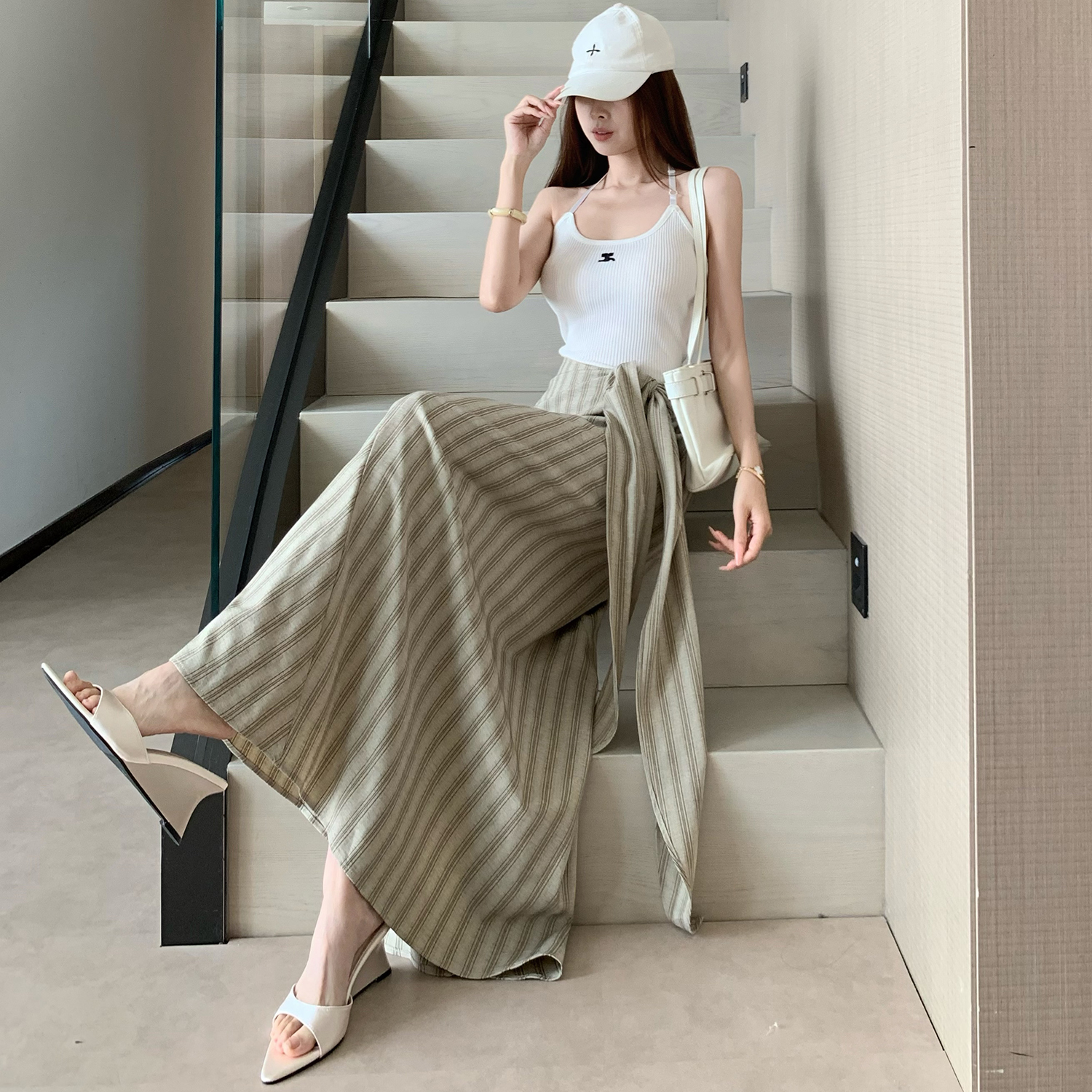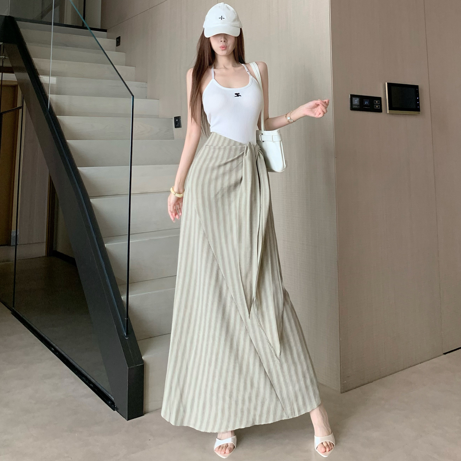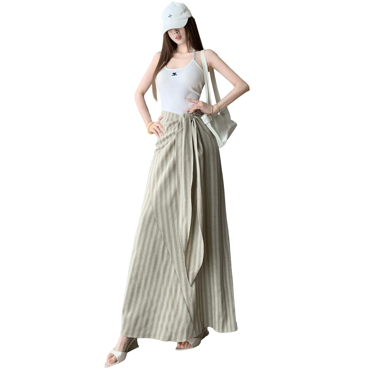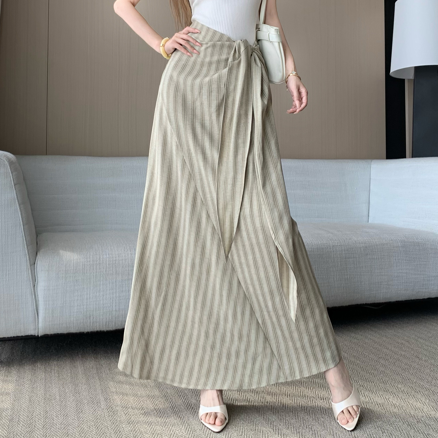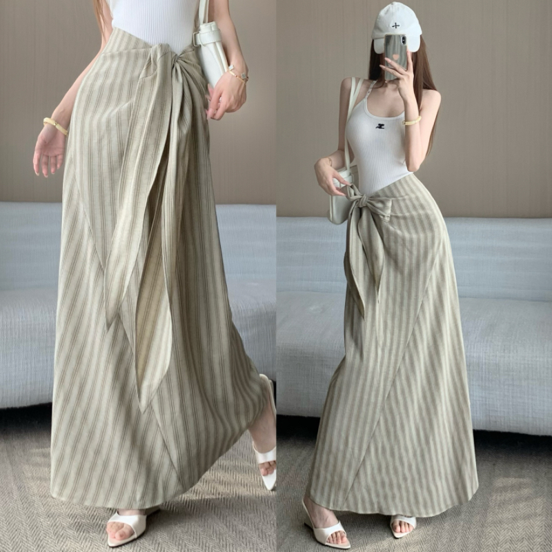 法式高级感收腰绑带条纹半身裙女新款高腰显瘦气质漂亮长裙子 服裝批發女裝批發服飾貨源