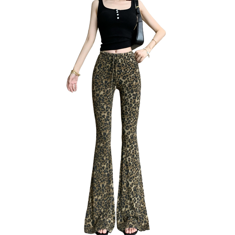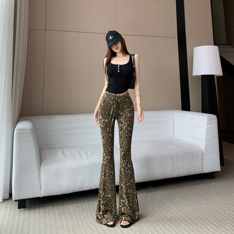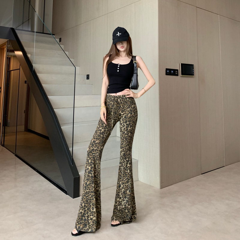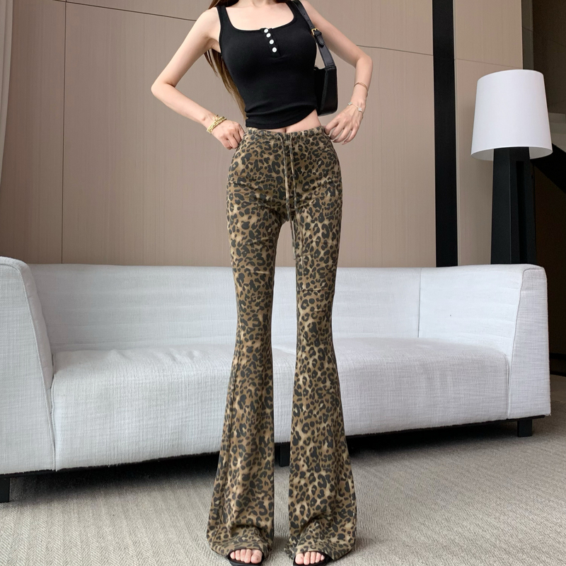 野生美式复古豹纹微喇叭休闲裤女新款辣妹高级独特修身显瘦长裤子 服裝批發女裝批發服飾貨源