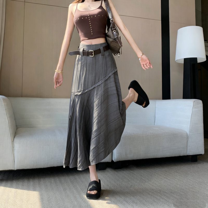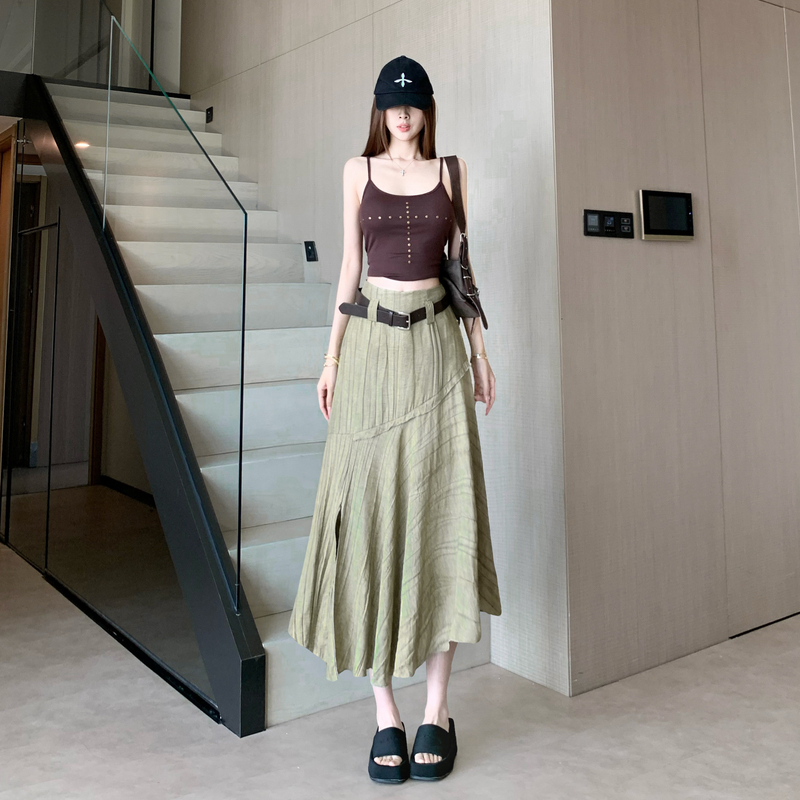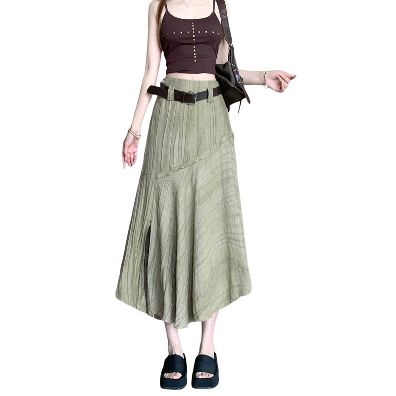 不规则配皮带高腰遮跨卡其色中长裙女夏季新款韩版百搭a字裙 服裝批發女裝批發服飾貨源
