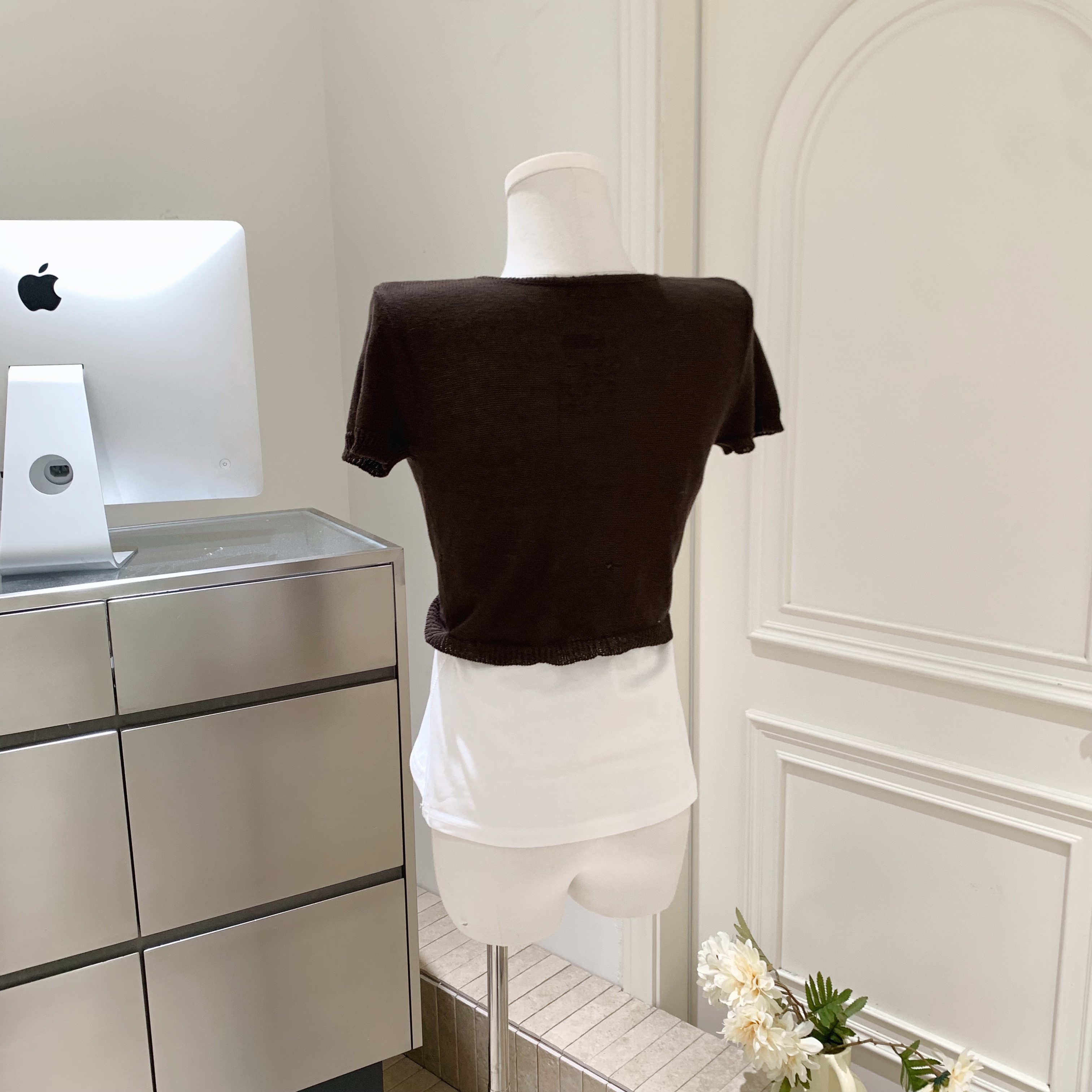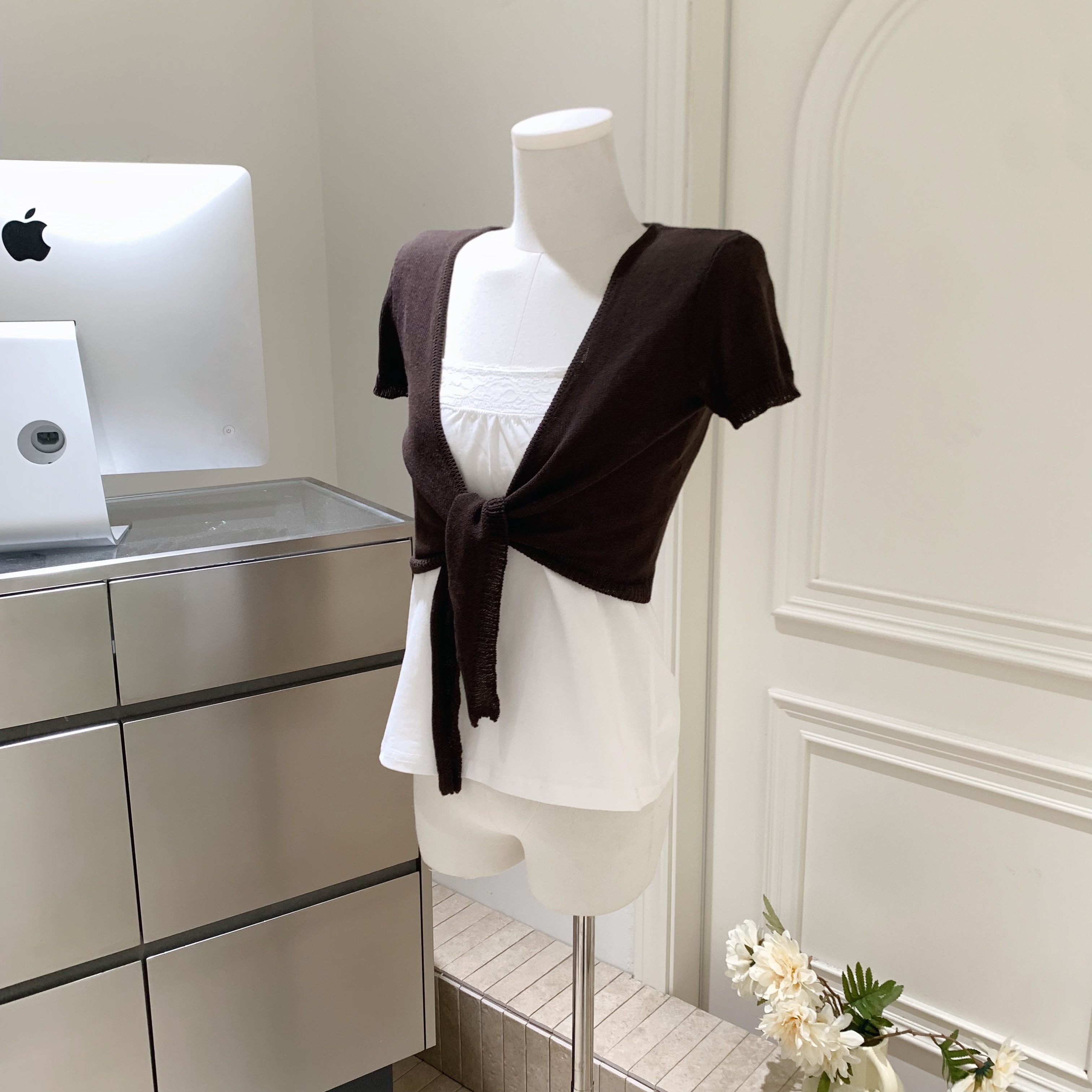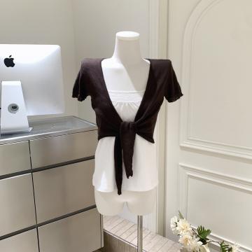 BY15950# 棕色V领绑带短款针织衫女bm短袖围裹式宽肩罩衫外搭上衣 服裝批發女裝批發服飾貨源
