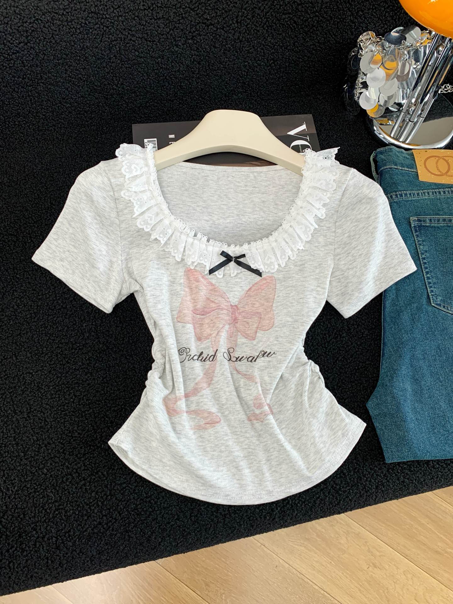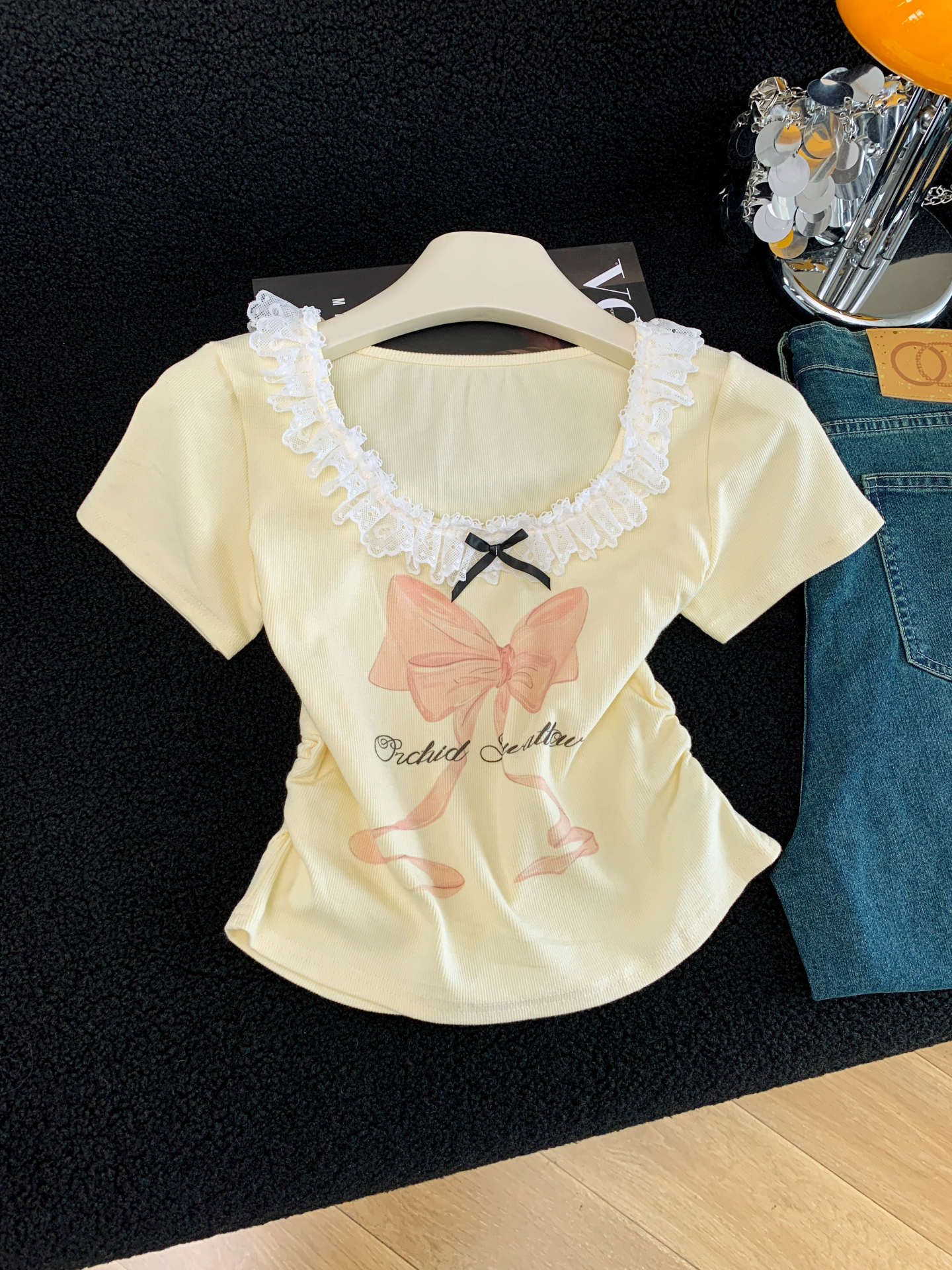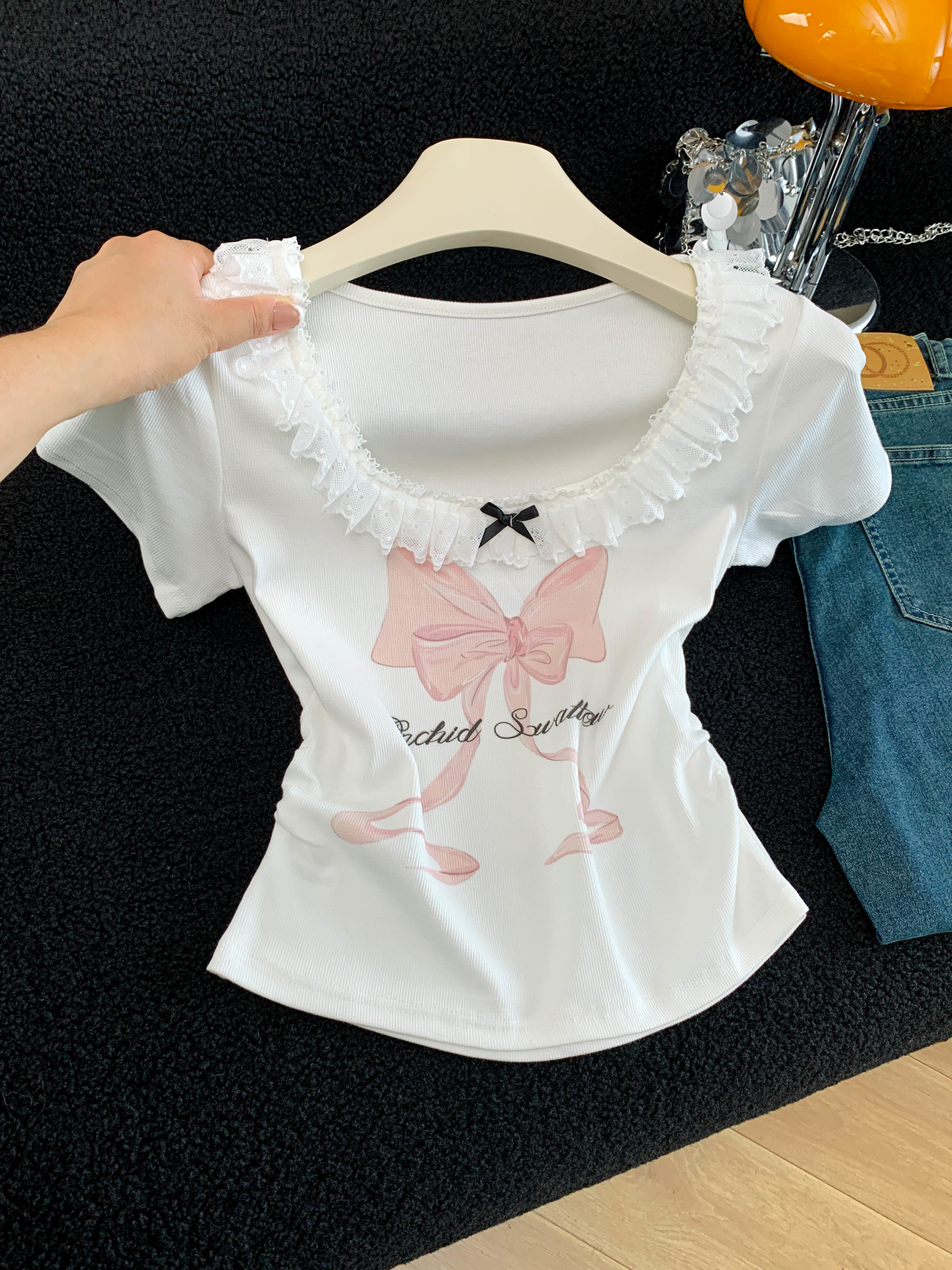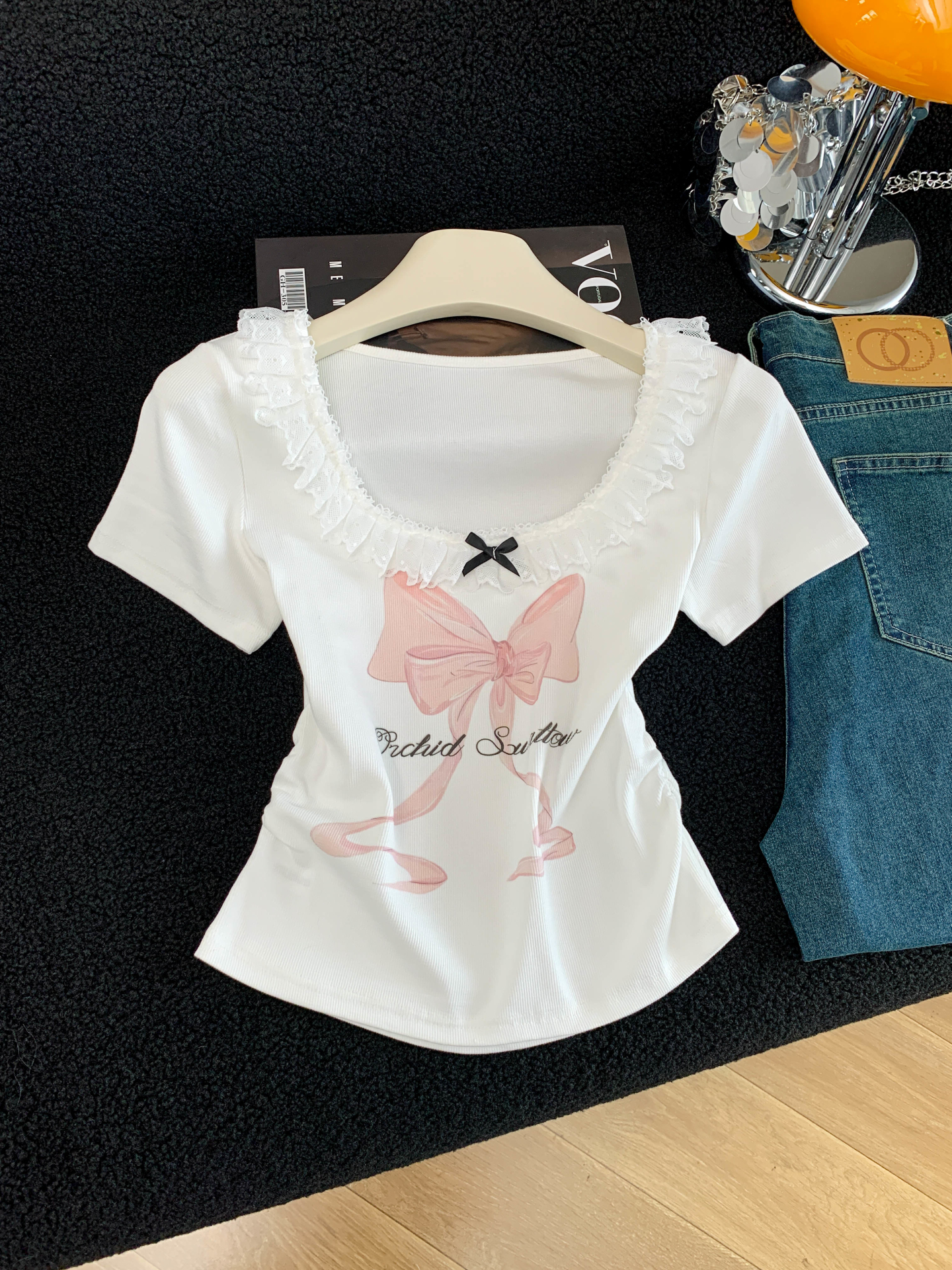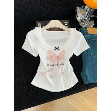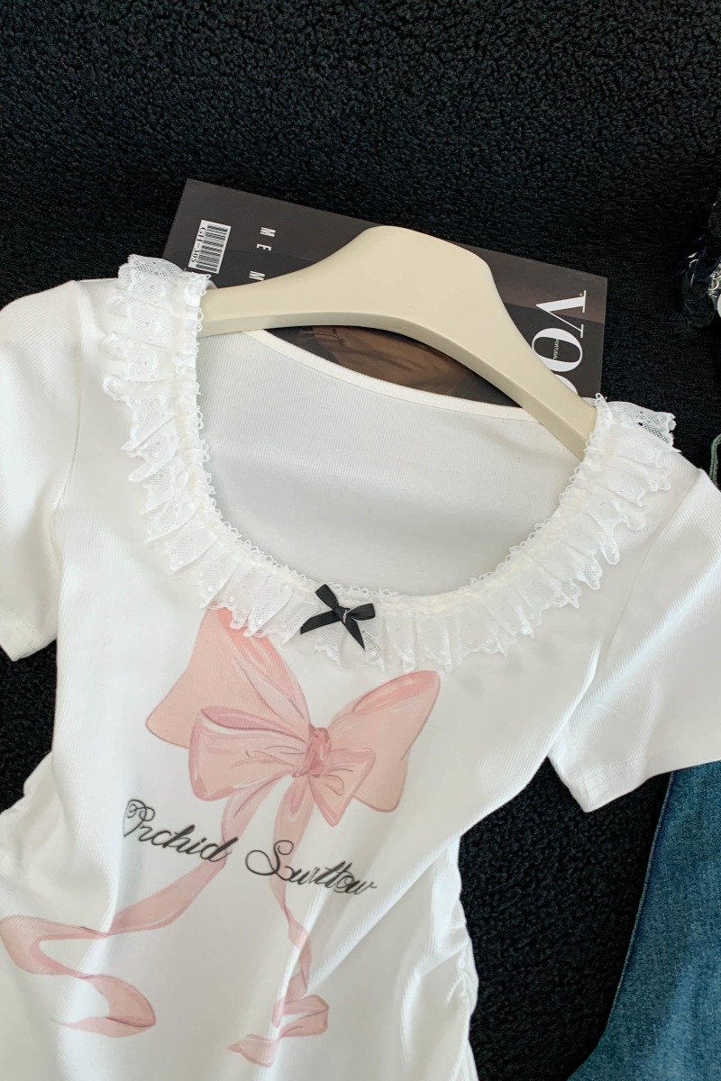 BY15986# 夏季新款韩版修身洋气花边拼接蝴蝶结印花短袖T恤女上衣 服裝批發女裝批發服飾貨源