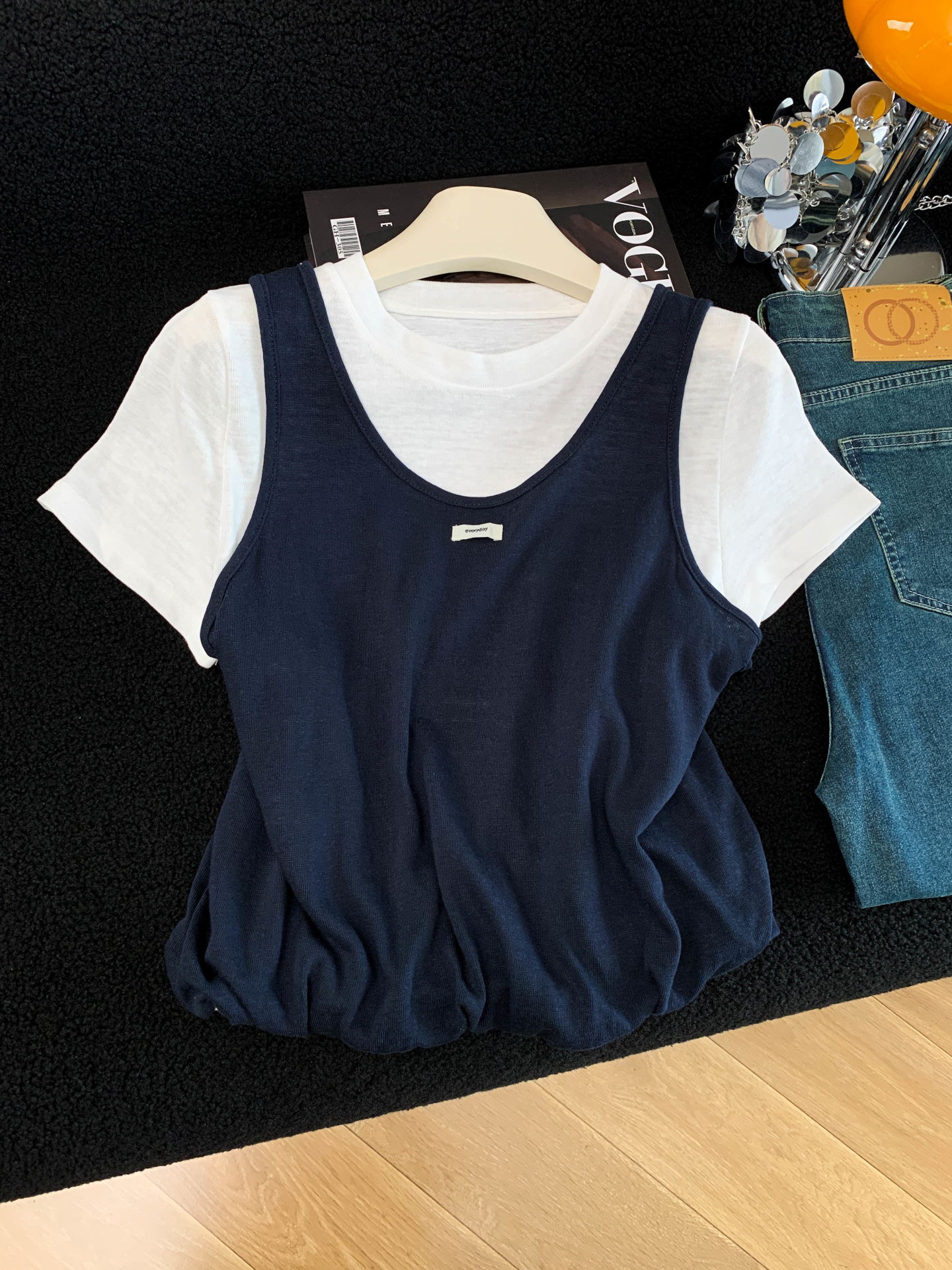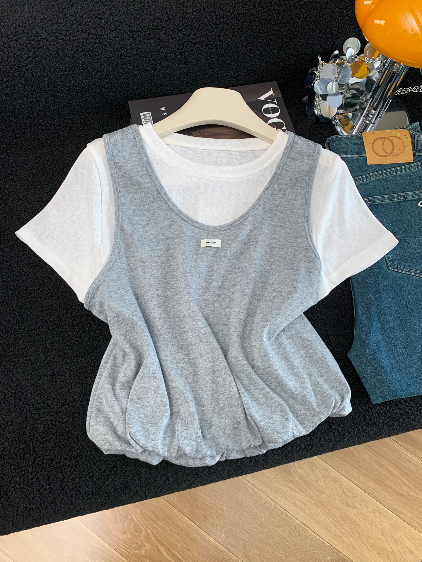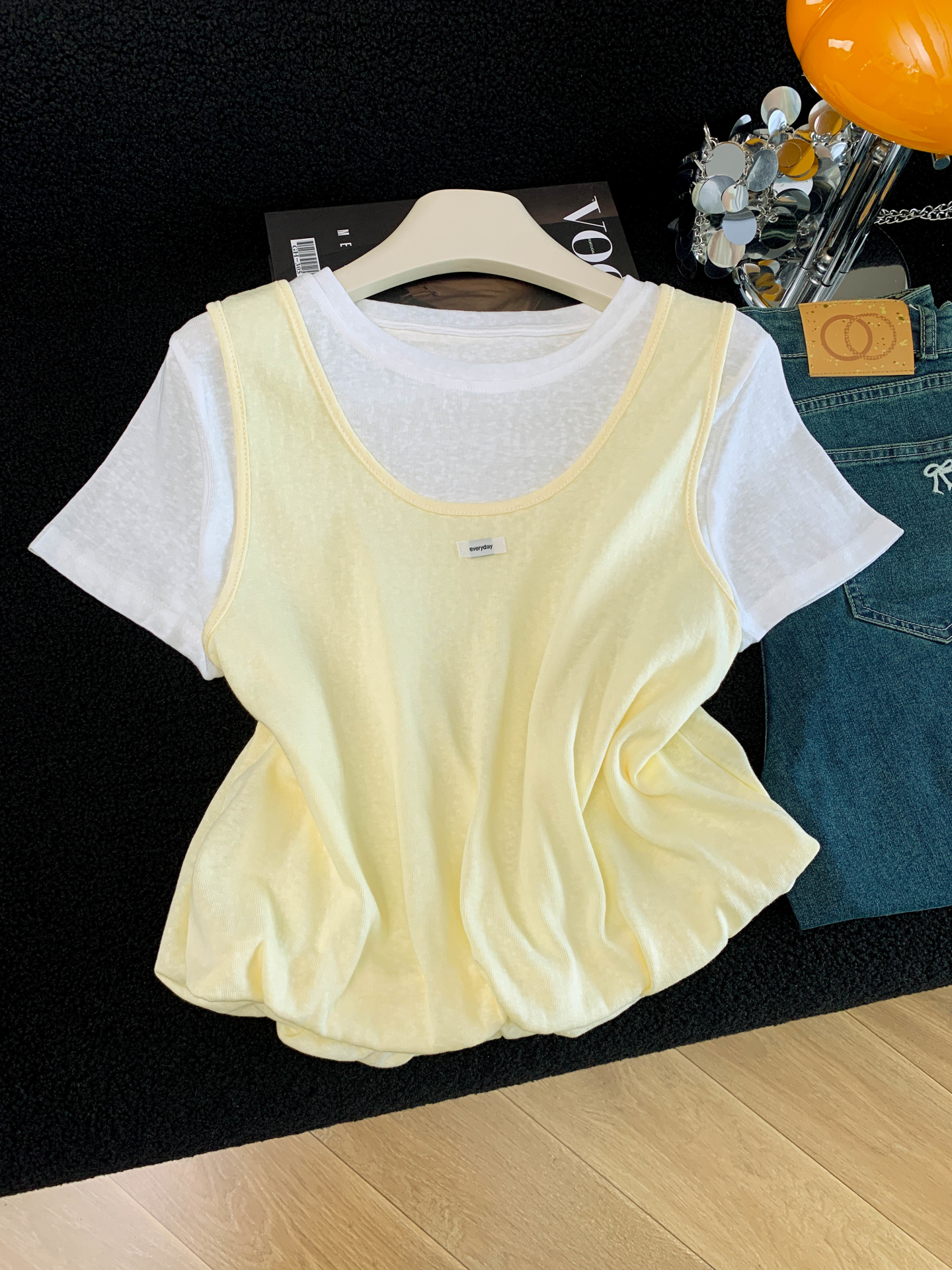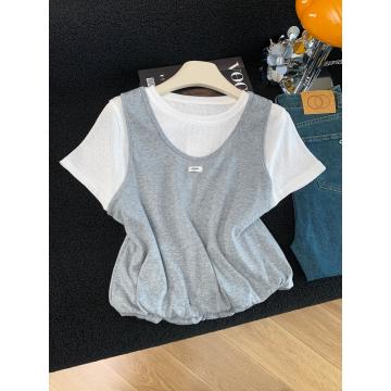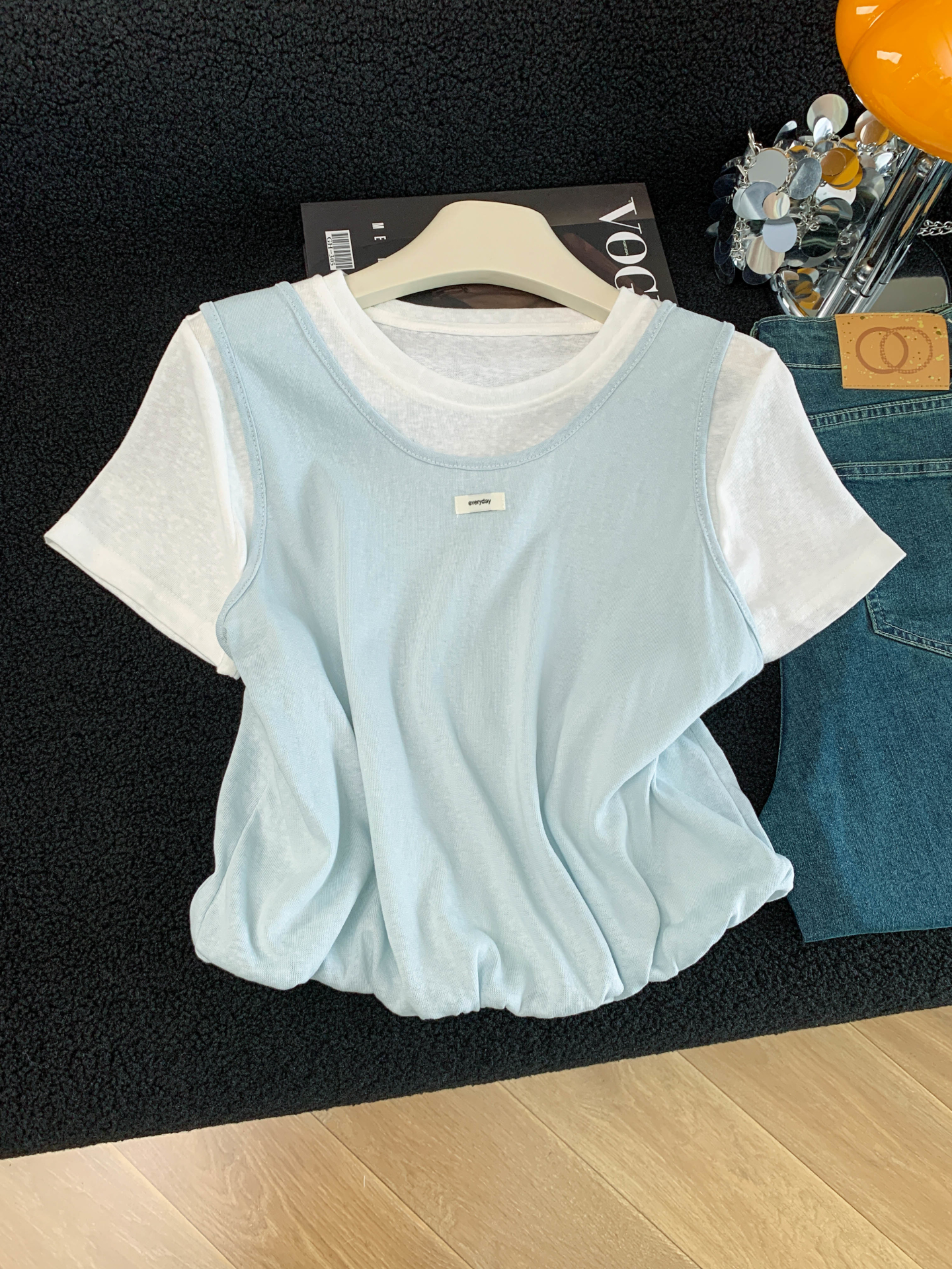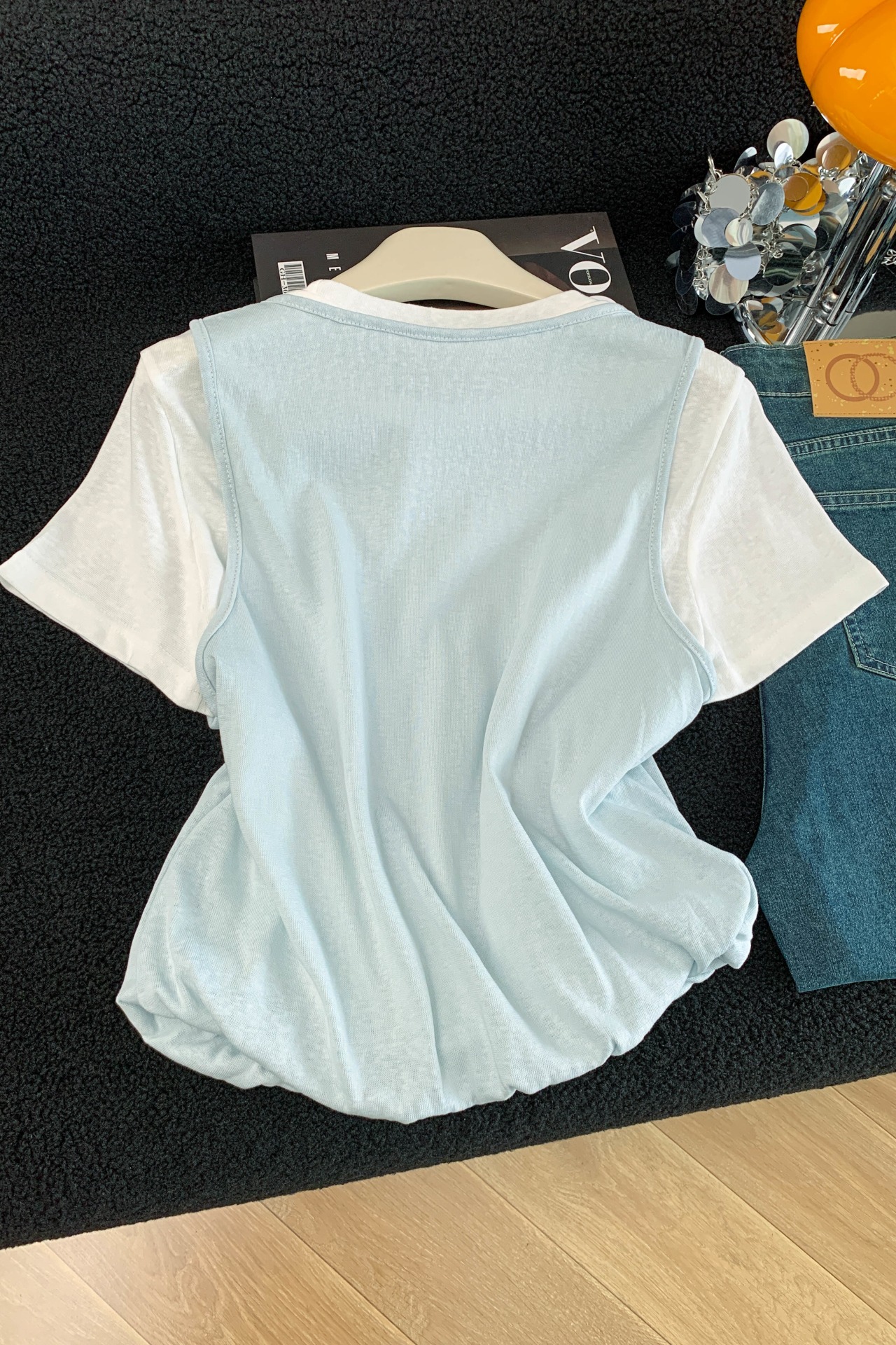 BY15987# 夏季新款韩版宽松洋气时尚百搭假两件叠穿T恤女上衣 服裝批發女裝批發服飾貨源