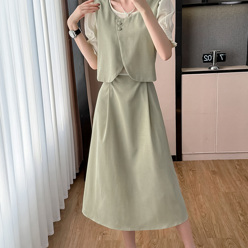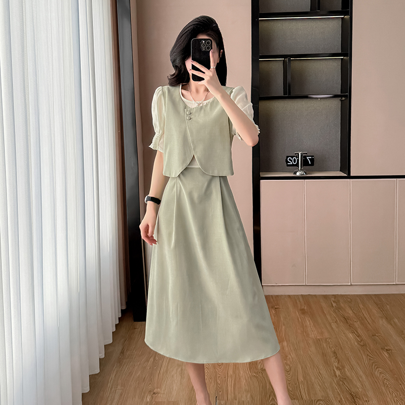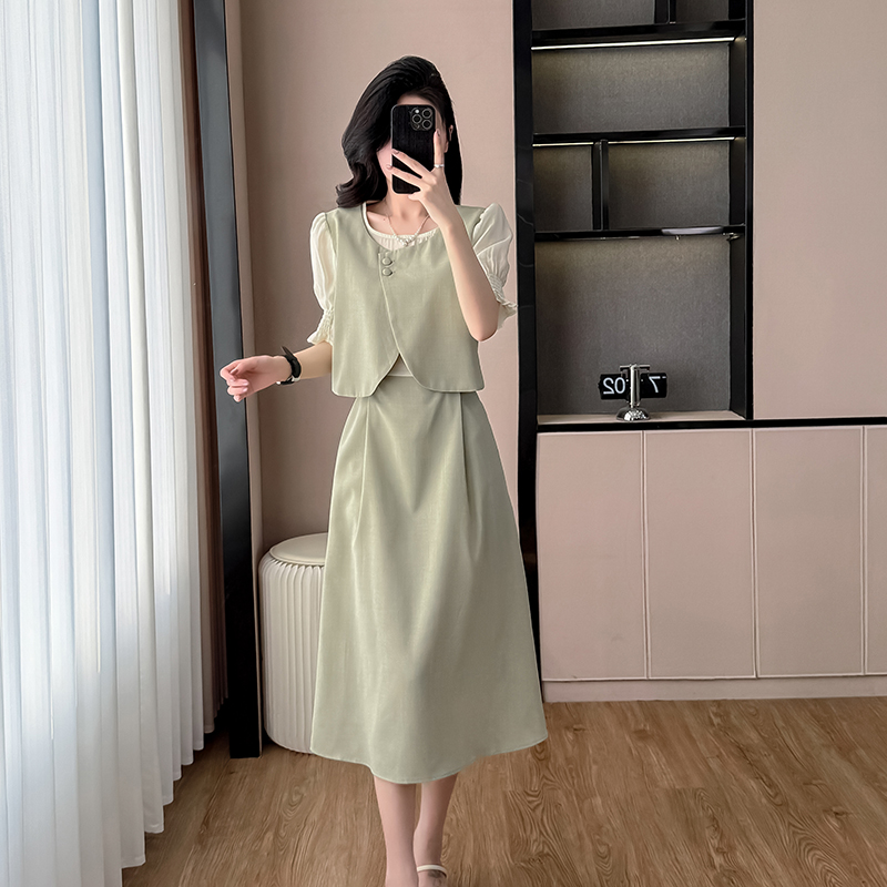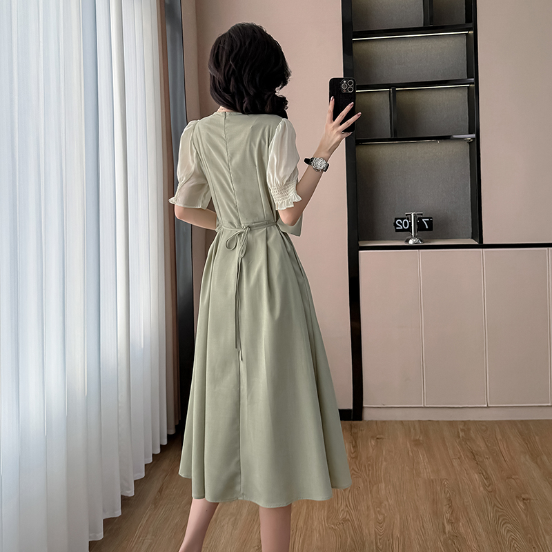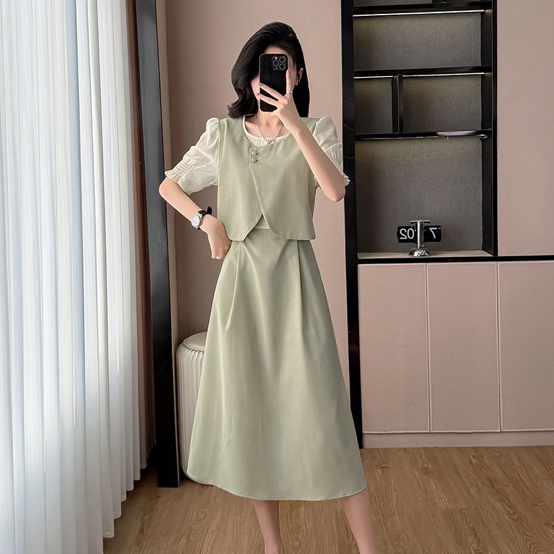 BY16047# 法式气质圆领假两件连衣裙女夏季新款韩版收腰显瘦甜美长裙子 服裝批發女裝批發服飾貨源