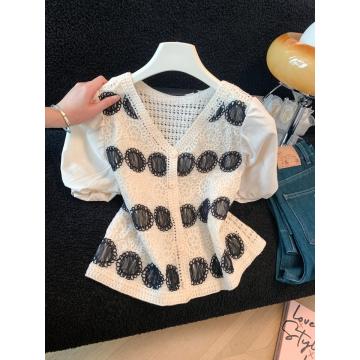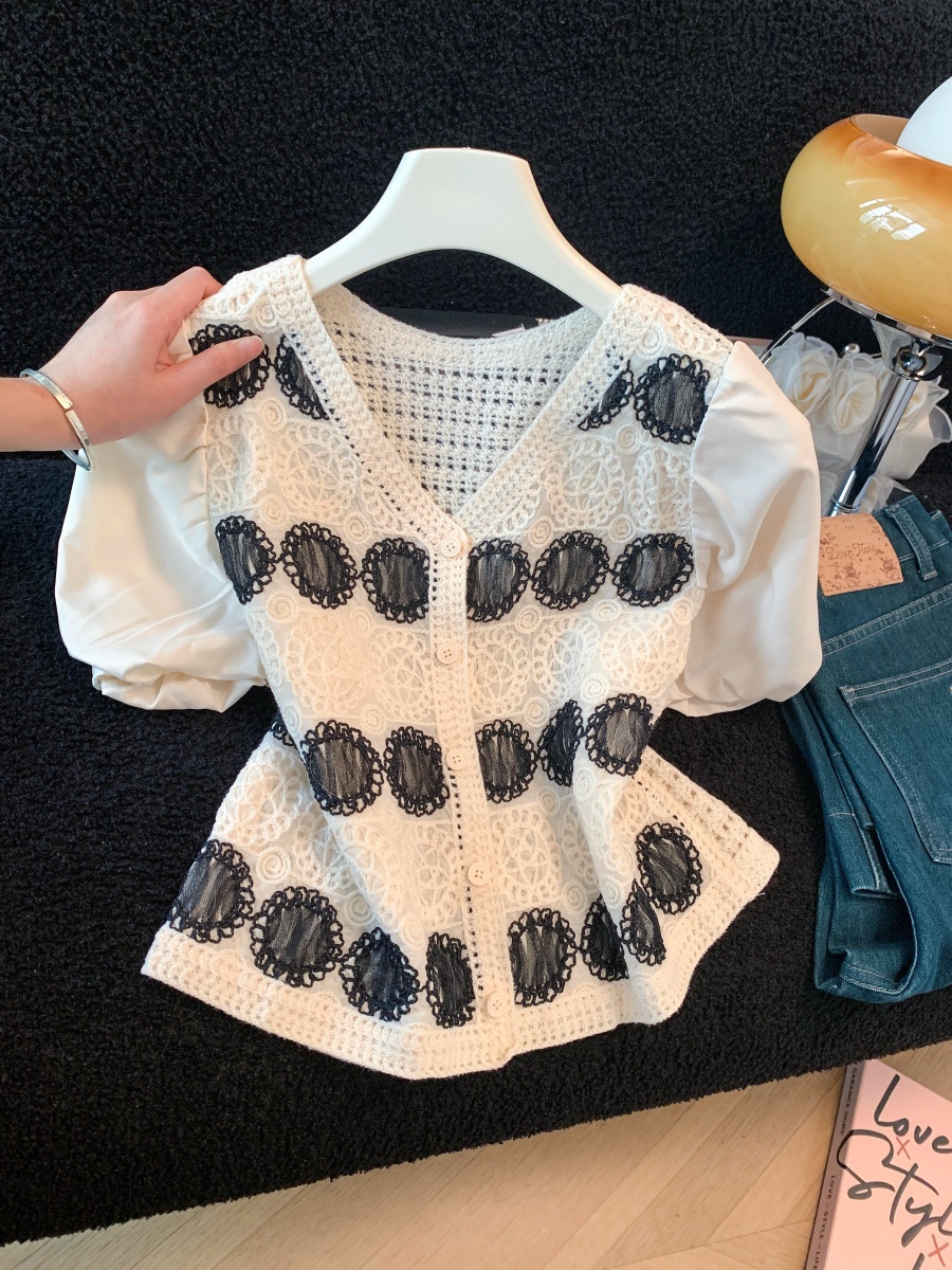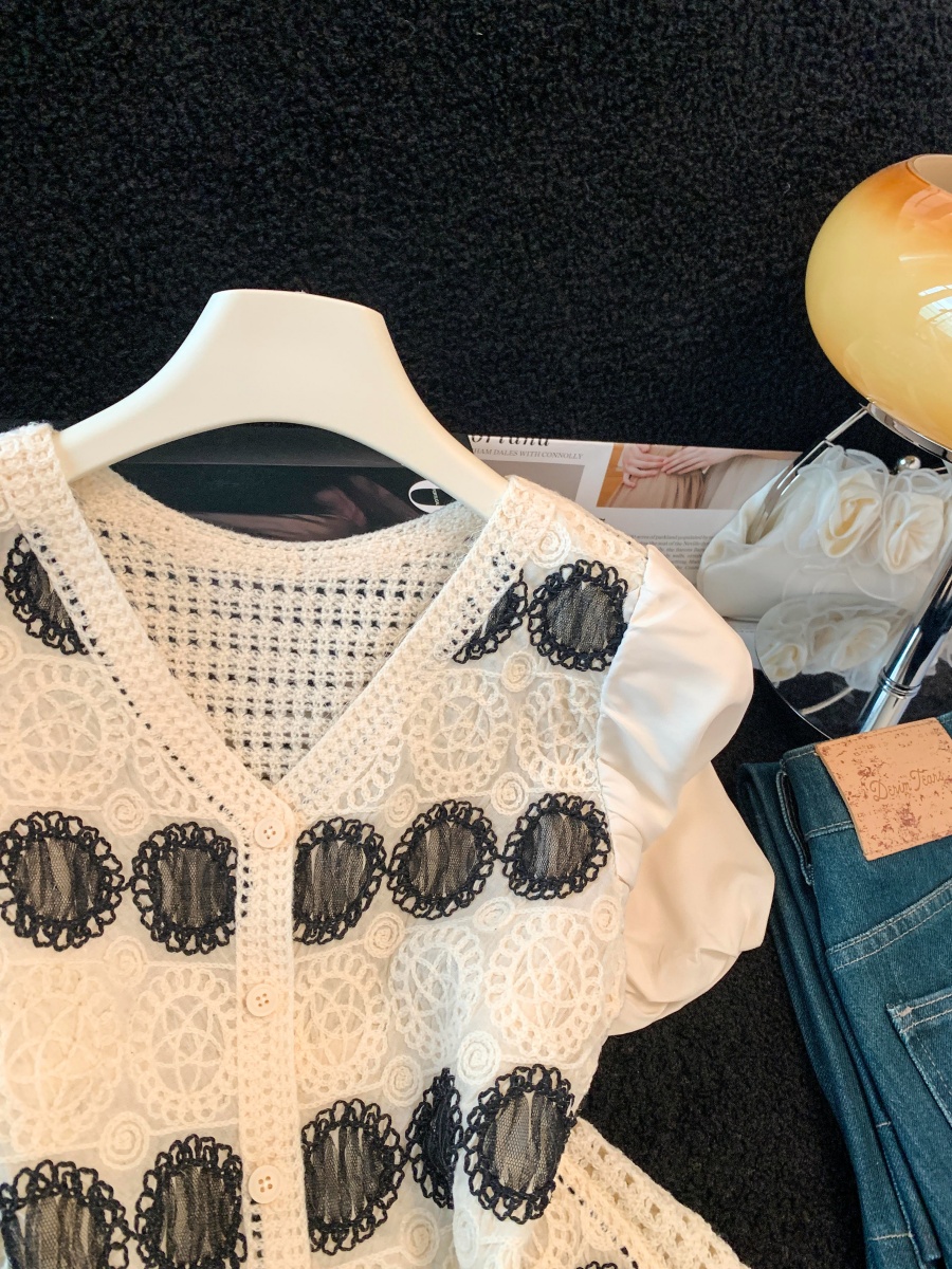 BY16279# 镂空钩花短袖夏季新款韩版V领开衫短款泡泡袖气质上衣 服裝批發女裝批發服飾貨源