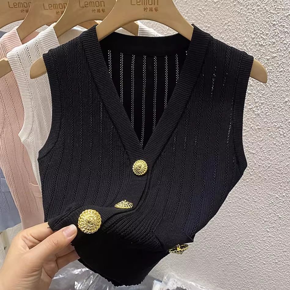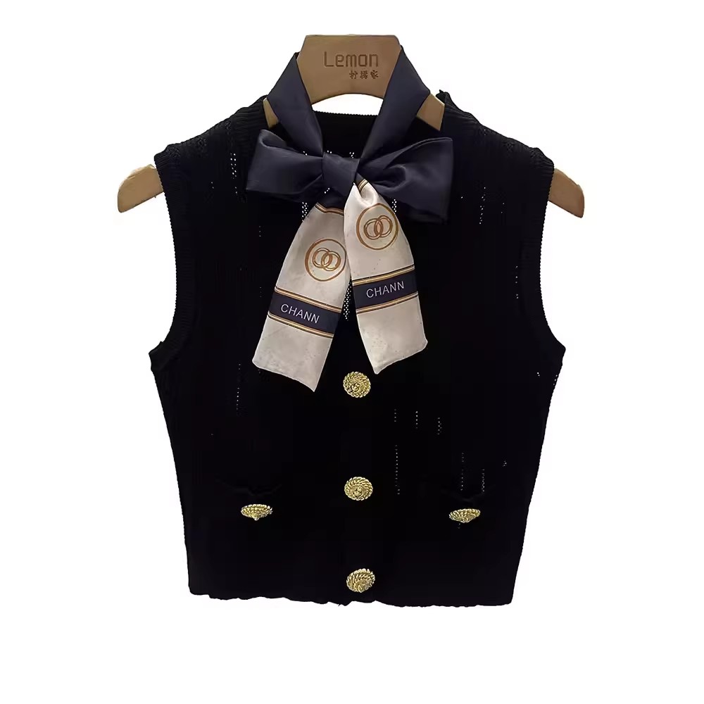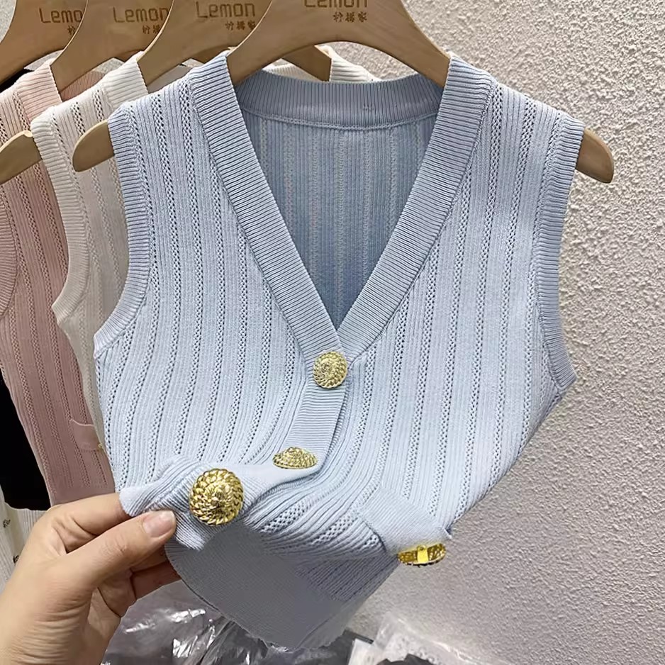 BY16280# 春夏法式冰丝针织马甲背心女外穿修身短款小香风V领无袖上衣 服裝批發女裝批發服飾貨源