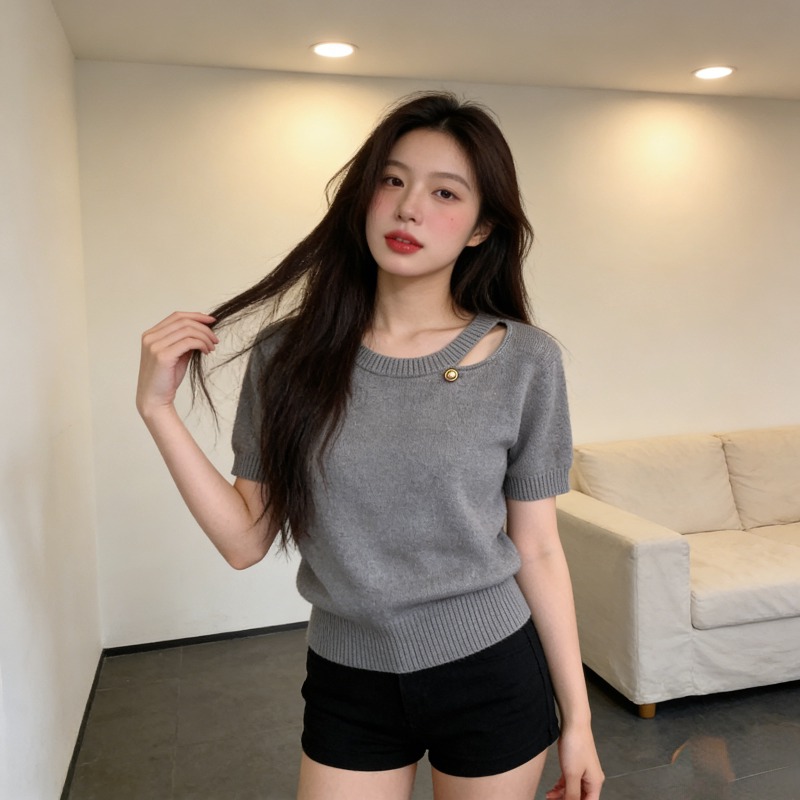 BY16286# 夏季新款女士时尚减龄冰丝薄款上衣超好看紫色圆领短袖针织衫 服裝批發女裝批發服飾貨源