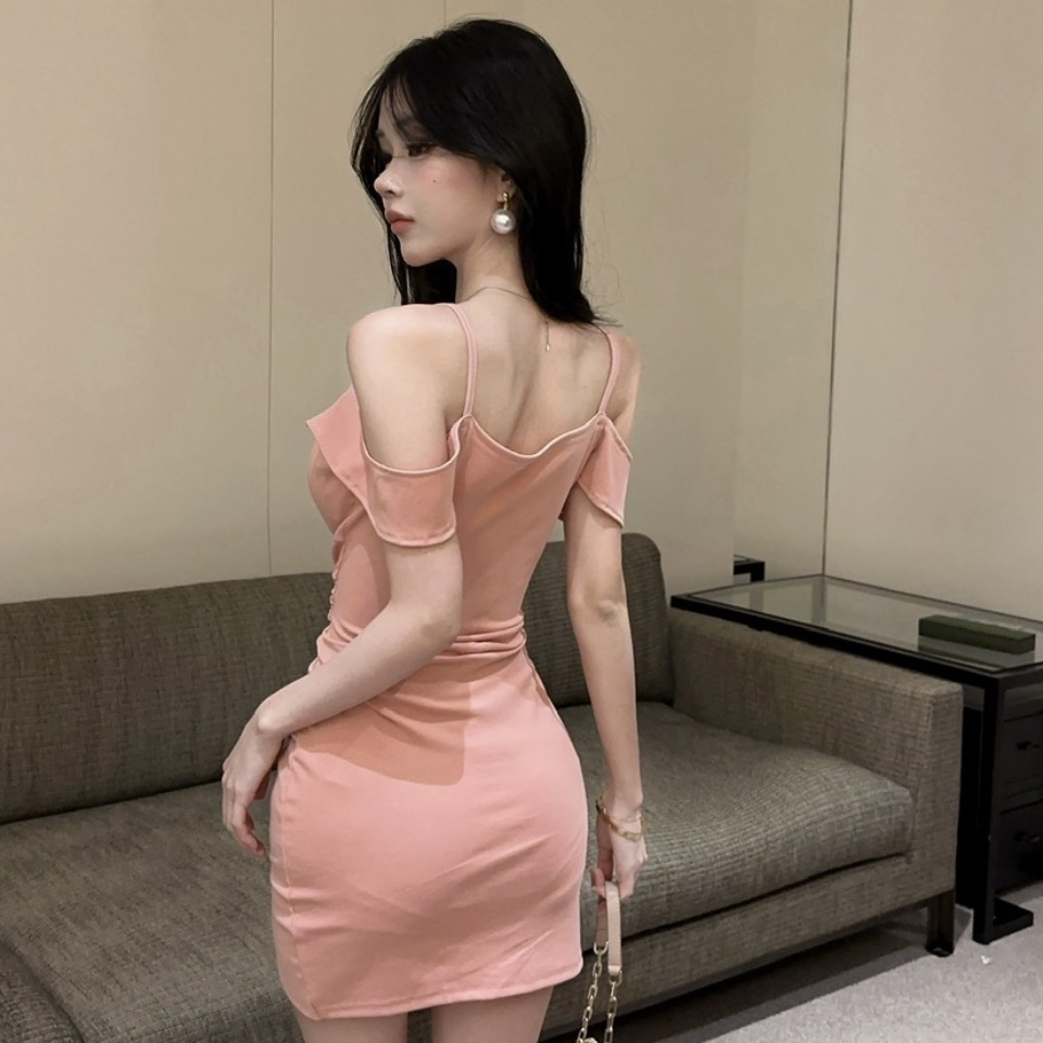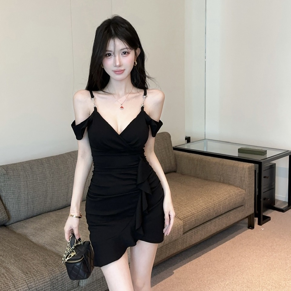 BY16304# 温柔风深V不规则荷叶边连衣裙女闺蜜聚会气质紧身包臀裙 服裝批發女裝批發服飾貨源
