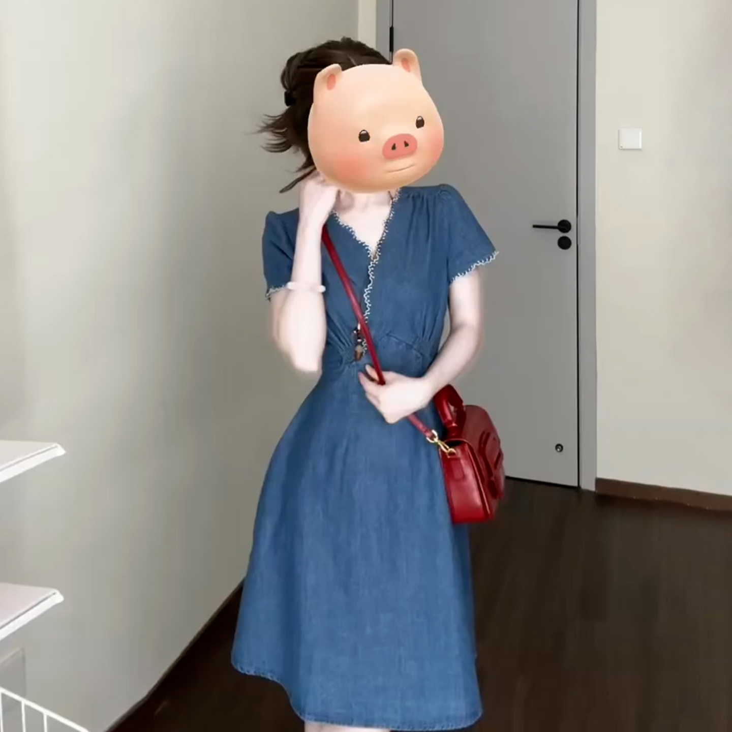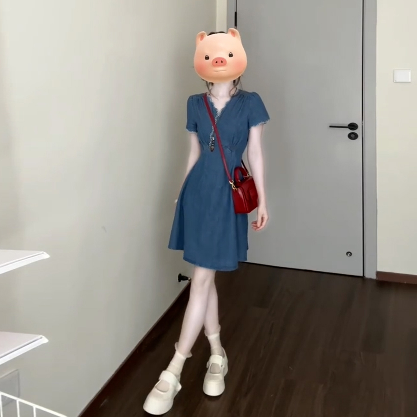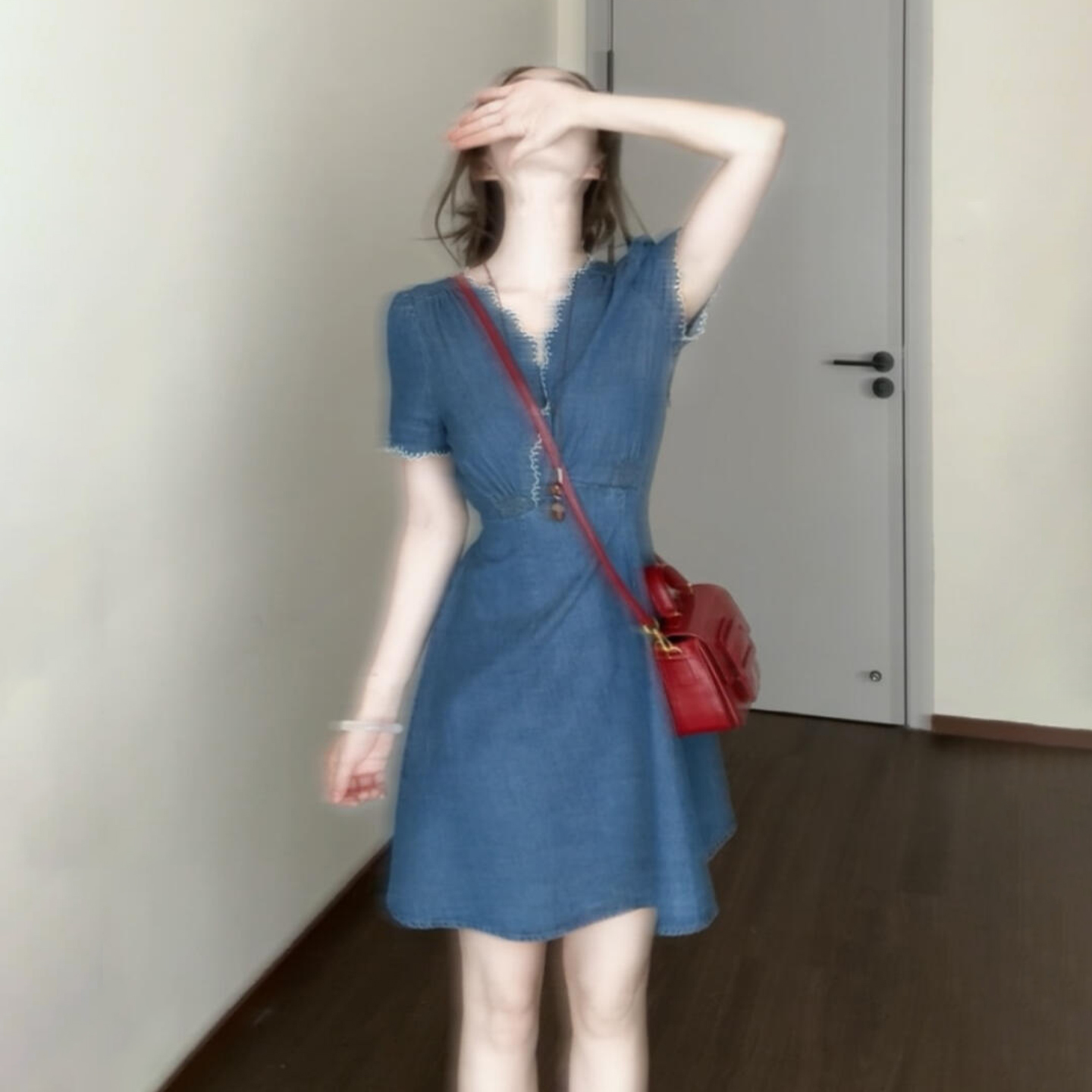 BY16334# 法式v领蓝色蕾丝花边连衣裙子女夏季新款高级感气质收腰短裙 服裝批發女裝批發服飾貨源