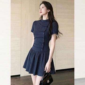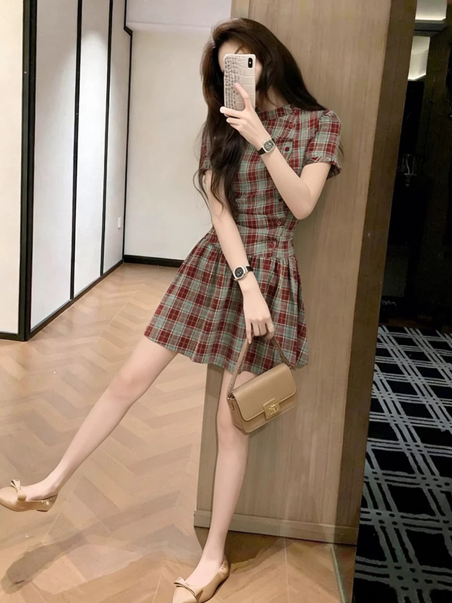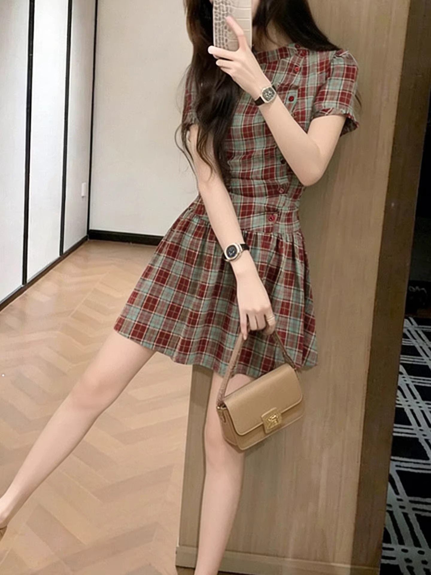 BY16336# 复古酒红色格纹收腰连衣裙女时尚洋气小众斜扣设计感a字短袖裙子 服裝批發女裝批發服飾貨源