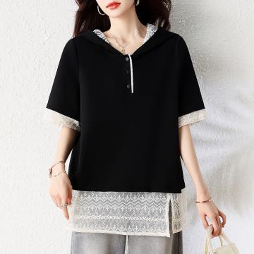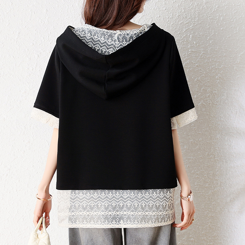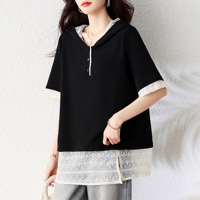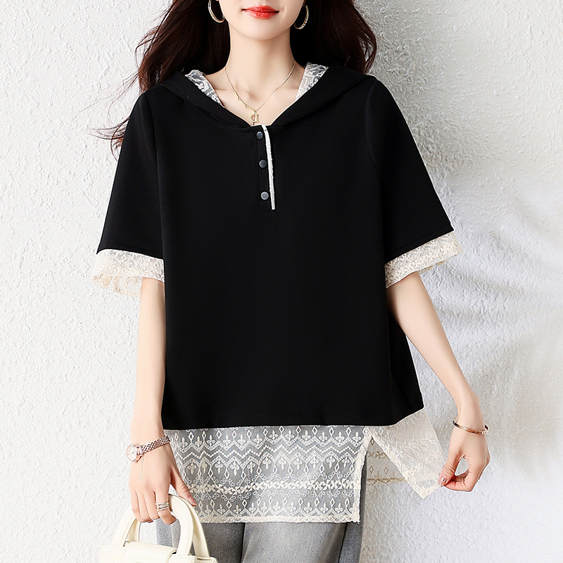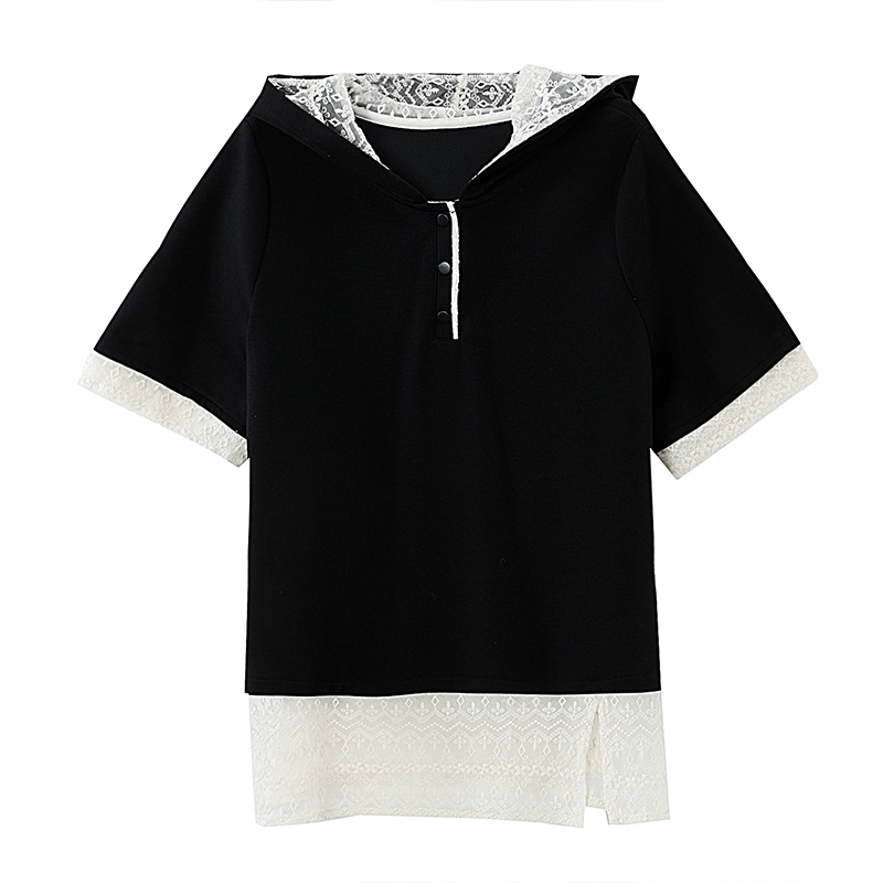 Home > 短袖T恤 > BY16338# 夏季新款韩版刺绣蕾丝拼接设计假两件大码连帽T恤女短袖 服裝批發女裝批發服飾貨源