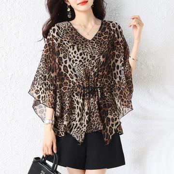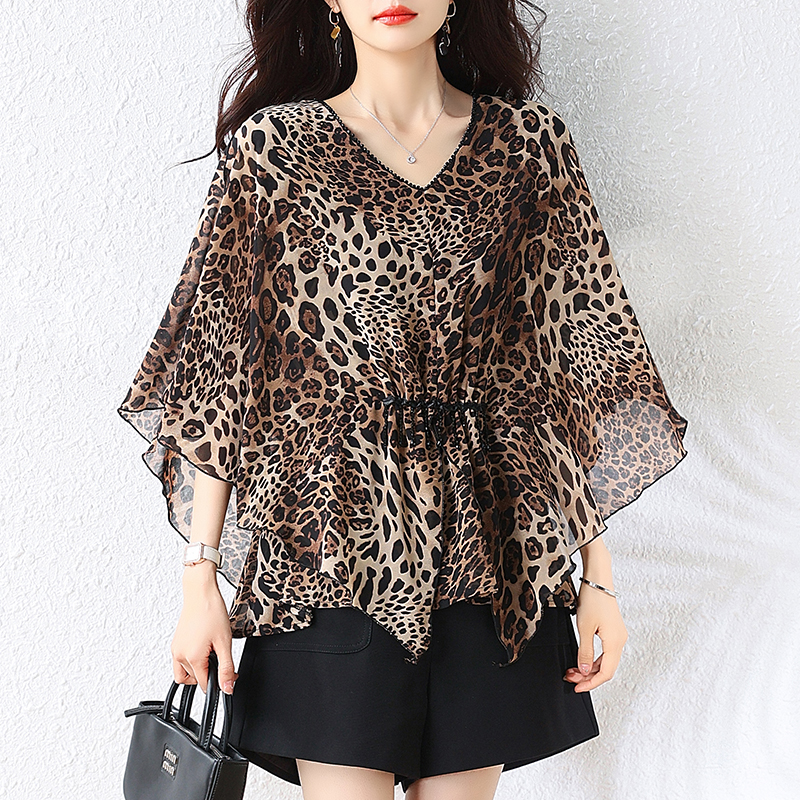 BY16340# 夏季新款大码女装时候气质V领豹纹蝙蝠衫上衣宽松雪纺衫 服裝批發女裝批發服飾貨源