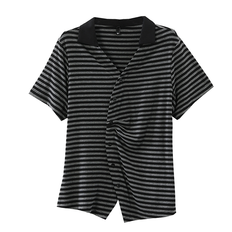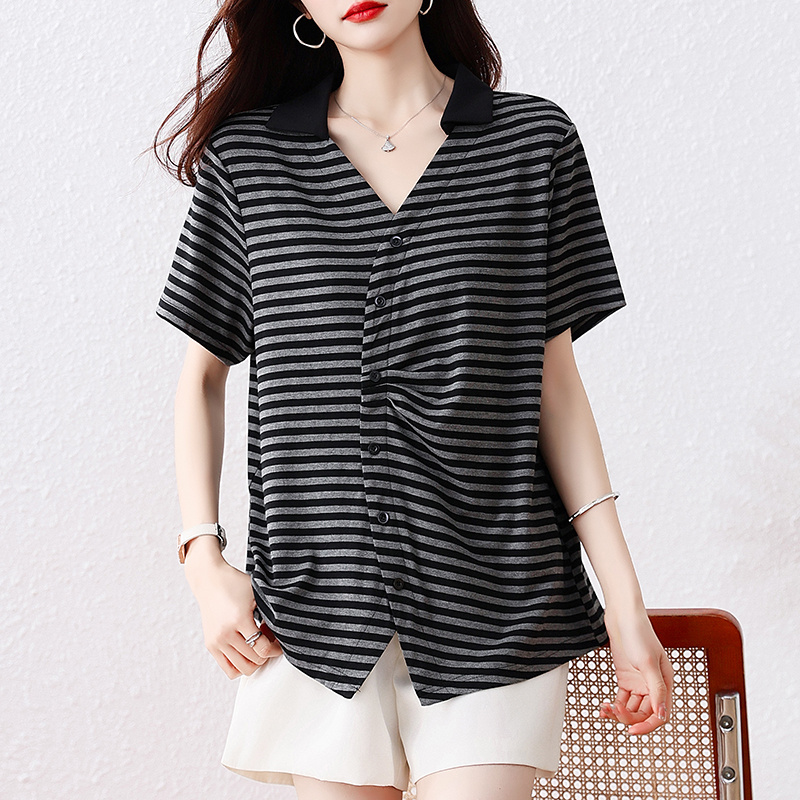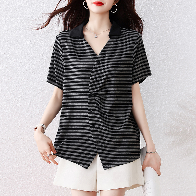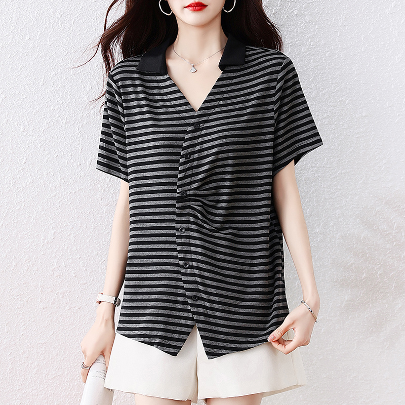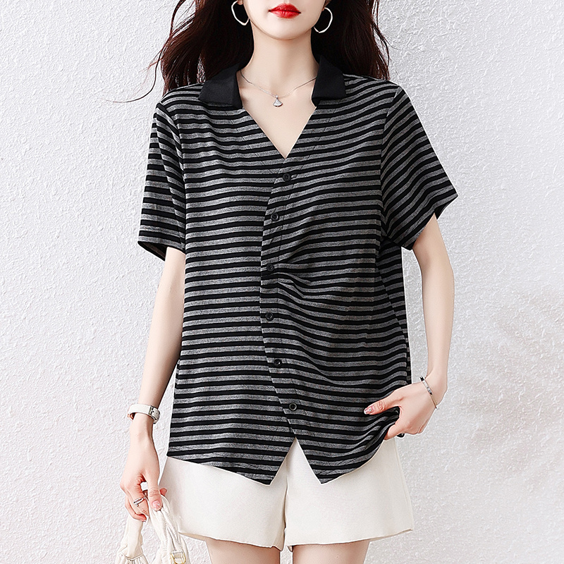 BY16341# 短袖衬衫大码V领宽松显瘦上衣夏季新款条纹衬衣洋气T恤 服裝批發女裝批發服飾貨源