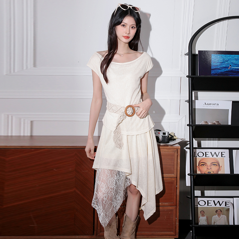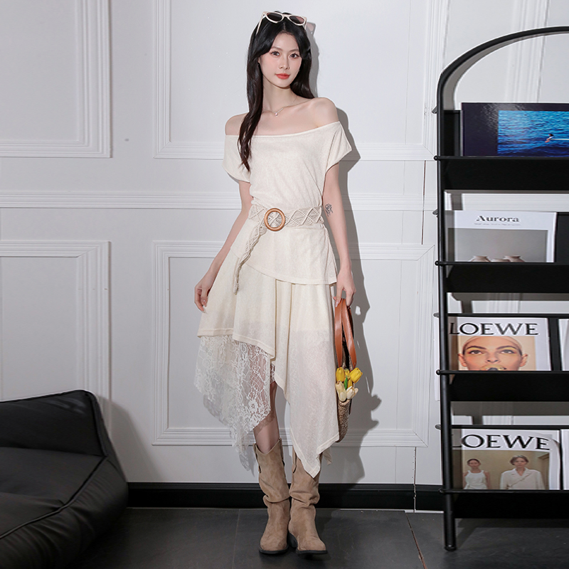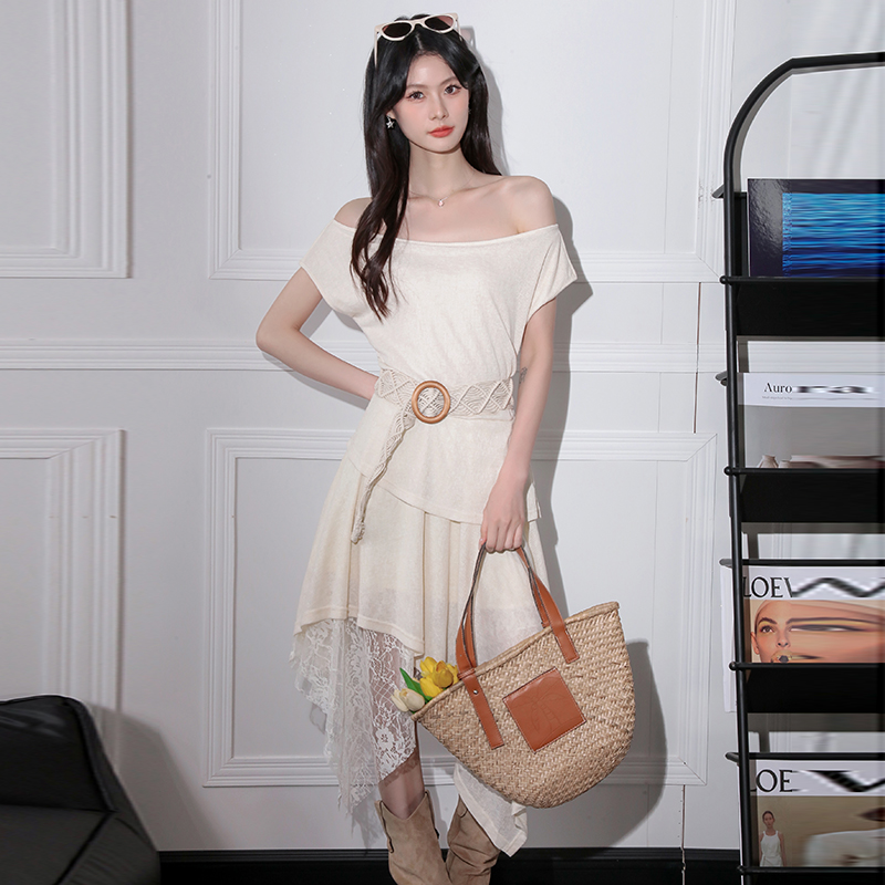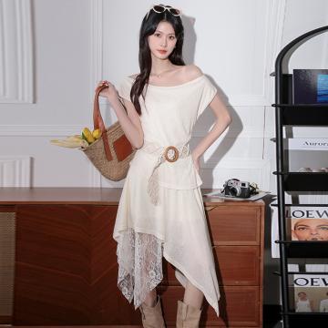BY16442# 新款法式一字领无袖蕾丝拼接连衣裙收腰显瘦气质女 服裝批發女裝批發服飾貨源