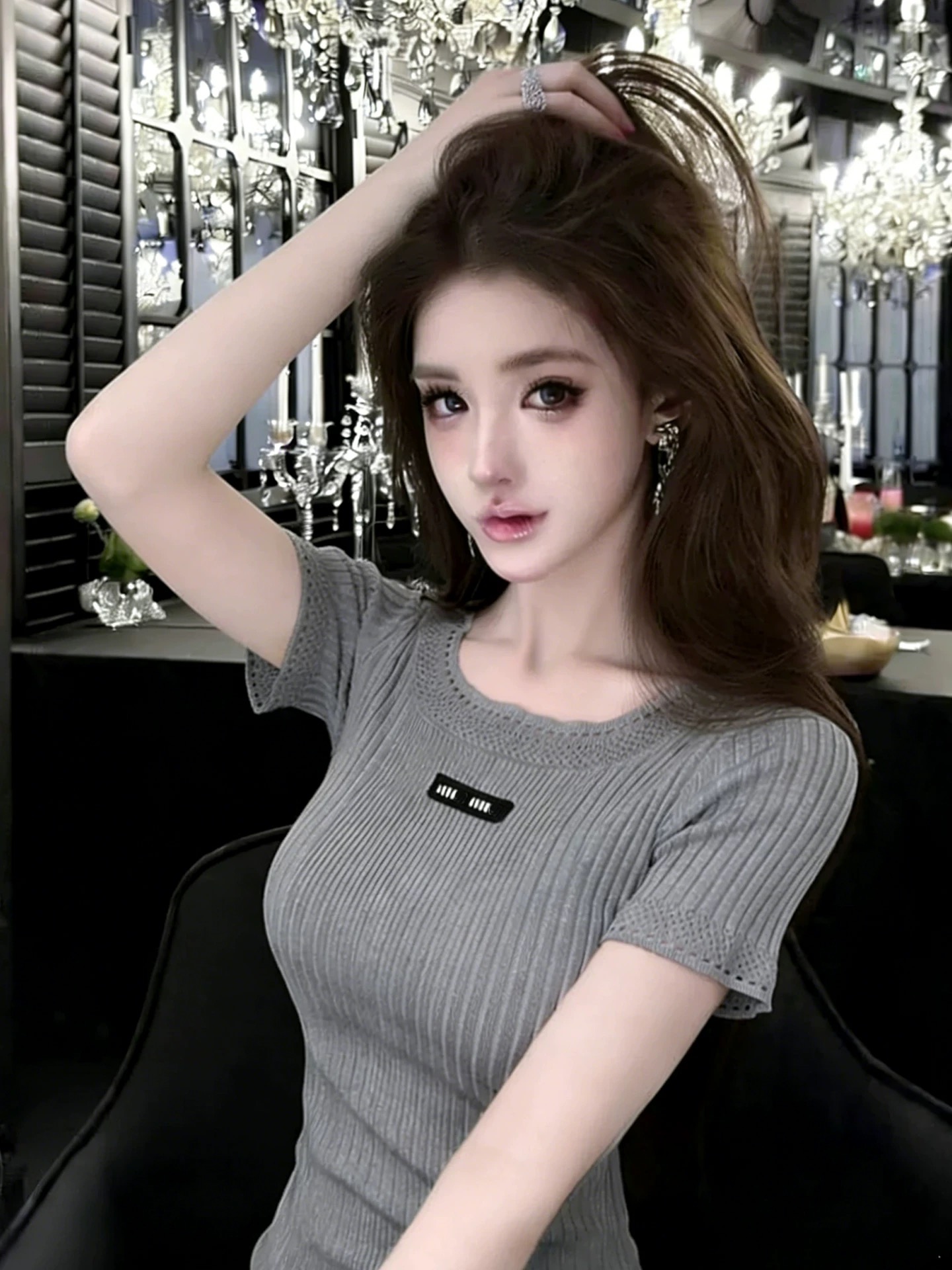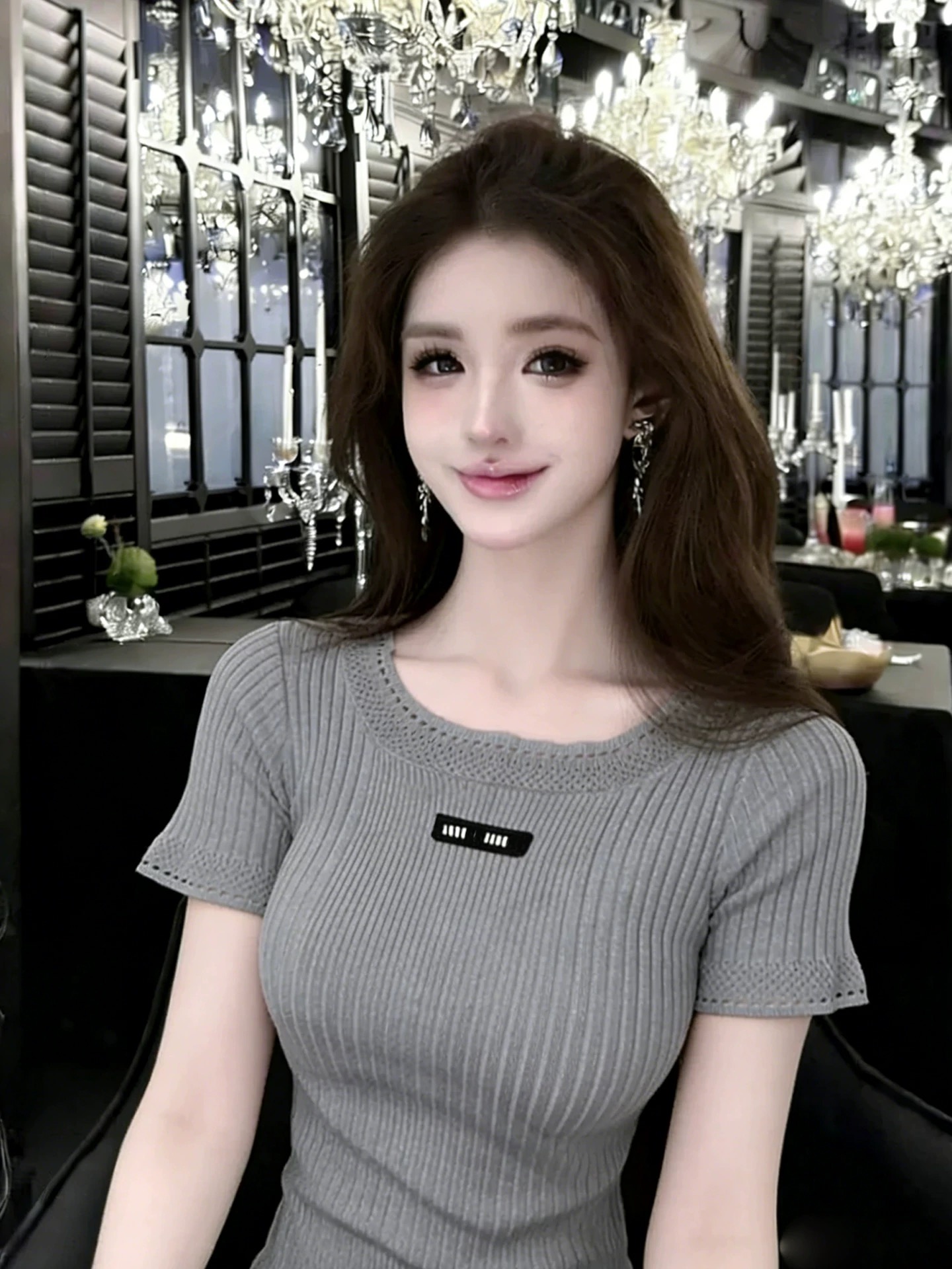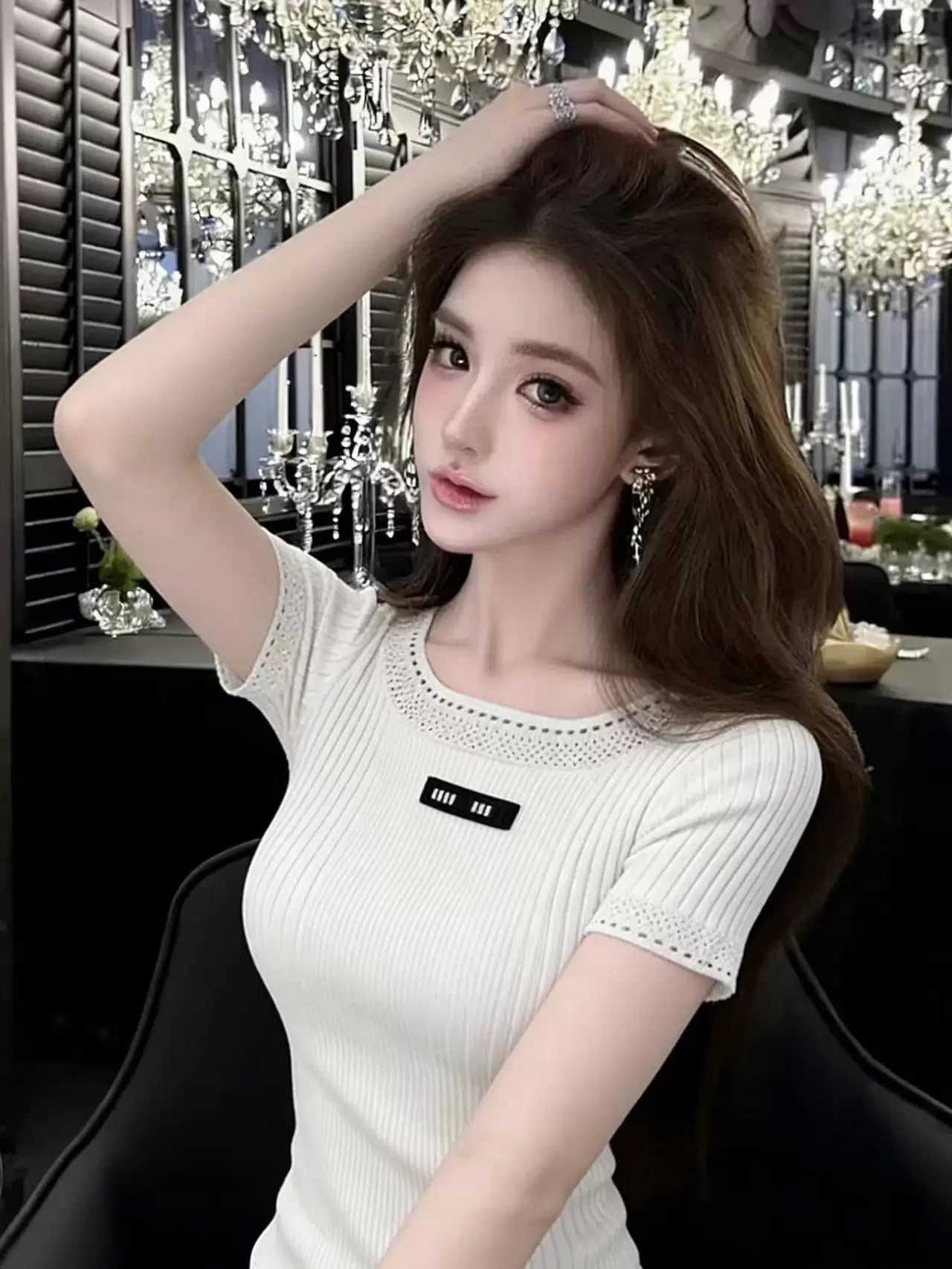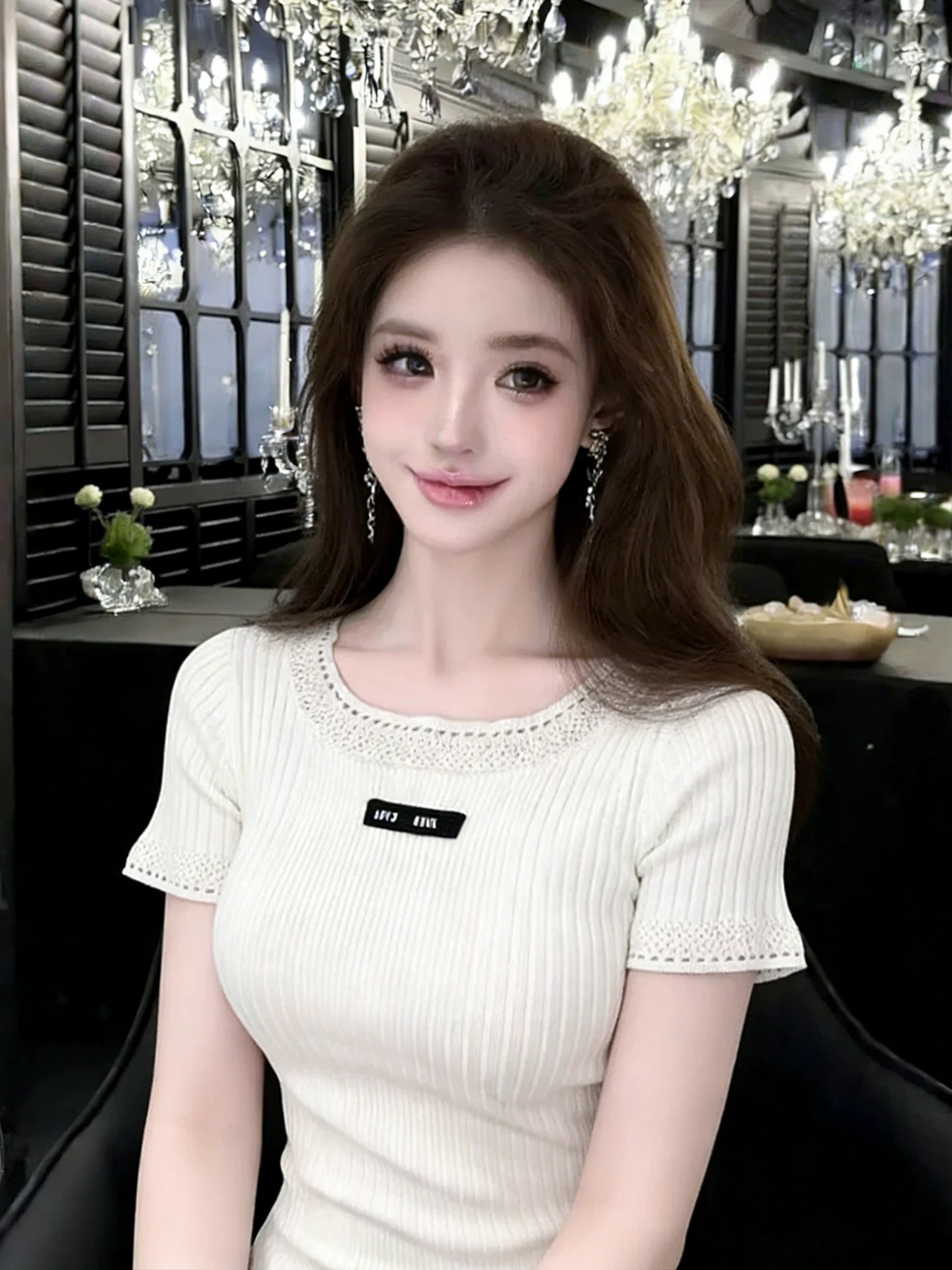 Home > 毛衣、针织衫 > BY16663# 轻熟法式风字母贴布圆领镂空花边短袖针织衫显瘦上衣