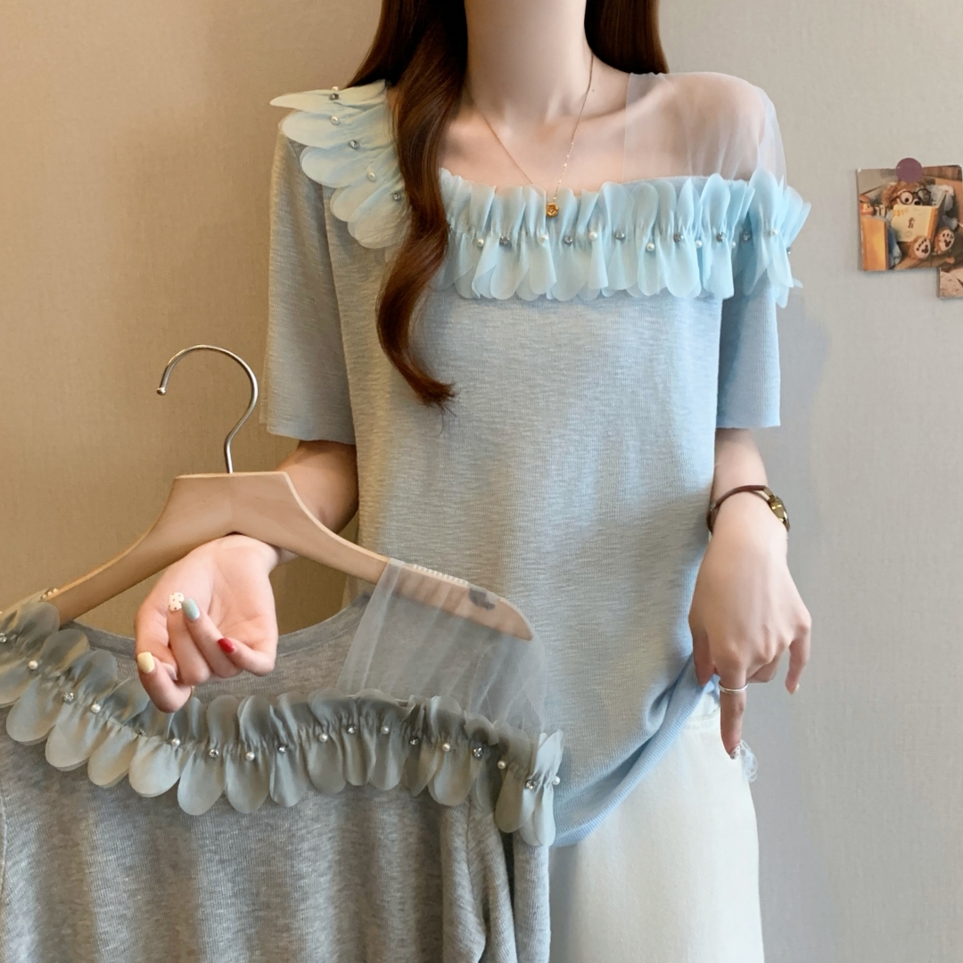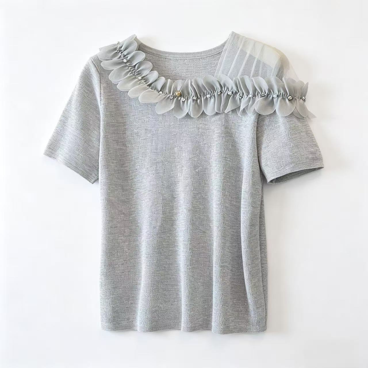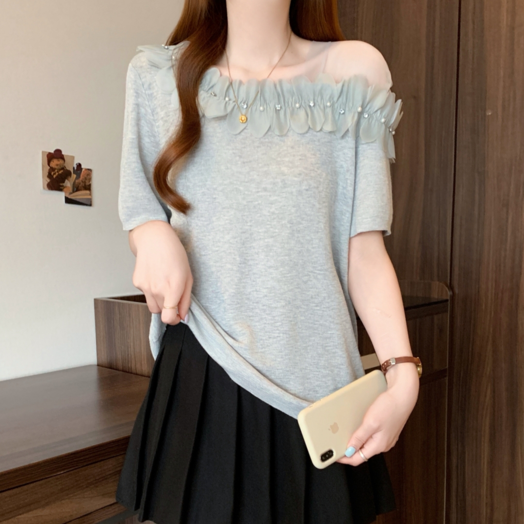 夏装新款大码时尚设计感花朵针织圆领t恤打底衫上衣