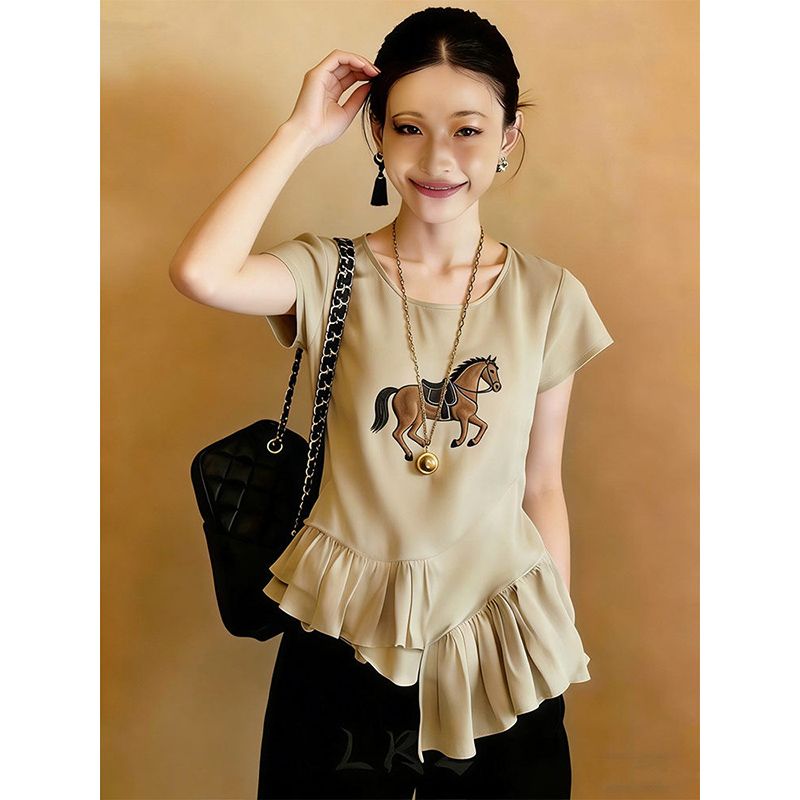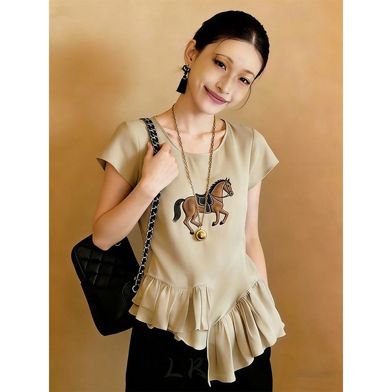 BY16680# 大码不规则设计简约卡其色上衣女夏季新款轻奢百搭小众衬衣