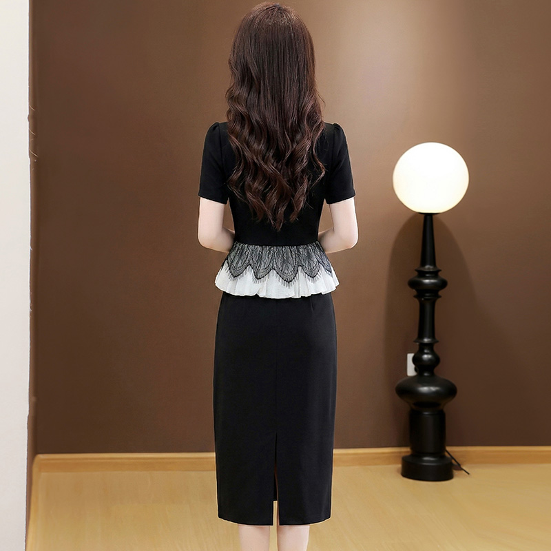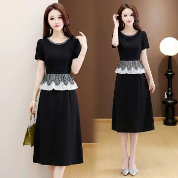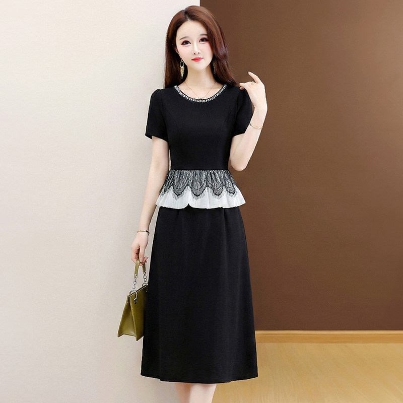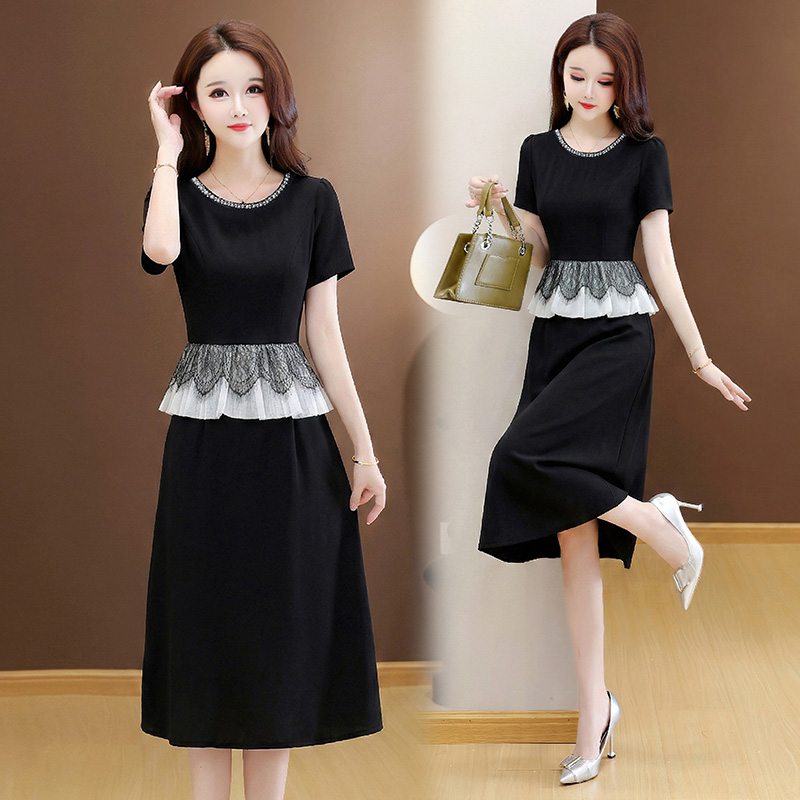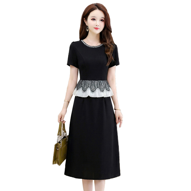 夏季新款大码重工短袖连衣裙收腰显瘦中长款小黑裙