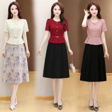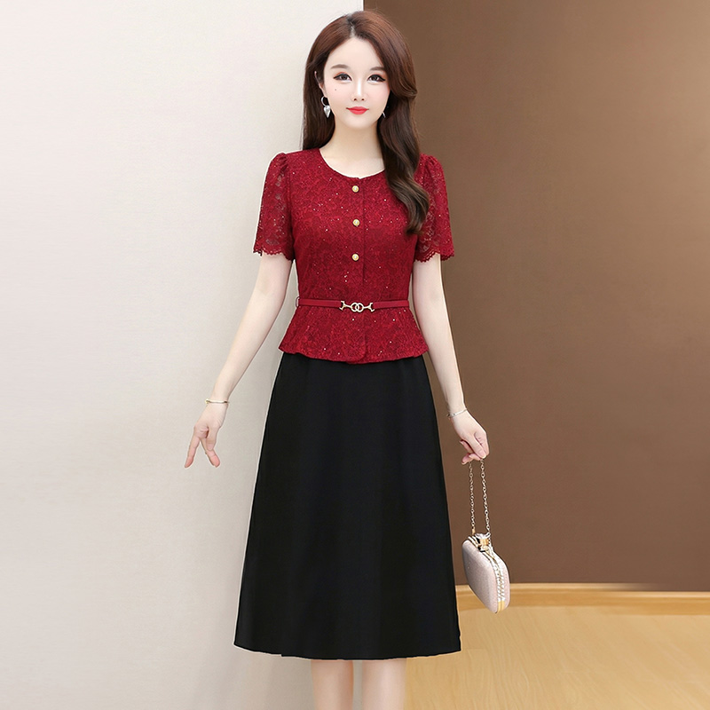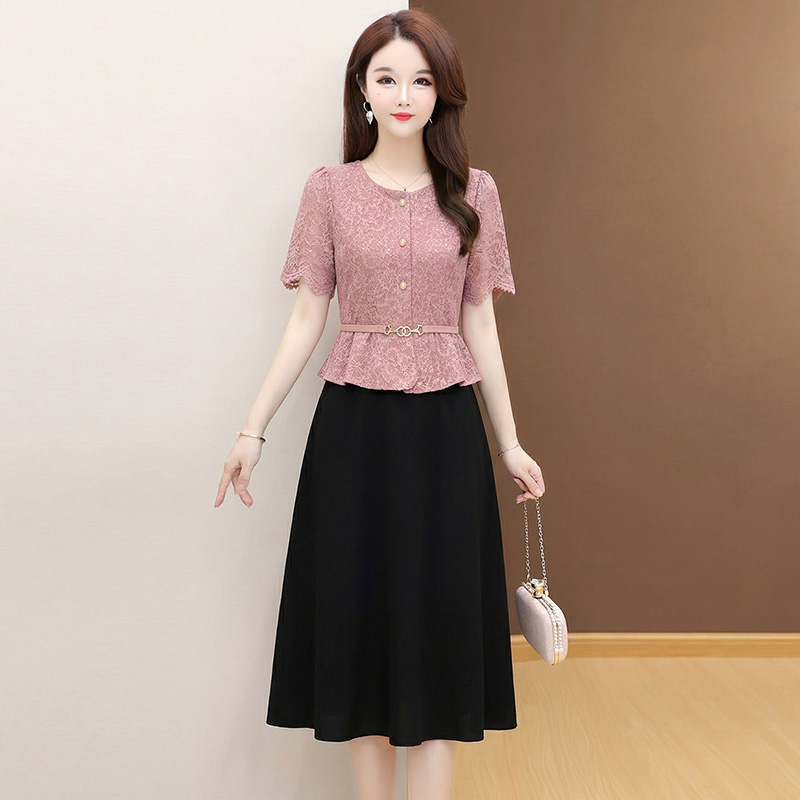 夏季新款大码短袖蕾丝连衣裙收腰显瘦洋气中长款