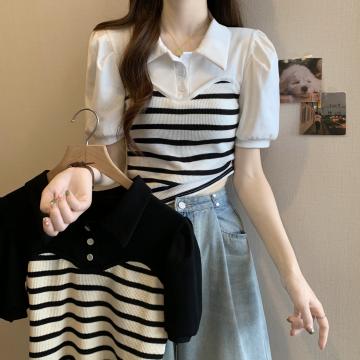 Home > 短袖雪纺衫、衬衫、上衣 > 大码女装夏季新款韩版遮肚显瘦假两件条纹上衣
