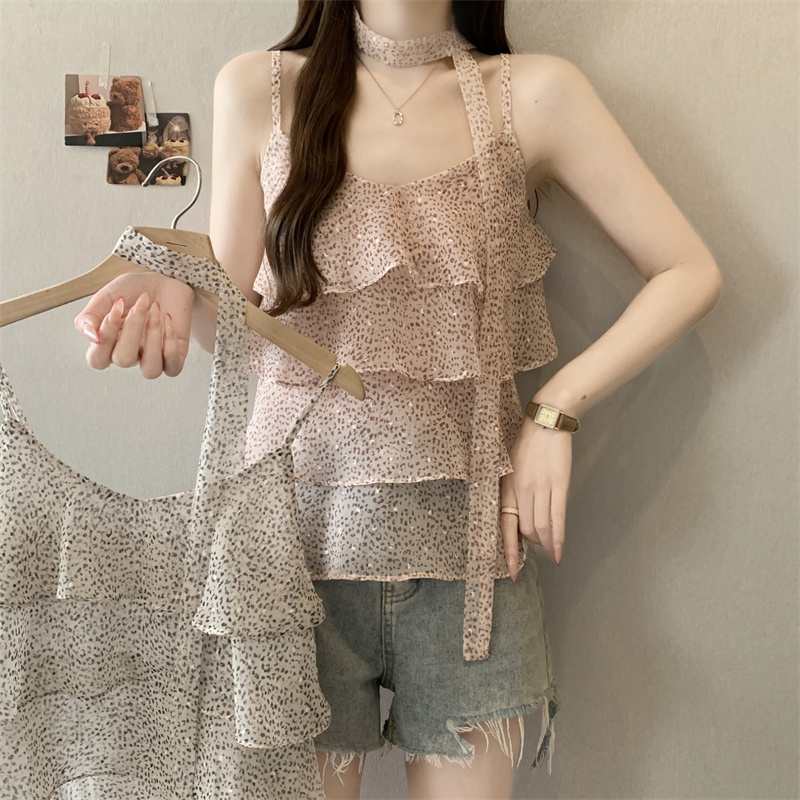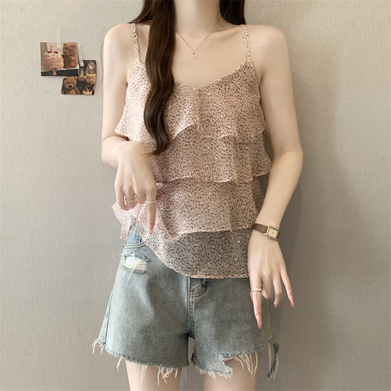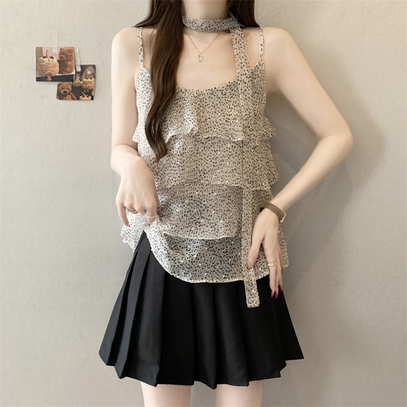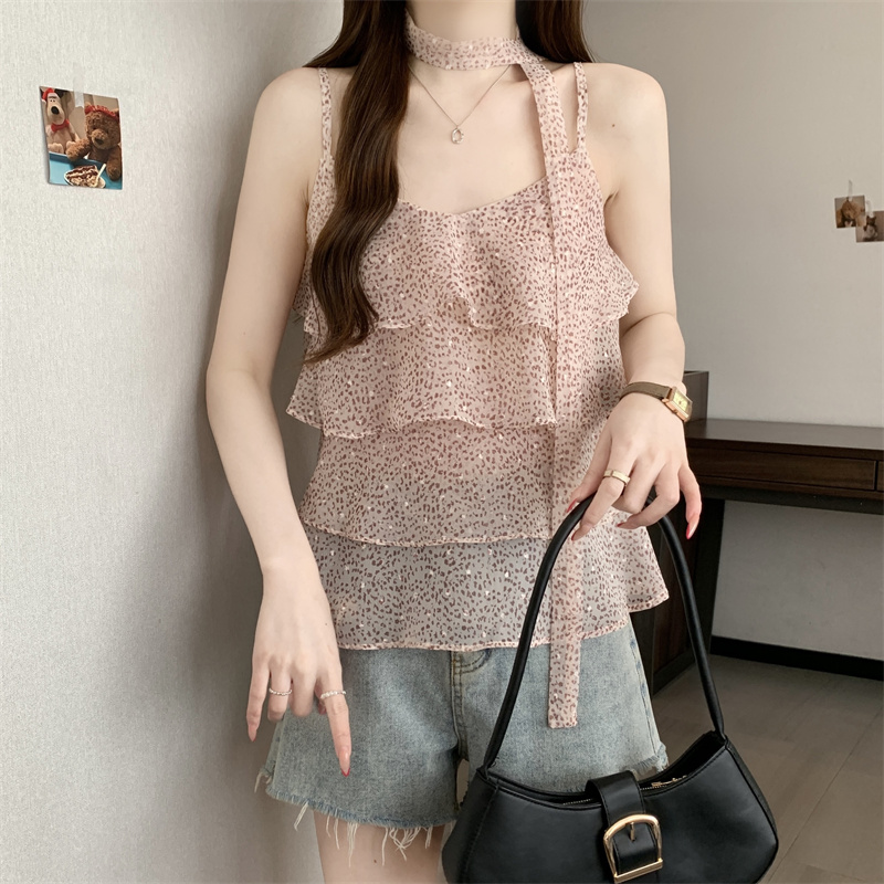 大码新款氛围设计层次感豹纹飘带搭配休闲吊带背心