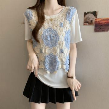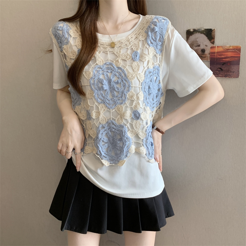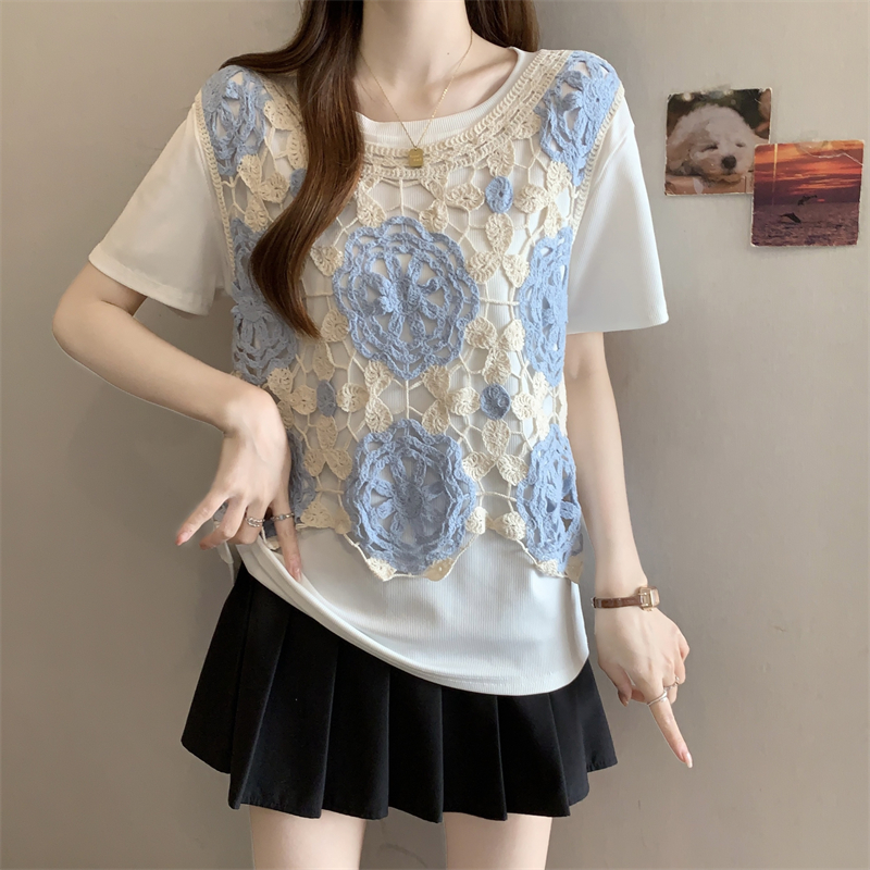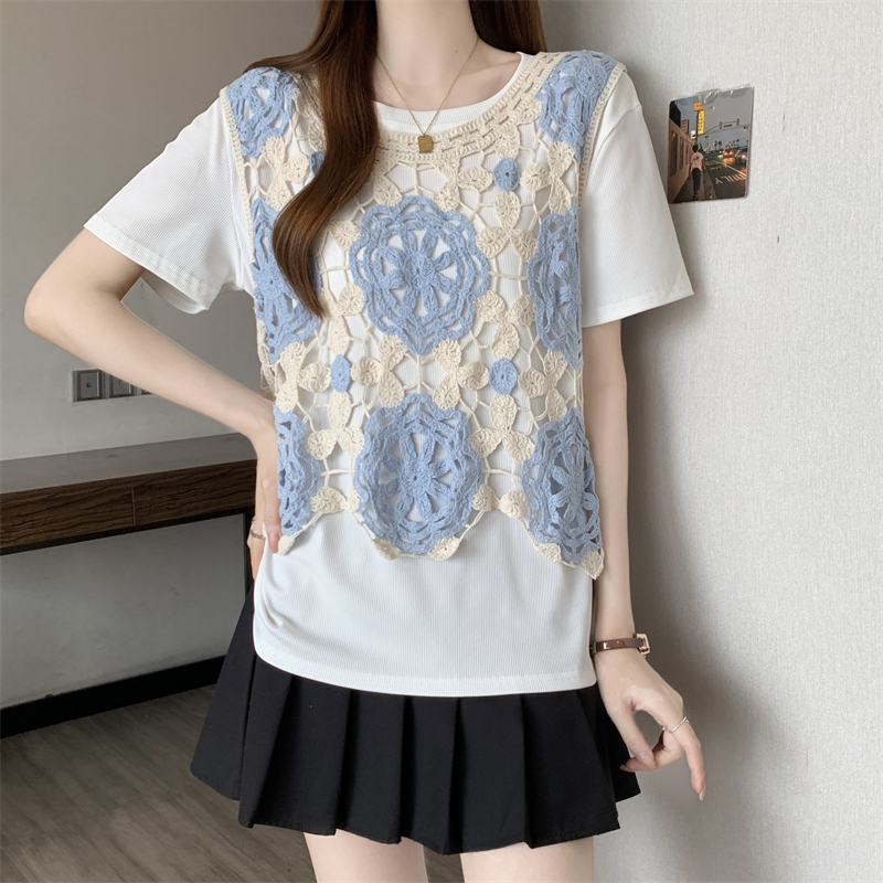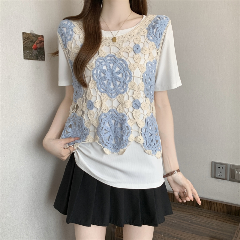 大码胖MM新款多巴胺设计感蓝色镂空马甲+显瘦T恤套装