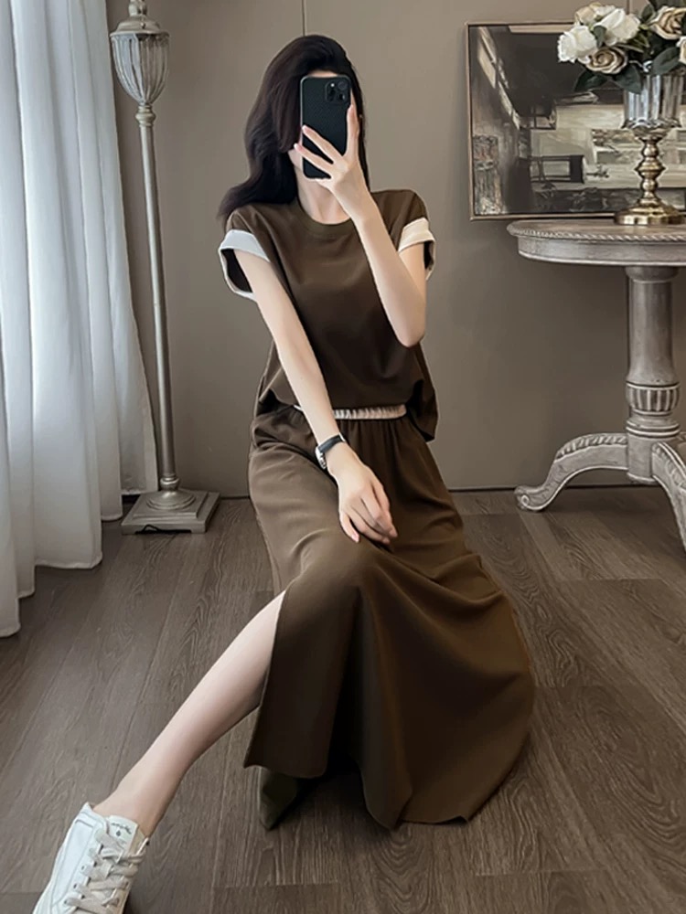 BY17057# 咖色运动休闲套装女夏季时尚韩版气质漂亮短袖开叉半身裙子两件套 服裝批發女裝批發服飾貨源