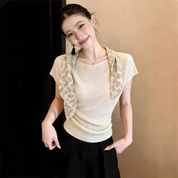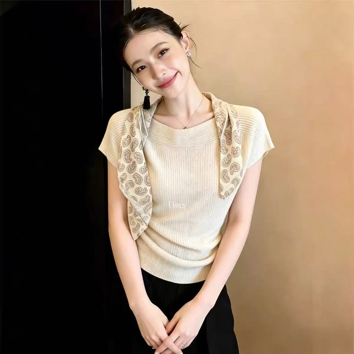 BY17200# 夏季新款韩系简约气质一字领小飞袖设计感短袖针织衫百搭显瘦上衣