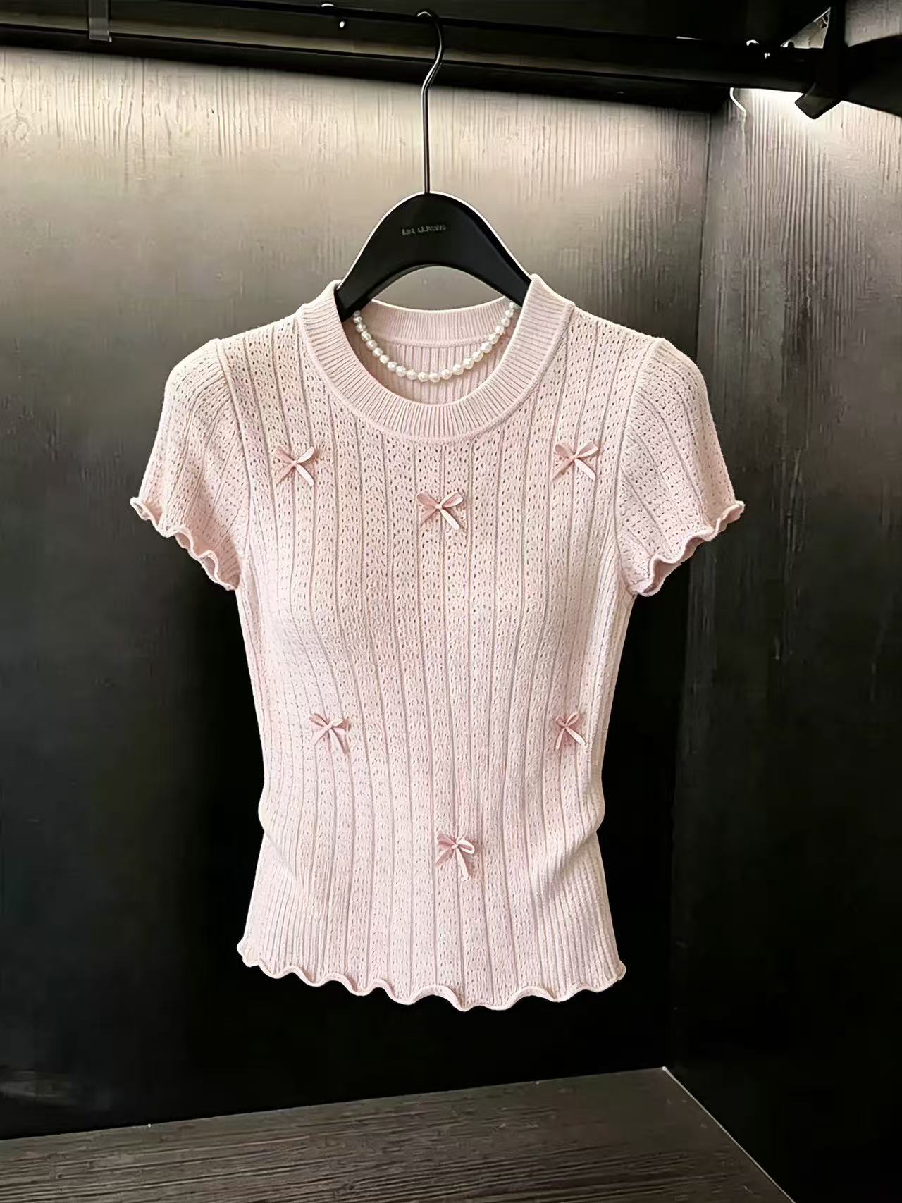 BY17203# 甜美风蝴蝶结修身显瘦粉色冰丝针织衫短袖上衣chic