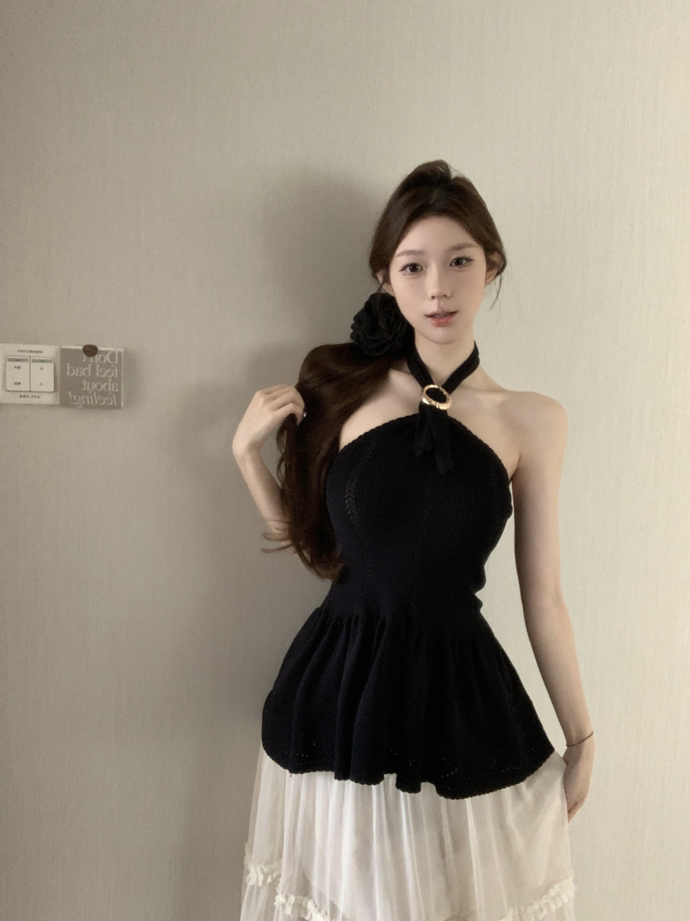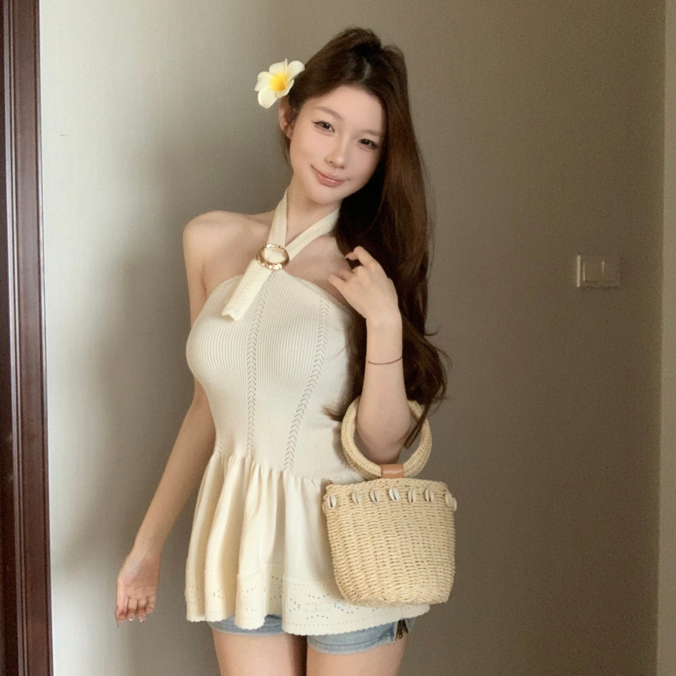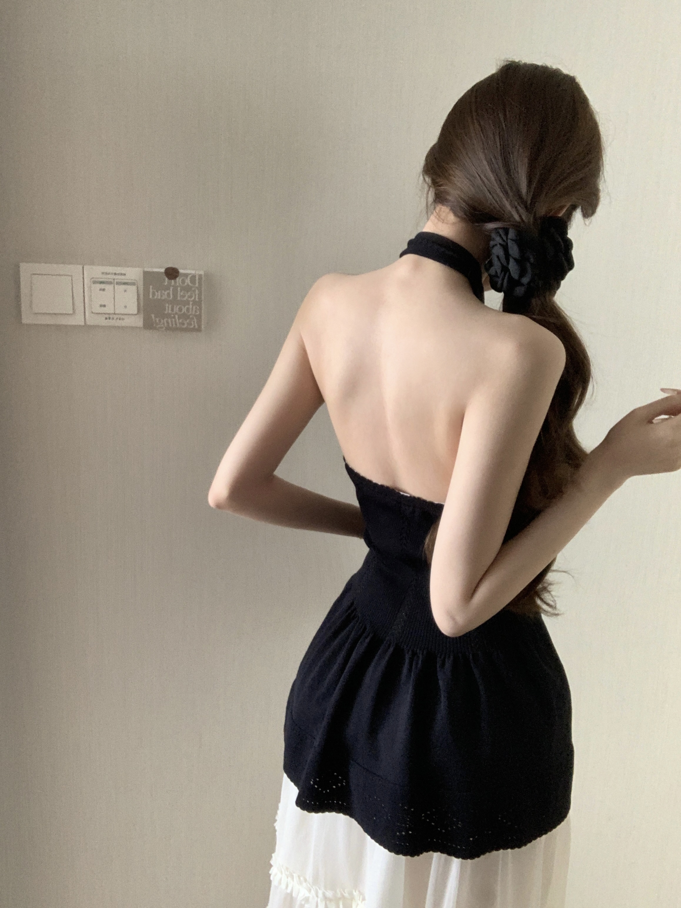 BY17250# 显瘦纸片人小香挂脖露背针织背心矜贵气质上衣