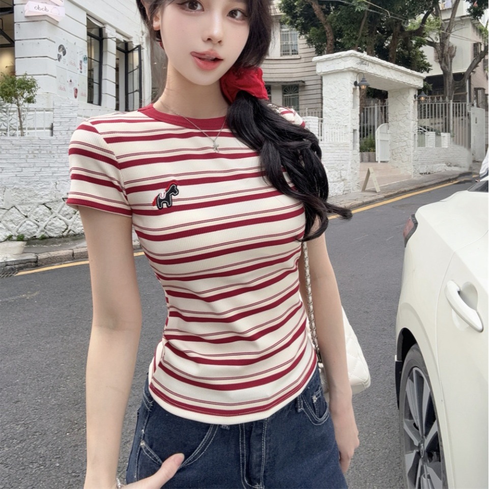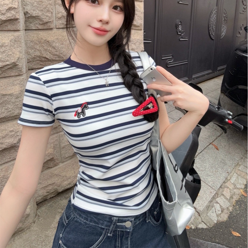 BY17267# 夏季韩版设计感条纹刺绣小马修身显瘦百搭短袖T恤上衣女