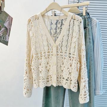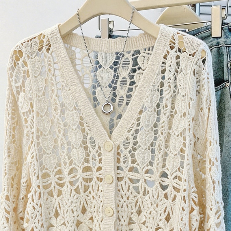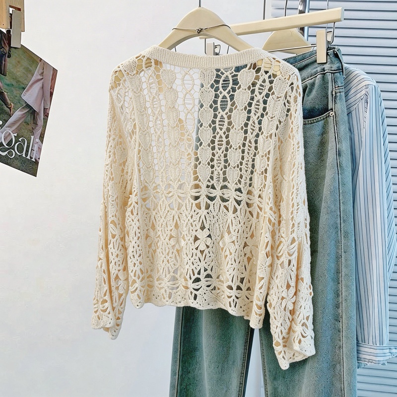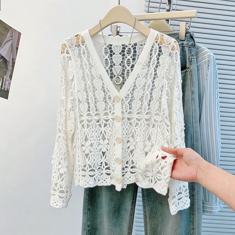 春夏刚需米白镂空V领针织开衫,空调房/防晒都能打,巨显瘦 服裝批發女裝批發服飾貨源