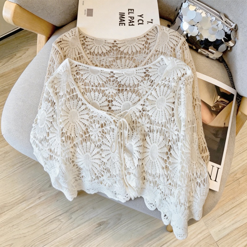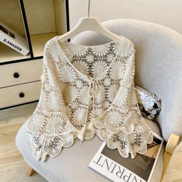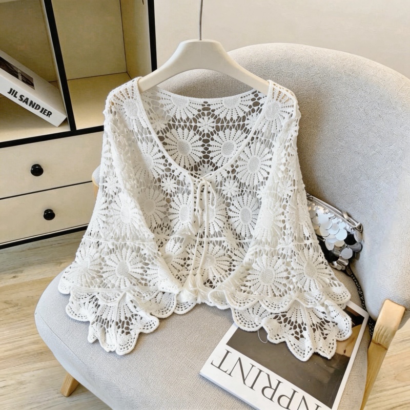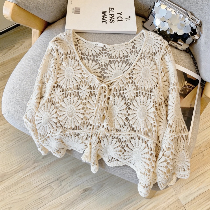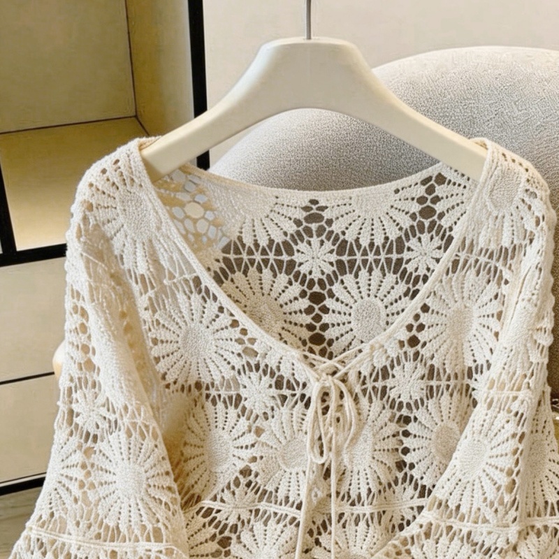 复古镂空钩花防晒罩衫女夏款度假风宽松V领针织衫 服裝批發女裝批發服飾貨源