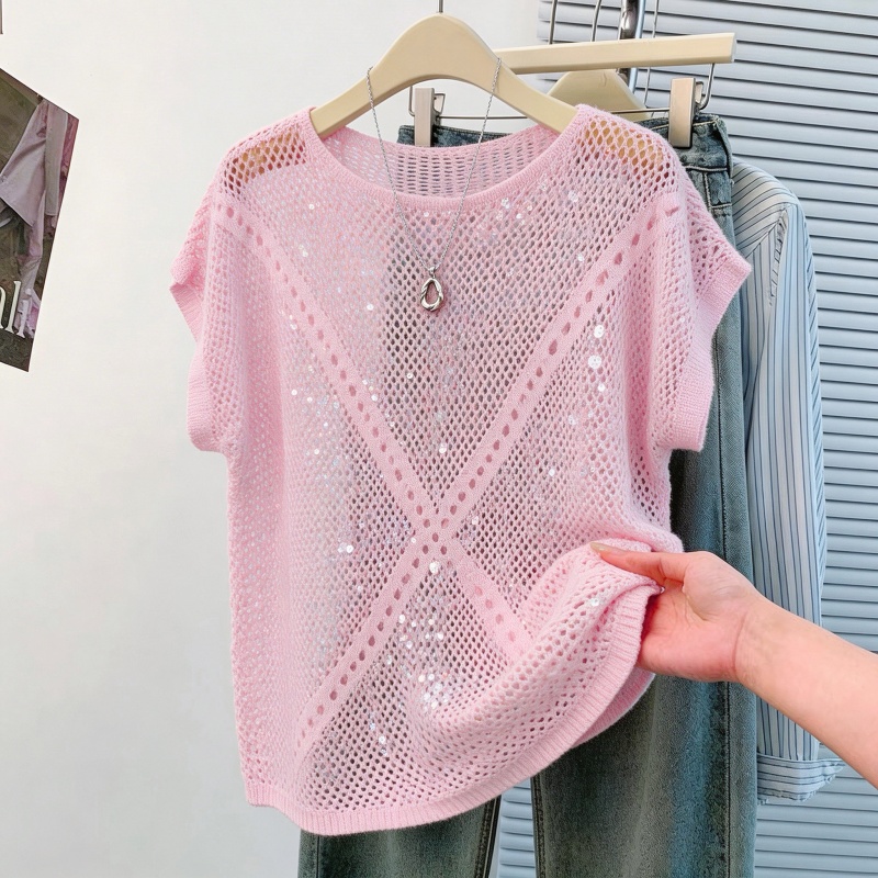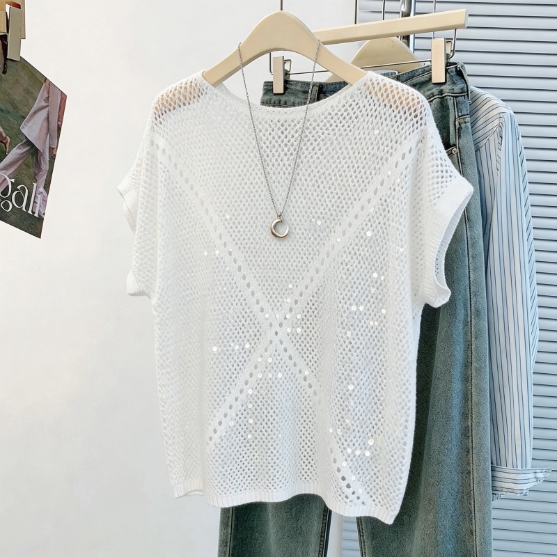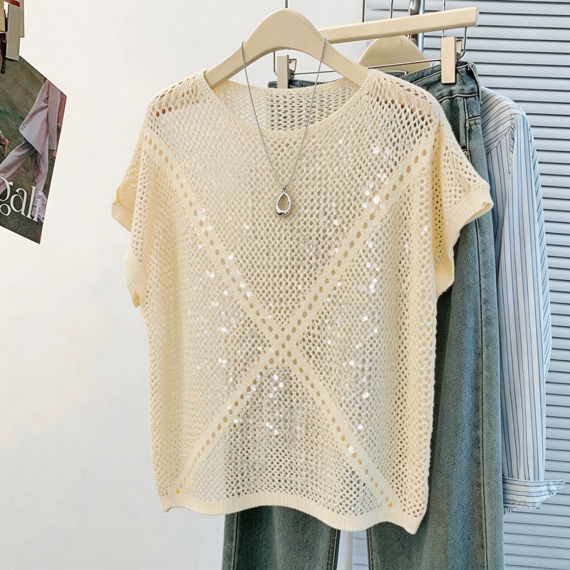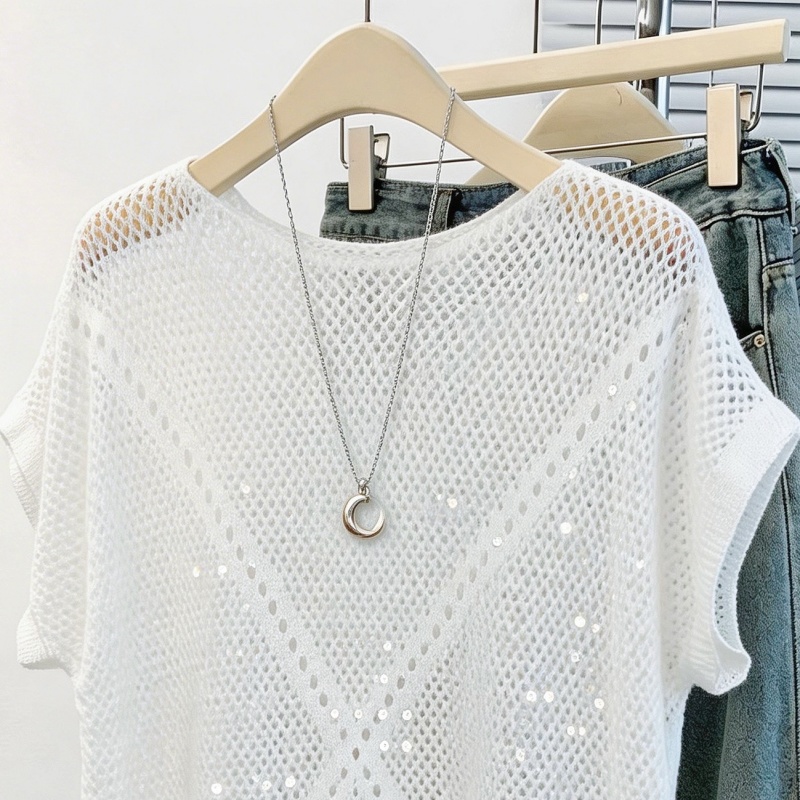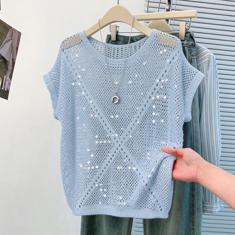 韩系松弛感蓝色亮片镂空针织衫女夏季薄款圆领蝙蝠袖罩衫外搭 服裝批發女裝批發服飾貨源