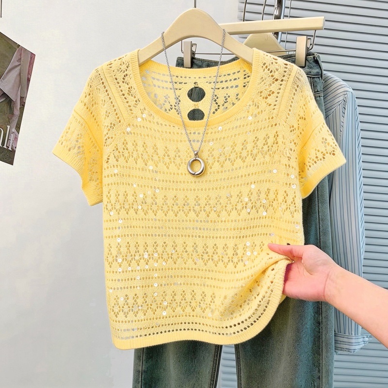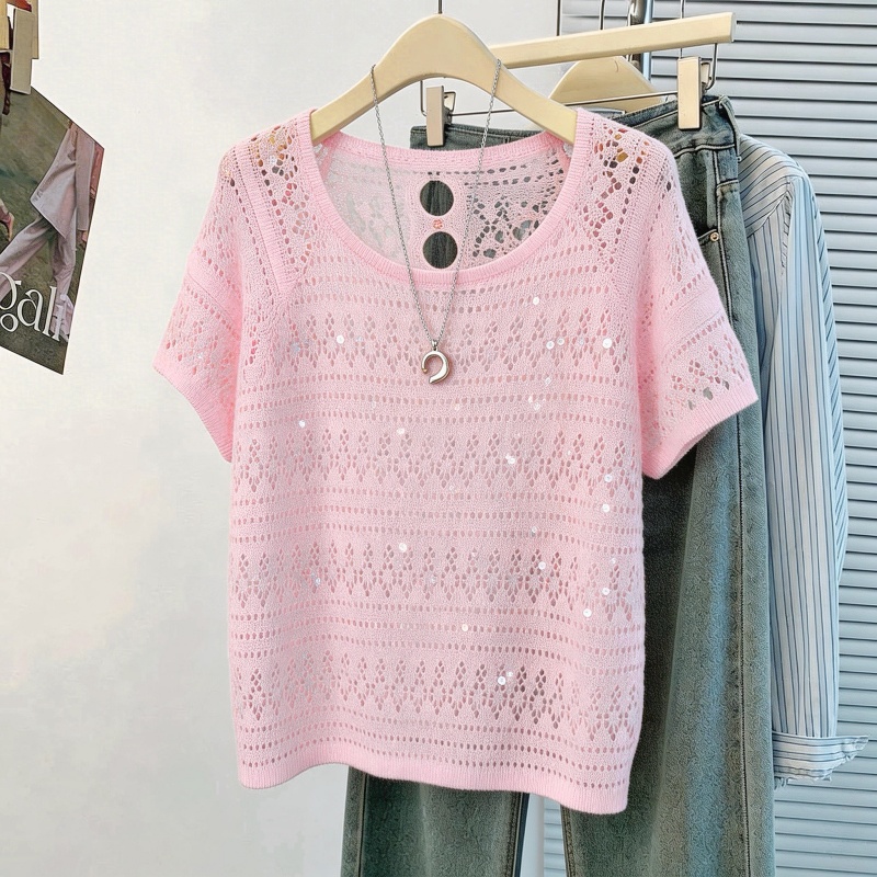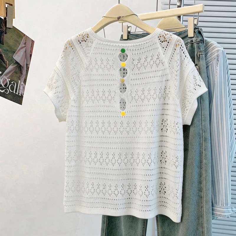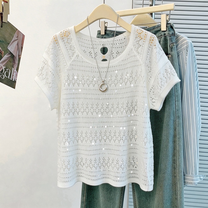 韩系松弛感白色亮片镂空针织衫女夏季薄款圆领蝙蝠袖罩衫外搭 服裝批發女裝批發服飾貨源