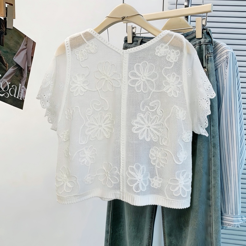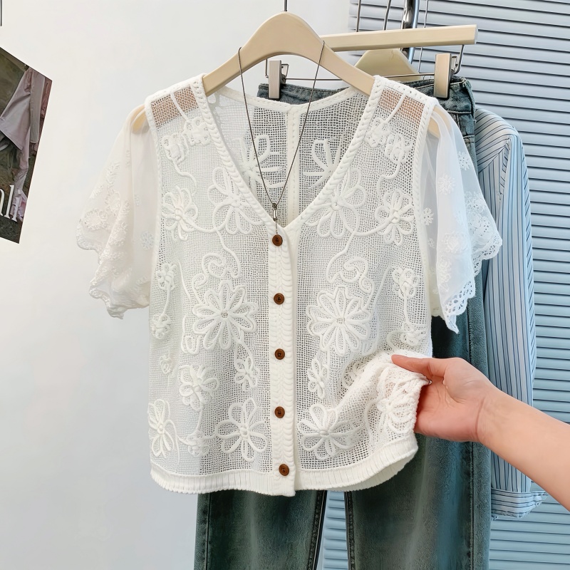 BY17485# 气质名媛风白色蕾丝绣花短袖女夏V领单排扣镂空雪纺开衫外搭 服裝批發女裝批發服飾貨源